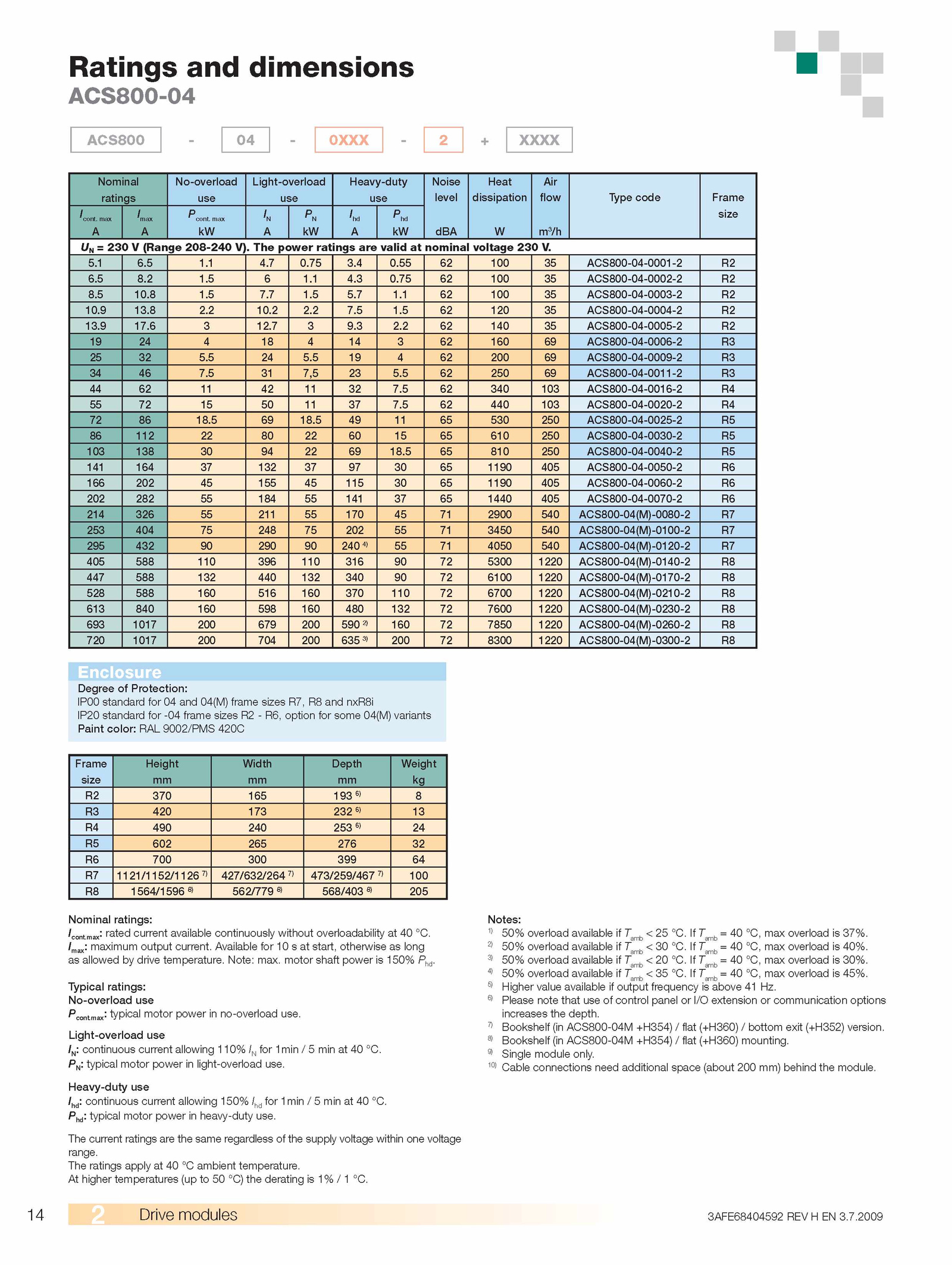 5 5. 8) Bookshelf (in 800-04M 354) flat (+H360) mounting. 5.2 1.5 340 103 800-04-0016-2 R4 55 7. H eavy-duty use ¡hd' continuous current allowing 150% for 1min min °C.8 1. Light-overload use ¡n' continuous current allowing 110% for 1min min °C.amb amb ’ 2) 50% overload available °C.amb amb 3) 50% overload available °C.1 100 800-04-0003-2 R2 10.6 12. 9 Single module only 10) Cable connections need additional space (about 200 mm) behind the module.5 7,5 5.5 5.7 0.2 2.amb amb 4) 50% overload available °C.5 7.1 4.5 1. Typical ratings: N o-overload use Pcontmax' typical motor power no-overload use.75 3. =40 °C,max overloadis 37%. Phd' typical motor power heavy-duty use.7.7 9. 6) Please note that use control panel I/O extension communication options increases the depth.9 13. The ratings apply ambient temperature. max kW In A P n kW Ihd A Phd kW dBA m3/h size U tin lid lta V. =40 °C,max overloadis 30%.5 200 800-04-0009-2 R3 34 7. 14 Drive modules FE68404592 REV 3.Ratings and dimensions ACS800-04 ACS800 0XXX XXXX Nominal ratings No-overload use Light-overload use Heavy-duty use Noise level Heat dissipation Air flow Type code Fram e A A P cont.2 10. At higher temperatures (up °C) the derating °C.75 100 800-04-0002-2 R2 8. P typical motor power light-overload use.1 4. 7 Bookshelf (in 800-04M 354) flat (+H360) bottom exit (+H352) version. =40 °C,max overloadis 45%.55 100 800-04-0001-2 R2 6.5 120 800-04-0004-2 R2 13.max: rated current available continuously without overloadability °C.5 530 250 800-04-0025-2 R5 86 112 610 250 800-04-0030-2 R5 103 138 18. Note: max.5 440 103 800-04-0020-2 R4 72 18.amb amb 5) Higher value available output frequency above Hz.5 8.5 10.2 140 800-04-0005-2 R2 19 160 800-04-0006-2 R3 25 5.8 2. Available for start, otherwise long as allowed drive temperature. =40 °C,max overloadis 40%.5 250 800-04-0011-2 R3 44 7. The current ratings are the same regardless the supply voltage within one voltage range.7 1.2 7.2009 .5 1. Notes: 1) 50% overload available °C. ¡max'- maximum output current.4 0.1 6.5 1.5 810 250 800-04-0040-2 R5 141 164 132 1190 405 800-04-0050-2 R6 166 202 155 115 1190 405 800-04-0060-2 R6 202 282 184 141 1440 405 800-04-0070-2 R6 214 326 211 170 2900 540 S800-04(M )-0080-2 R7 253 404 248 202 3450 540 S800-04(M )-0100-2 R7 295 432 290 240 4050 540 S800-04(M )-0120-2 R7 405 588 110 396 110 316 5300 1220 S800-04(M )-0140-2 R8 447 588 132 440 132 340 6100 1220 S800-04(M )-0170-2 R8 528 588 160 516 160 370 110 6700 1220 S800-04(M )-0210-2 R8 613 840 160 598 160 480 132 7600 1220 S800-04(M )-0230-2 R8 693 1017 200 679 200 590 160 7850 1220 S800-04(M )-0260-2 R8 720 1017 200 704 200 635 200 8300 1220 S800-04(M )-0300-2 R8 Enclosure Degree Protection: IP00 standard for and 04(M) frame sizes R7, and nxR8i IP20 standard for -04 frame sizes R6, option for some 04(M) variants Paint color: RAL 900 2/P 420C Frame size Height mm W idth mm Depth mm W eight kg R2 370 165 193 8 R3 420 173 232 13 R4 490 240 253 24 R5 602 265 276 32 R6 700 300 399 64 R7 100 R8 205 Nom inal ratings: Icont.7 1.3 2. motor shaft power 150% Phd.9 17.3 0.5 18