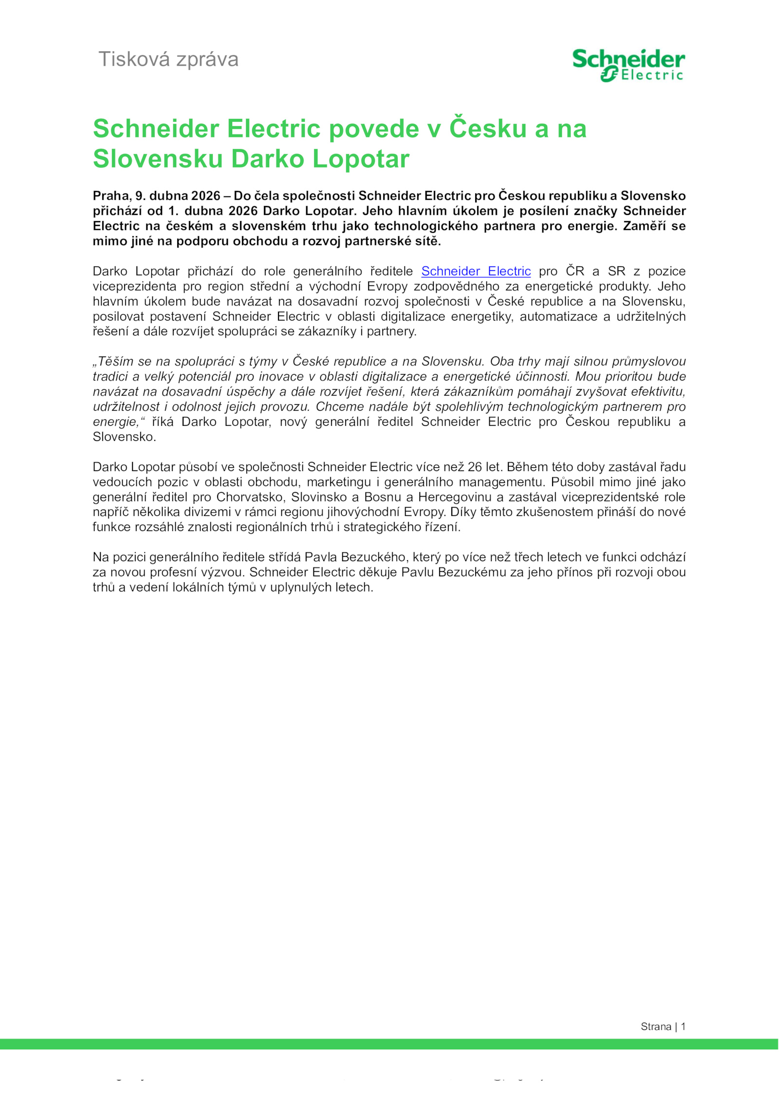 energie,“ říká Darko Lopotar, nový generální ředitel Schneider Electric pro Českou republiku a