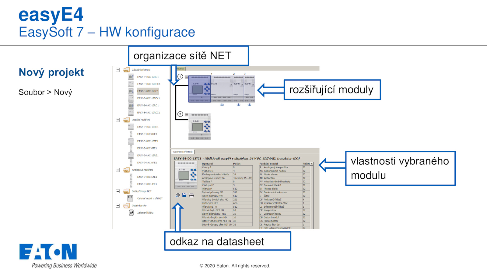 easyE4 EasySoft konfigurace Nový projekt Soubor Nový odkaz datasheet organizace sítě NET rozšiřující moduly vlastnosti vybraného modulu ..2020 Eaton. All rights reserved