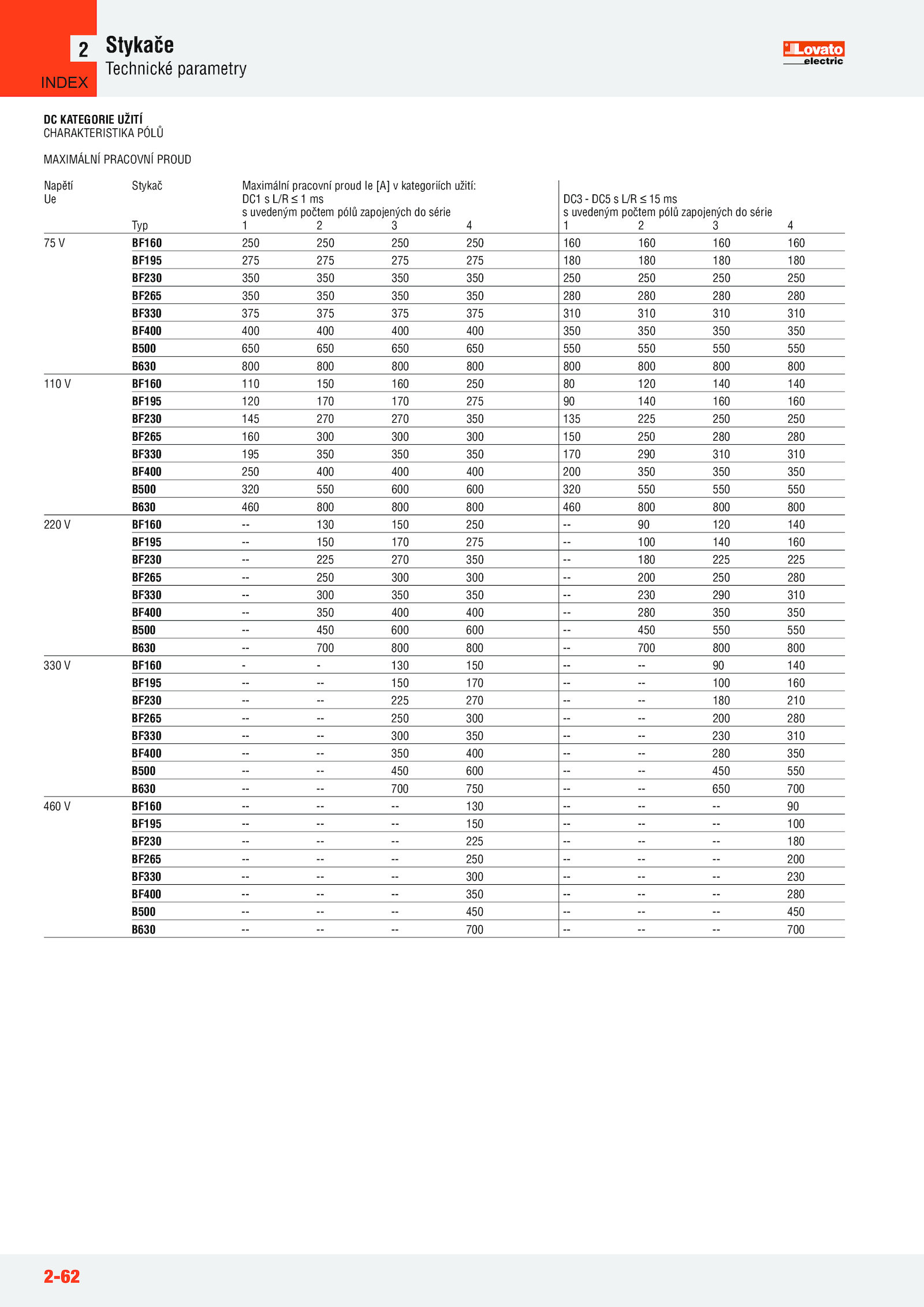 2-62 Stykače Technické parametry 2 Napětí Ue Stykač Maximální pracovní proud [A] kategoriích užití: DC1 L/R ms s uvedeným počtem pólů zapojených série DC3 DC5 L/R ms s uvedeným počtem pólů zapojených série Typ 4 75 BF160 250 250 250 250 160 160 160 160 BF195 275 275 275 275 180 180 180 180 BF230 350 350 350 350 250 250 250 250 BF265 350 350 350 350 280 280 280 280 BF330 375 375 375 375 310 310 310 310 BF400 400 400 400 400 350 350 350 350 B500 650 650 650 650 550 550 550 550 B630 800 800 800 800 800 800 800 800 110 BF160 110 150 160 250 120 140 140 BF195 120 170 170 275 140 160 160 BF230 145 270 270 350 135 225 250 250 BF265 160 300 300 300 150 250 280 280 BF330 195 350 350 350 170 290 310 310 BF400 250 400 400 400 200 350 350 350 B500 320 550 600 600 320 550 550 550 B630 460 800 800 800 460 800 800 800 220 BF160 130 150 250 120 140 BF195 150 170 275 100 140 160 BF230 225 270 350 180 225 225 BF265 250 300 300 200 250 280 BF330 300 350 350 230 290 310 BF400 350 400 400 280 350 350 B500 450 600 600 450 550 550 B630 700 800 800 700 800 800 330 BF160 130 150 140 BF195 150 170 100 160 BF230 225 270 180 210 BF265 250 300 200 280 BF330 300 350 230 310 BF400 350 400 280 350 B500 450 600 450 550 B630 700 750 650 700 460 BF160 130 90 BF195 150 100 BF230 225 180 BF265 250 200 BF330 300 230 BF400 350 280 B500 450 450 B630 700 700 DC KATEGORIE UŽITÍ CHARAKTERISTIKA PÓLŮ MAXIMÁLNÍ PRACOVNÍ PROUD INDEX
