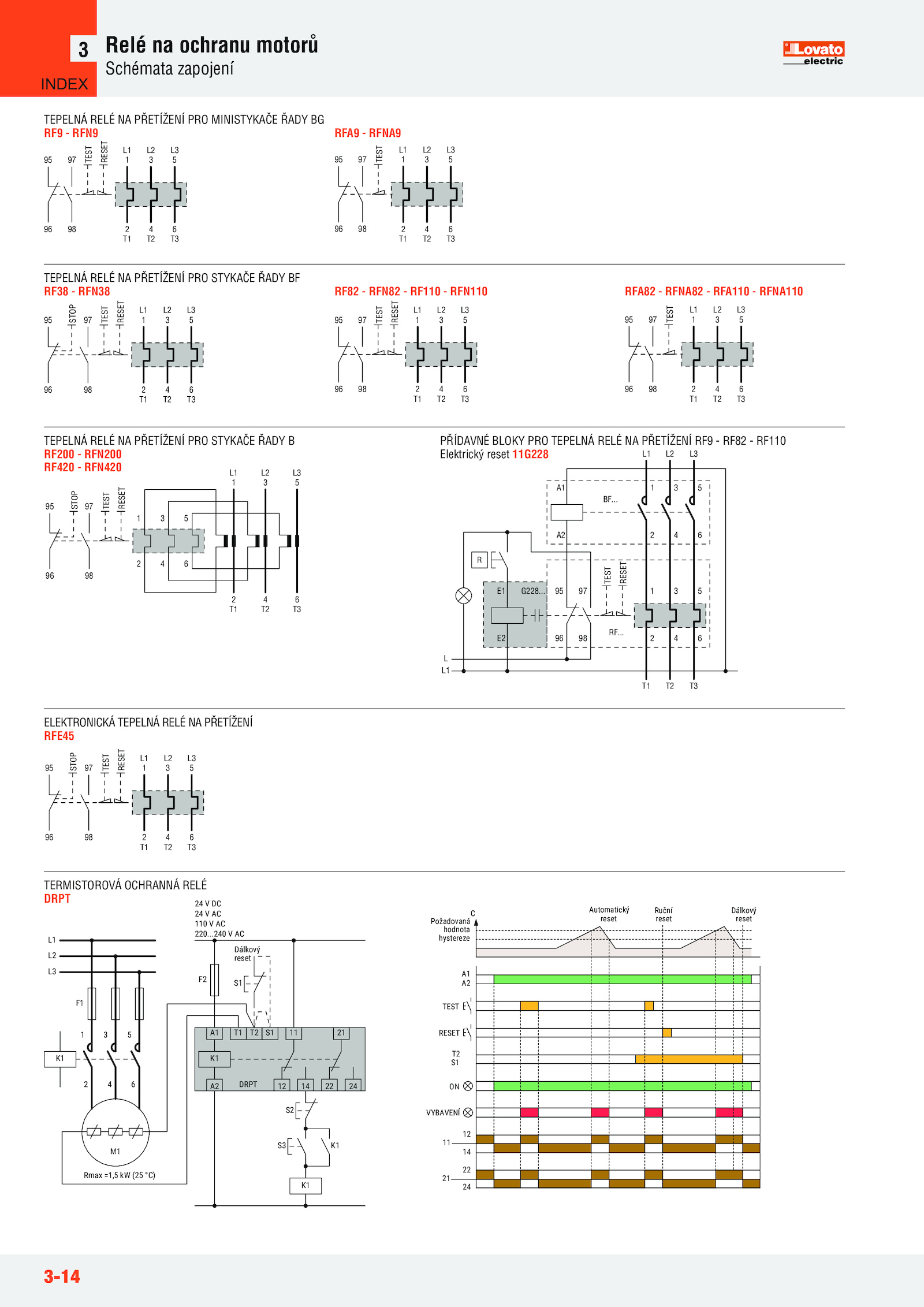 ..3-14 Relé ochranu motorů Schémata zapojení 3 A1 A2 TEST RESET T2 S1 ON VYBAVENÍ 11 12 14 24 22 21 hodnota hystereze Ruční reset Automatický Dálkový reset reset C Požadovaná Rmax =1,5 (25 °C) 1 3 2 K1 M1 4 5 6 K1 K1 24 DC 24 AC 110 AC 220. G228.. PŘÍDAVNÉ BLOKY PRO TEPELNÁ RELÉ PŘETÍŽENÍ RF9 RF82 RF110 Elektrický reset 11G228 RF82 RFN82 RF110 RFN110 1 5 L1 L3 T1 T3 2 6 95 96 97 TEST 98 RFA82 RFNA82 RFA110 RFNA110 95 1 5 1 5 L1 L3 T1 T3 2 6 2 6 96 TEST RESET 97 98 STOP TEPELNÁ RELÉ PŘETÍŽENÍ PRO STYKAČE ŘADY B RF200 RFN200 RF420 RFN420 95 96 TEST RESET 1 5 L1 L3 T1 T3 2 6 97 98 STOP ELEKTRONICKÁ TEPELNÁ RELÉ PŘETÍŽENÍ RFE45 INDEX . RF......240 AC DRPT A1 L3 L2 L1 T1 S1 S1 F2 F1 11 21 A2 24 S2 S3 K1 Dálkový reset TERMISTOROVÁ OCHRANNÁ RELÉ DRPT 95 96 97 TEST RESET 1 5 L1 L3 T1 T3 2 6 98 1 5 L1 L3 T1 T3 2 6 95 96 97 TEST 98 TEPELNÁ RELÉ PŘETÍŽENÍ PRO MINISTYKAČE ŘADY BG RF9 RFN9 RFA9 RFNA9 95 96 TEST RESET 1 5 L1 L3 T1 T3 2 6 97 98 STOP 95 96 97 TEST RESET 1 5 L1 L3 T1 T3 2 6 98 TEPELNÁ RELÉ PŘETÍŽENÍ PRO STYKAČE ŘADY BF RF38 RFN38 95 96 97 TEST RESET 1 5 T1 T3 2 6 98 1 A1 3 2 A2 4 5 6 L1 L3 E1 R L L1 E2 BF