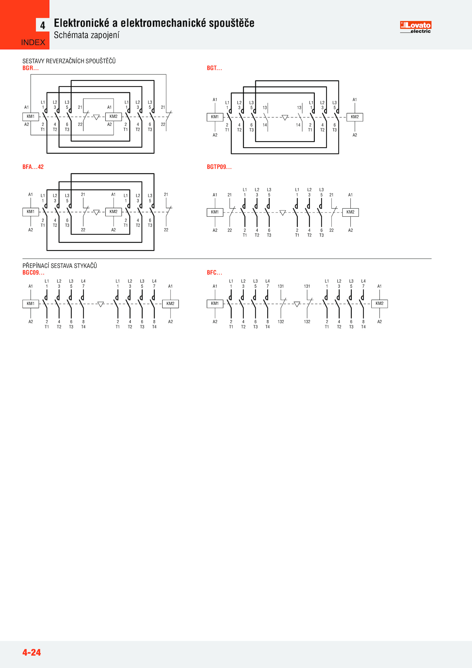 INDEX . 1 A1 3 2 A2 A1 A2 4 5 13 6 14 13 14 L1 1 L1 L2 3 L2 L3 5 L3 T1 T3 2 6 T1 T3 KM1 KM2 BGT. 1 A1 3 2 A2 A1 A2 4 5 6 8 L1 3 L2 L2 5 L3 L3 7 L4 T1 T3 4 8 T2 T4 7 L4 T4 KM1 1 L1 2 T1 KM2 131 132 131 132 BFC..42 1 A1 3 2 A2 A1 A2 4 5 21 6 22 21 22 L1 1 L1 L2 3 L2 L3 5 L3 T1 T3 2 6 T1 T3 KM1 KM2 BGTP09..4-24 Elektronické elektromechanické spouštěče Schémata zapojení 4 SESTAVY REVERZAČNÍCH SPOUŠTĚČŮ 1 A1 3 2 A2 A1 A2 4 5 21 6 22 21 22 L1 1 L1 L2 3 L2 L3 5 L3 T1 T3 2 6 T1 T3 KM1 KM2 BGR...... 1 A1 3 2 A2 A1 A2 4 5 21 6 22 21 22 L1 1 L1 L2 3 L2 L3 5 L3 T1 T3 2 6 T1 T3 KM1 KM2 BFA... 1 A1 3 2 A2 A1 A2 4 5 6 8 L1 3 L2 L2 5 L3 L3 7 L4 T1 T3 4 8 T2 T4 7 L4 T4 KM1 1 L1 2 T1 KM2 PŘEPÍNACÍ SESTAVA STYKAČŮ BGC09...