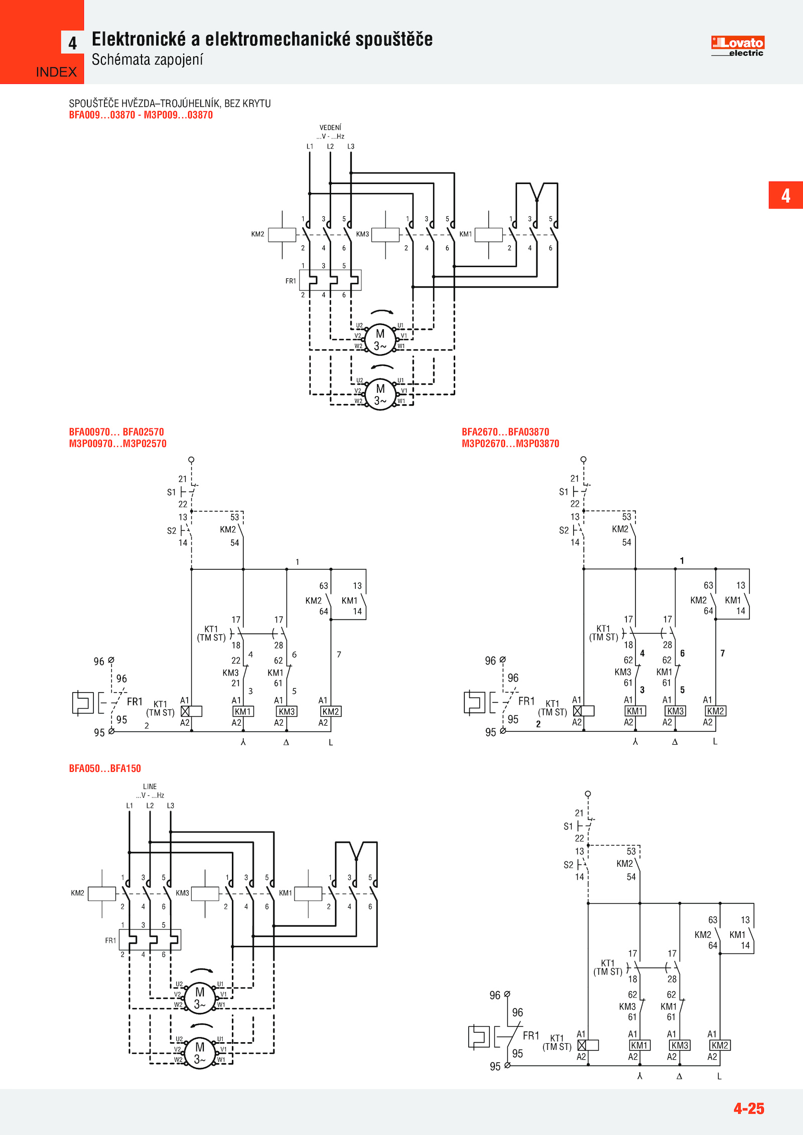 .......V ...4 4-25 Elektronické elektromechanické spouštěče Schémata zapojení 4 3 5 4 6 0970..002570 21 22 13 14 53 54 63 64 17 18 22 21 62 61 A1 A2 A1 A2 A1 A2 A1 A2 17 1 2 3 4 5 6 7 28 13 14 KM2 S1 S2 KM2 KM3 KM1 KM1 KM1 KT1 (TM ST) KT1 (TM ST) KM3 KM2 FR1 96 95 96 95 L 1 KM2 KM3 KM1 3 2 4 5 6 1 3 2 4 5 6 L1 1 L2 3 L3 5 2 6 1 5 2 6 FR1 LINE .DYF80 21 22 13 14 53 54 63 64 17 18 62 61 62 61 A1 A2 A1 A2 A1 A2 A1 A2 17 28 53 54 KM2 S1 S2 KM2 KM3 KM1 KM1 KM1 KT1 (TM ST) KT1 (TM ST) KM3 KM2 FR1 95 96 95 96 L 1 KM2 KM3 KM1 3 2 4 5 6 1 3 2 4 5 6 L1 1 L2 3 L3 5 2 6 1 5 2 6 FR1 LINE ..V ...03870 BFA00970..Hz U2 V2 W2 U1 V1 W1 M 3~ U2 V2 W2 U1 V1 W1 M 3~ BFA03870 21 22 13 14 53 54 63 64 17 18 62 61 62 61 A1 A2 A1 A2 A1 A2 A1 A2 17 28 13 14 KM2 S1 S2 KM2 KM3 KM1 KM1 KM1 KT1 (TM ST) KT1 (TM ST) KM3 KM2 FR1 96 95 96 95 1 2 3 4 5 6 7 L SPOUŠTĚČE HVĚZDA–TROJÚHELNÍK, BEZ KRYTU BFA009...Hz U2 V2 W2 U1 V1 W1 M 3~ BFA00970..BFA03870 M3P02670...........Hz U2 V2 W2 U1 V1 W1 M 3~ U2 V2 W2 U1 V1 W1 M 3~ BFA03870 21 22 13 14 53 54 63 64 17 18 62 61 62 61 A1 A2 A1 A2 A1 A2 A1 A2 17 28 13 14 KM2 S1 S2 KM2 KM3 KM1 KM1 KM1 KT1 (TM ST) KT1 (TM ST) KM3 KM2 FR1 96 95 96 95 L INDEX ..002570 21 22 13 14 53 54 17 18 22 21 A1 A2 A1 A2 2 3 4 KM2 S1 S2 KM3 KM KM1 KT1 (TM ST) KT1 (TM ST) FR1 96 95 96 95 U2 V2 W2 U1 V1 W1 M 3~ BFA050...M3P02570 BFA2670.V ..Hz U2 V2 W2 U1 V1 W1 M 3~ U2 V2 W2 U1 V1 W1 M 3~ DYF50..V .. BFA02570 M3P00970.03870 M3P009.BFA150 1 KM2 KM3 KM1 3 2 4 5 6 1 3 2 4 5 6 L1 1 L2 3 L3 5 2 6 1 5 2 6 FR1 LINE ....M3P03870 1 KM2 KM3 KM1 3 2 4 5 6 1 3 2 4 5 6 L1 1 L2 3 L3 5 2 6 1 5 2 6 FR1 VEDENÍ