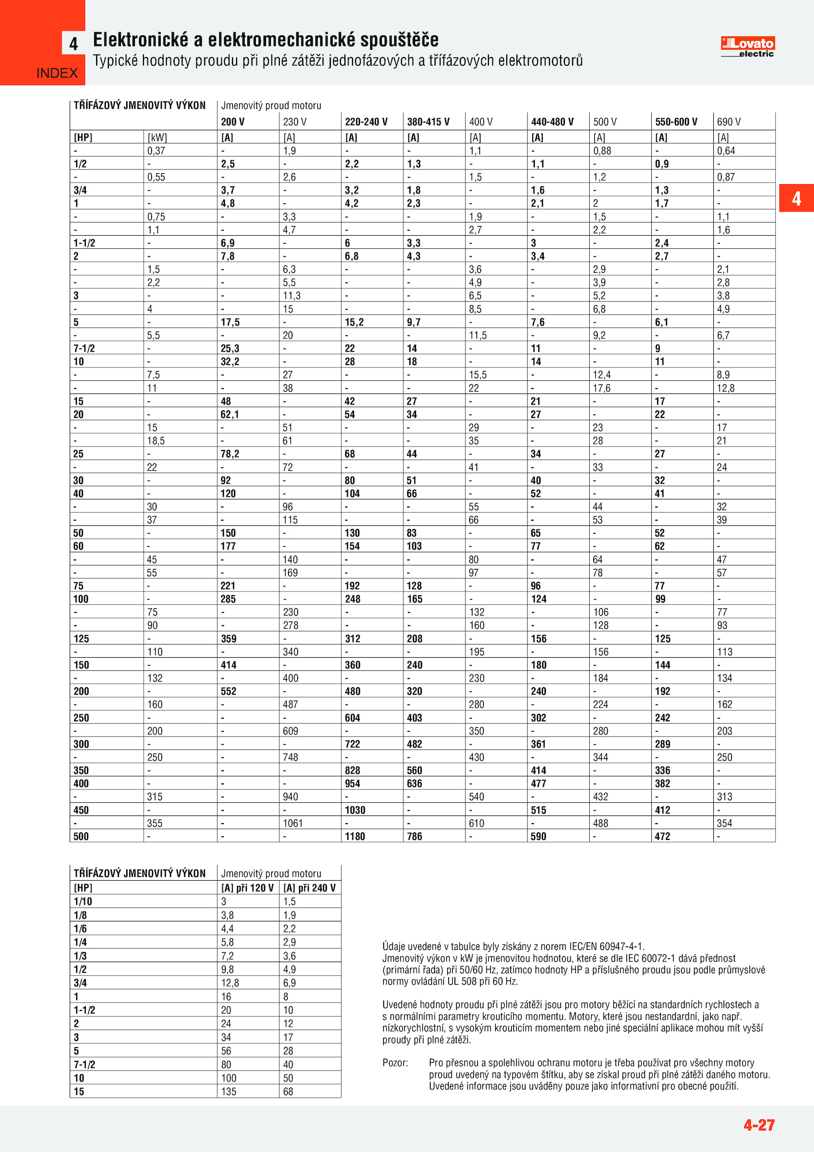 (primární řada) při 50/60 Hz, zatímco hodnoty příslušného proudu jsou podle průmyslové