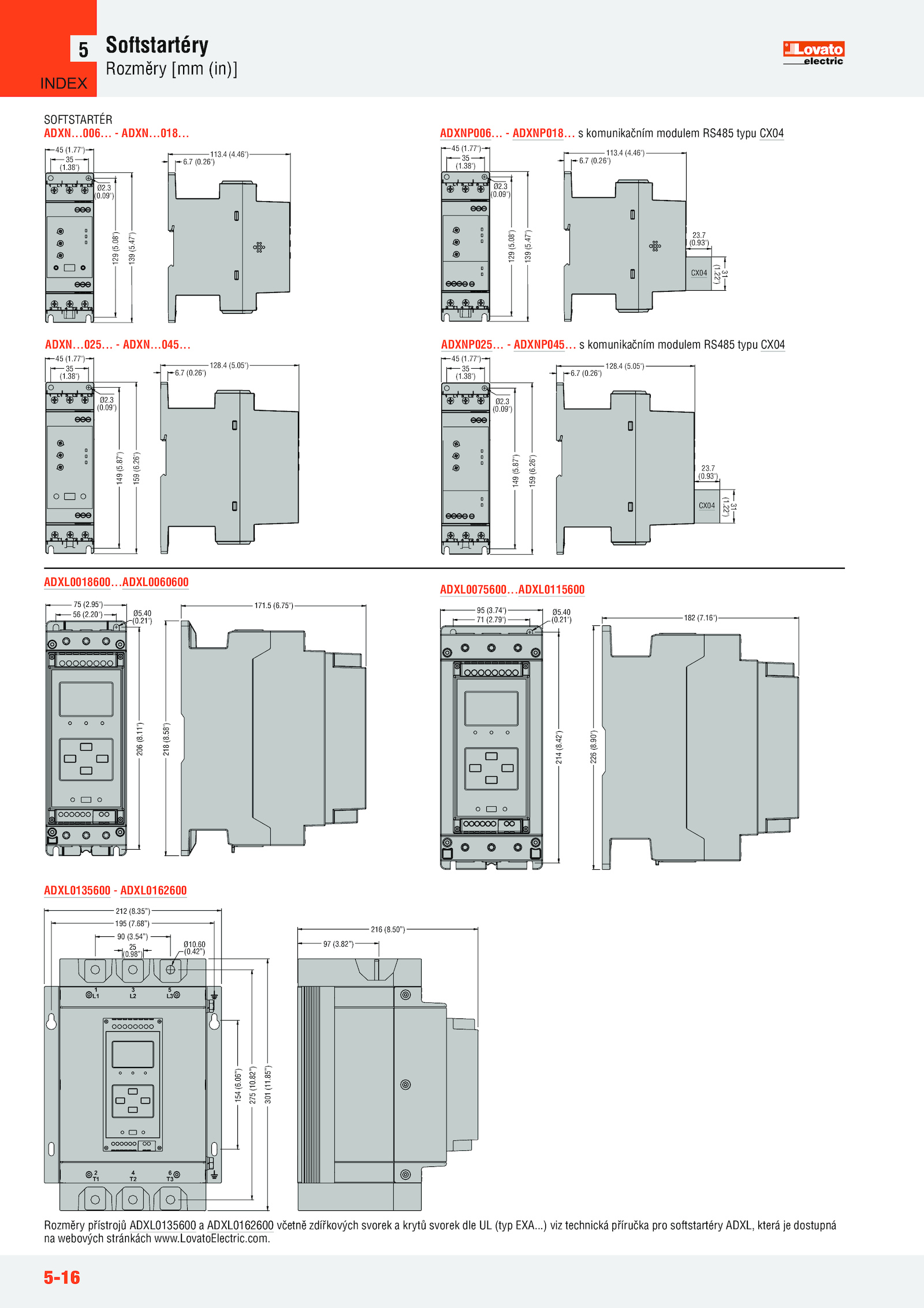 .87") 45 (1.08") 113.7 (0....7 (0.. ADXNP045.90") Ø5..22") 23.4 (4.50”) 97 (3.93") CX04 45 (1...77") 35 (1..85”) INDEX ..95") 218 (8.5-16 Softstartéry Rozměry [mm (in)] 5 Rozměry přístrojů ADXL0135600 ADXL0162600 včetně zdířkových svorek krytů svorek dle (typ EXA.26") ADXN.60 (0.3 (0.47") 129 (5...35”) 195 (7.38") Ø2.5 (6.LovatoElectric.38") Ø2.77") 35 (1.ADXL0060600 ADXL0075600.26") 149 (5.08") ADXN..ADXL0115600 Ø5.38") Ø2. SOFTSTARTÉR 159 (6.025.) viz technická příručka pro softstartéry ADXL, která dostupná na webových stránkách www.42") 226 (8.46") 6.018.7 (0...4 (4. ADXL0018600.4 (5.05") 45 (1..26") 31 (1...3 (0.3 (0. ADXN.com. ADXNP018. 31 (1.7 (0... komunikačním modulem RS485 typu CX04 CX04 159 (6..09") 139 (5.26") 149 (5.54”) 25 (0.16") 214 (8.40 (0..11") 95 (3.09") 113.20") 206 (8..77") 35 (1.22") 23.26") 139 (5.09") 128.4 (5.98”) Ø10.26") ADXNP006.82”) 301 (11..06”) 275 (10..74") 71 (2.47") 129 (5.42”) 216 (8.58") 171.46") 6.75") 56 (2.82”) 154 (6.7 (0. ADXN.87") 128.40 (0.7 (0.93") ADXNP025.3 (0.21") 45 (1.006.79") 182 (7.77") 35 (1.05") 6.68”) 90 (3..21") 75 (2.. komunikačním modulem RS485 typu CX04 ADXL0135600 ADXL0162600 1 L1 3 L2 5 L3 2 T1 4 T2 6 T3 212 (8.09") 6...38") Ø2..045