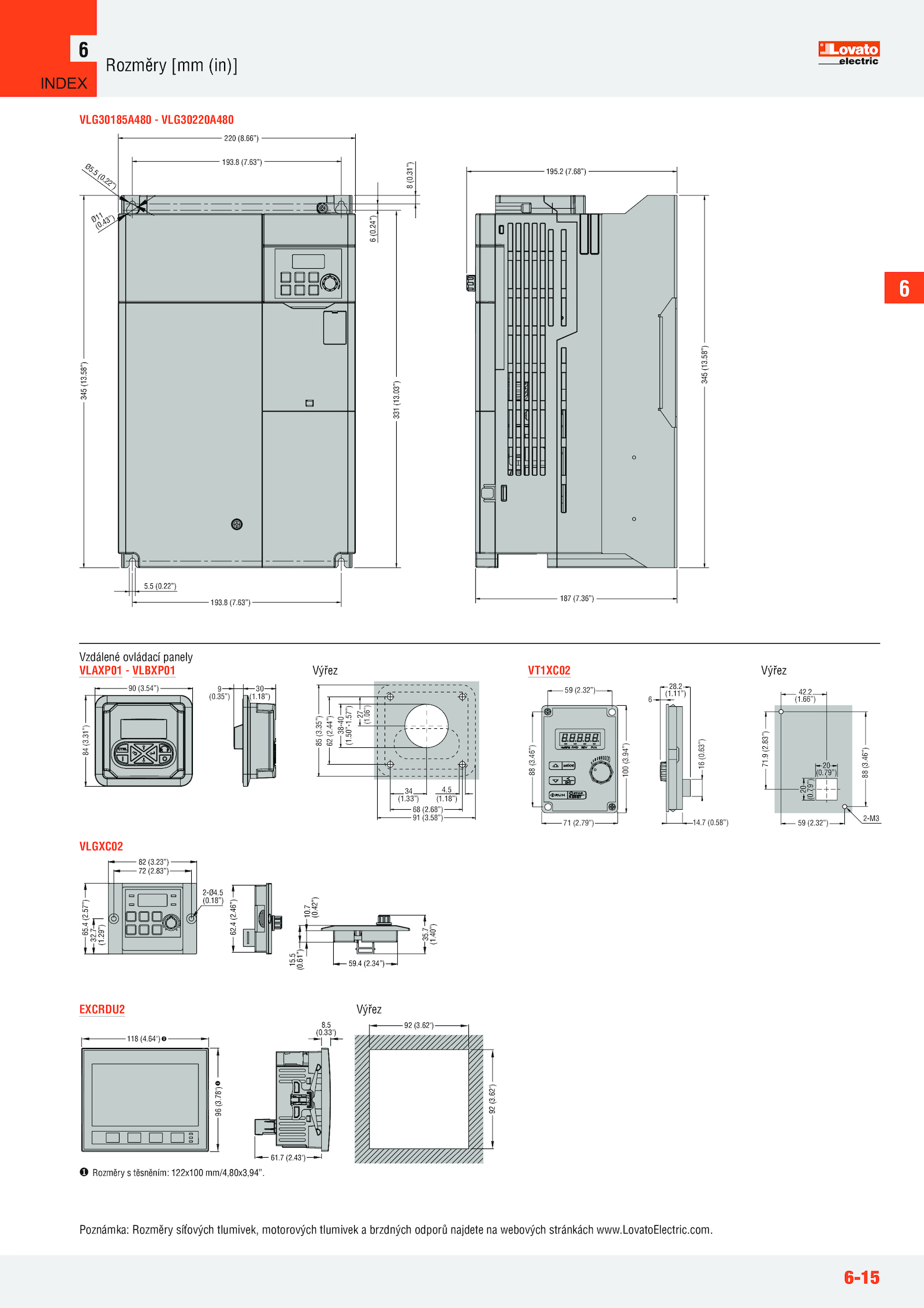 43") 92 (3.58”) 195.58”) 331 (13.61”) 10.62") 118 (4.7 (0.22”) 193. 6 90 (3.31”) 6 (0.34”) 2-Ø4.63”) 88 (3.2 (7.5 (0.18”) 72 (2.29”) 62.64") 8.83”) 88 (3.7 (2.6-15 Rozměry [mm (in)] 6 VLG30185A480 VLG30220A480 220 (8.40”) Poznámka: Rozměry síťových tlumivek, motorových tlumivek brzdných odporů najdete webových stránkách www.8 (7.2 (1.5 (0.LovatoElectric.42”) 35.7 (1.7 (0.79”) 2-M3 96 (3.8 (7.9 (2.58”) 68 (2.18”) 85 (3.com.44”) 38-40 (1.06”) 59 (2.22”) Ø11 (0.32”) 28.5 (1.31”) 9 (0.35”) 62 (2.46”) 100 (3.50”-1.66”) 59 (2.57”) 27 (1.79”) 14.35”) 30 (1.7 (1.5 (0.63”) 187 (7.46”) 59. INDEX .5 (0.18”) 91 (3.11”) 6 71 (2.46”) 42.58”) 16 (0.57”) 32.03”) 5.4 (2.78") 92 (3.43”) 345 (13.33") 61.68”) Vzdálené ovládací panely EXCRDU2 VLGXC02 VLAXP01 VLBXP01 Výřez VT1XC02 Výřez Výřez 82 (3.94”) 20 (0.23”) 65.68”) 34 (1.83”) 15.63”) 8 (0.4 (2.24”) Ø5.79”) 71.54”) 84 (3.4 (2.32”) 20 (0.66”) 193.33”) 4.36”) 345 (13.62") Rozměry těsněním: 122x100 mm/4,80x3,94”.2 (1.5 (0