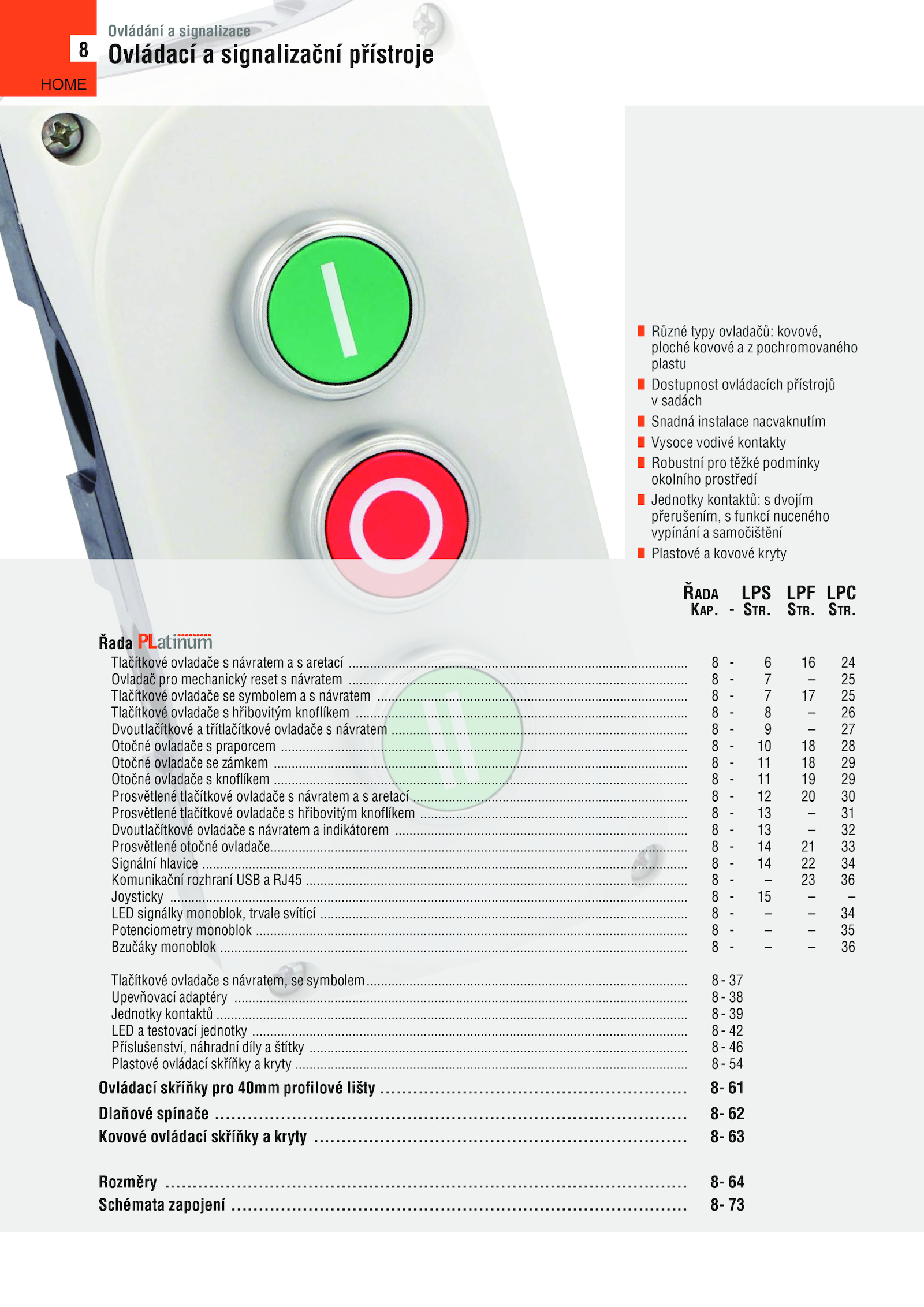 .................................................................................................................................................................................................................................................................................................................... 31 Dvoutlačítkové ovladače návratem indikátorem .......................................................................................................... 34 Komunikační rozhraní USB RJ45 ........................................................ ..................................... 62 Kovové ovládací skříňky kryty ............ 33 Signální hlavice .............. 46 Plastové ovládací skříňky kryty................ STR......................................................................................................................................... 30 Prosvětlené tlačítkové ovladače hřibovitým knoflíkem ................................ – LED signálky monoblok, trvale svítící ...................................................................................................... 61 Dlaňové spínače ..................................... 36 Tlačítkové ovladače návratem, symbolem......................................................................................................................................................................................... STR.................................. .... Řada Tlačítkové ovladače návratem aretací ....................................................................................................................................................................................................................... 25 Tlačítkové ovladače hřibovitým knoflíkem ................................................................................ 73 HOME ................................................................................................. 63 Rozměry .................................................. 32 Prosvětlené otočné ovladače.... 35 Bzučáky monoblok .................... 64 Schémata zapojení .................................................................................................................................................. 29 Otočné ovladače knoflíkem ............................................................................................................................................................................................ 34 Potenciometry monoblok .................................................................. ....................... 28 Otočné ovladače zámkem .... 54 Ovládací skříňky pro 40mm profilové lišty......................................................................................................................................... 38 Jednotky kontaktů................................................................................................................................................................................................ 27 Otočné ovladače praporcem ....................................... 29 Prosvětlené tlačítkové ovladače návratem aretací ............................ 39 LED testovací jednotky ......................................... ................................................................................................................................................................................................ 36 Joysticky .................... STR.....Různé typy ovladačů: kovové, ploché kovové pochromovaného plastu Dostupnost ovládacích přístrojů v sadách Snadná instalace nacvaknutím Vysoce vodivé kontakty Robustní pro těžké podmínky okolního prostředí Jednotky kontaktů: dvojím přerušením, funkcí nuceného vypínání samočištění Plastové kovové kryty Ovládání signalizace Ovládací signalizační přístroje 8 ŘADA LPS LPF LPC KAp............................................................................................................................................. 37 Upevňovací adaptéry .................. 24 Ovladač pro mechanický reset návratem ..................................... 42 Příslušenství, náhradní díly štítky ........ 25 Tlačítkové ovladače symbolem návratem .............................................................................................................................. ............ 26 Dvoutlačítkové třítlačítkové ovladače návratem ...............................