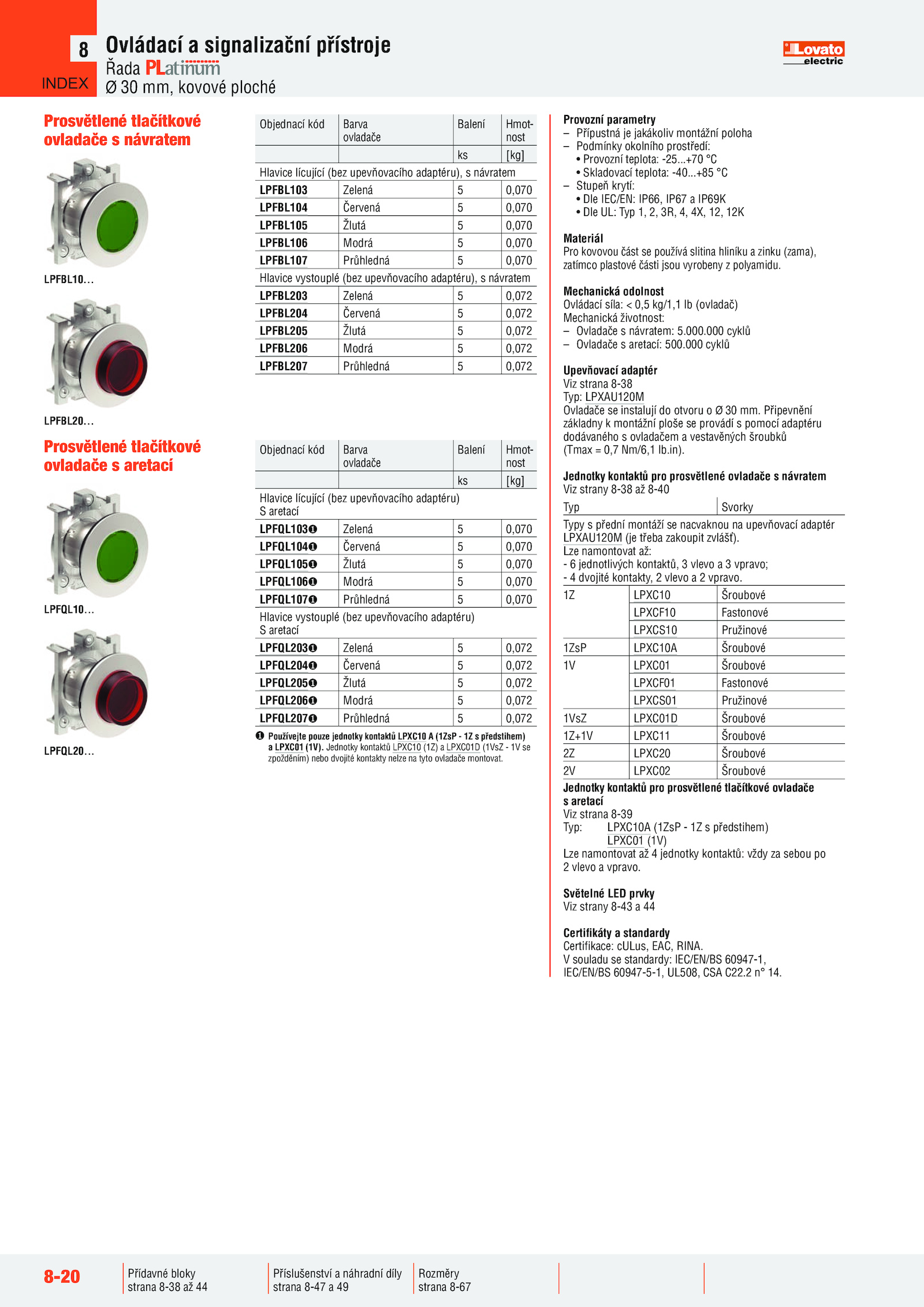 Jednotky kontaktů pro prosvětlené ovladače návratem