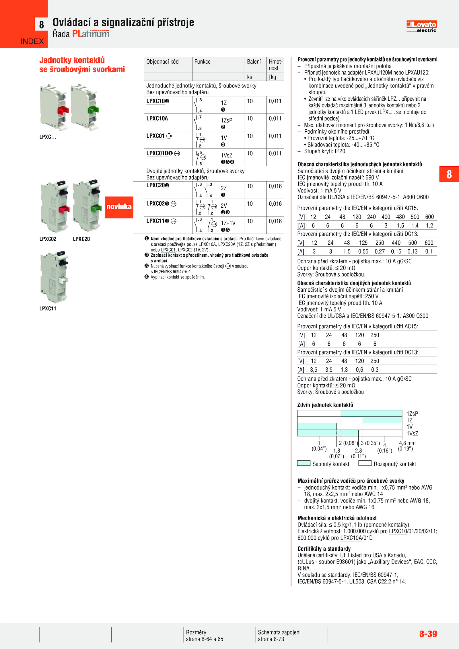 Provozní parametry pro jednotky kontaktů šroubovými svorkami