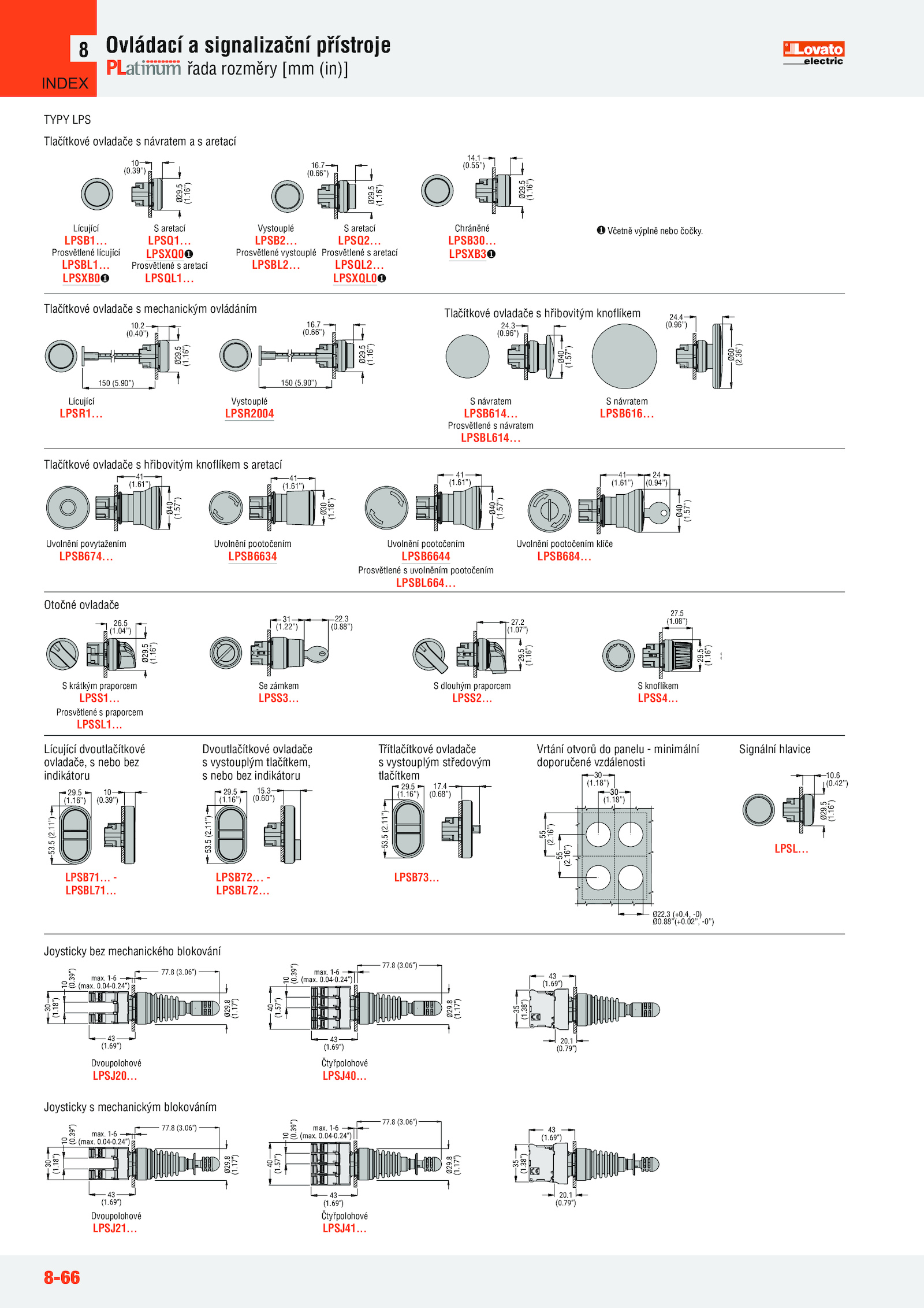 69”) 30 (1. 0.4 (0.5 (1.4 (0..7 (1.04-0. 0.88”) 25.8 (1.24”) 30 (1.36”) 24. 1-6 (max.04-0.17”) 43 (1.39”) max.57”) 10 (0.04-0.4 (0. Ø29.36”) 24.39”) max.68”) Třítlačítkové ovladače s vystouplým středovým tlačítkem LPSB73.43”) Vystouplé LPSB2.17”) Ø29. Prosvětlené praporcem LPSSL1.38”) 35 (1.08”) 29.16”) 10. 1-6 (max.18”) 41 (1.5 (1.17”) Ø29.1 (0.90”) Ø29.24”) 40 (1..61”) Uvolnění pootočením LPSB6634 Tlačítkové ovladače hřibovitým knoflíkem aretací Ø29.69”) 43 (1.18”) 10 (0.69”) 35 (1. Ø40 (1.1 (0.5 (1.24”) 77.57”) 10 (0..24”) 77.1 (0. 0.5 (1. 1-6 (max..04-0. 1-6 (max.24”) 77.11”) Dvoutlačítkové ovladače s vystouplým tlačítkem, s nebo bez indikátoru LPSB72.55”) Chráněné LPSB30. 55 (2. Ø60 (2.69”) Ø29.69”) 43 (1.39”) max.79”) 43 (1... Ø40 (1. Ø29.69”) 30 (1..18”) 10 (0.79”) 20.39”) Ø29.16”) 19..37”) Ø38 (1.17”) 43 (1.2 (0.69”) 43 (1. Ø40 (1.16”) 38 (1.8 (1.06”) 77.18”) 10 (0.57”) 41 (1.17”) 43 (1. 1-6 (max.17”) Ø29.18”) 10 (0. 0.39”) max.69”) 43 (1.16”) 10 (0.90”) 150 (5.8 (3.66”) Ø29.85”) S knoflíkem LPSS4.37”) Ø38 (1.06”) 40 (1.16”) 30 55 (2.66”) 38 (1.8 (0.3 (0.8 (3.39”) Ø29.39”) max.38”) 35 (1.69”) Ø29.69”) 43 (1.8 (1.95”) Ø40 (1.06”) 77. 54 (2.04-0.39”) max.18”) Ø22.90”) Lícující LPSR1.69”) 43 (1.. 0. 0.6 (1.8 (3.. Ø30 (1.5 (2.24”) 30 (1.42”) Ø29.39”) max.66”) Ø29.7 (1..1 (0.04-0..7 (0. Čtyřpolohové LPSJ41.. 0.39”) max.1 (0.17”) 43 (1.69”) 35 (1..3 (0.16”) 16.5 (1.50”) 34.18”) 30 (1.18”) 10 (0.06”) 40 (1. 1-6 (max.69”) 30 (1. 29.06”) 40 (1.01”) 29.06”) 77.8 (3.5 (2. Ø22.79”) 43 (1.1 (0.5 (0.69”) 35 (1.24”) 77.8 (3.17”) 43 (1.24”) 40 (1.5 (1.16”) 38 (1. Čtyřpolohové LPSJ40.5 (1.77”) 32..8 (1.06”) 77.5 (1. LPSXB3 Tlačítkové ovladače hřibovitým knoflíkem Ø40 (1.5 (1.5 (1.8 (3.38”) 35 (1...04-0.5 (1.24”) 40 (1.24”) 40 (1.04-0. 0.50”) 20.57”) 10 (0.5 (1.16”) 38 (1.06”) 20.8 (3. 1-6 (max.50”) 4.06”) 77.18”) 10 (0..69”) 35 (1..69”) Ø29.5 (0.81”) Otočné ovladače S krátkým praporcem LPSS1..06”) 40 (1. Prosvětlené lícující LPSBL1.57”) 41 (1.7 (1.1 (0.5 (1. Ø29.17”) 43 (1.06”) 77.16”) 10 (0.39”) max..66”) Vystouplé LPSR2004 Tlačítkové ovladače mechanickým ovládáním Včetně výplně nebo čočky.7 (1.12”) 29..4 (0.8 (3. 1-6 (max. 0.69”) 30 (1.7 (1.16”) INDEX .8 (1.38”) Ø29.8 (3.6 (0.90”) 16.16”) 15.39”) max. 1-6 (max.4 (0. 1-6 (max.8 (3.69”) 43 (1.61”) 24 (0.5 (1.18”) 10 (0.04-0....8 (1.69”) 43 (1.61”) Uvolnění povytažením LPSB674.7 (1..57”) 24. - LPSBL71. 0.24”) 77.62”) 29.79”) 43 (1.79”) 20.8-66 Ovládací signalizační přístroje řada rozměry [mm (in)] 8 Tlačítkové ovladače návratem aretací Lícující LPSB1.04-0.65”) 10.06”) 77.5 (1. 1-6 (max.36”) 24.18”) 10 (0.18”) 10 (0.88”(+0.79”) 43 (1.4, -0) Ø0.5 (1.38”) Ø29.24”) 40 (1.39”) max.7 (0.96”) Ø60 (2.57”) 10 (0.39”) max.06”) 40 (1.24”) 77.39”) max.1 (0.5 (1..96”) Ø40 (1.5 (1.38”) Ø29.96”) S návratem LPSB616.24”) 30 (1.07”) 38 (1.8 (3. LPSXQ0 Prosvětlené aretací LPSQL1.17”) 43 (1.04-0.5 (1.16”) 16.39”) max.69”) 35 (1.17”) 43 (1.1 (0.7 (1.43”) Ø40 (1.57”) Ø29.5 (1. 1-6 (max.38”) Ø29.18”) 10 (0.39”) max.17”) Ø29.79”) 43 (1. 0.3 (0.11”) Lícující dvoutlačítkové ovladače, nebo bez indikátoru LPSB71..57”) 24.1 (0. 1-6 (max.04-0.57”) 10 (0.57”) 10 (0.55”) Ø29.69”) 43 (1. 1-6 (max. 1-6 (max. 0. 0.7 (0.04-0.16”) 16.17”) 43 (1.37”) Ø38 (1.18”) 10 (0.06”) Joysticky bez mechanického blokování Dvoupolohové LPSJ20. 1-6 (max.90”) 16.16”) 14.04-0..8 (3.8 (0.04-0.50”) 34.7 (0.7 (1.39”) max.06”) 77.8 (3.37”) Ø38 (1.8 (3. 0..39”) max.79”) 43 (1.28”) 29.3 (0.2 (0. 1-6 (max.1 (0. Prosvětlené návratem LPSBL614.69”) 30 (1.04-0.24”) 30 (1. 0.50”) 25.. 0. (1.04-0.94”) Uvolnění pootočením klíče LPSB684. 0.16”) 10 (0.4 (1.18”) 10 (0.24”) 77.8 (1.50”) 34.5 (1.22”) 38 (1.50”) 21.8 (1.17”) 43 (1.8 (1.5 (0.24”) 77.7 (0.06”) 20..16”) 27..7 (0.38”) 35 (1.11”) 54 (2.17”) 43 (1..38”) 35 (1.9 (0.. LPSXB0 S aretací LPSQ1.57”) 41 (1. 0.57”) 24. 1-6 (max.8 (1.39”) max.4 (0.02”, -0”) Vrtání otvorů panelu minimální doporučené vzdálenosti TYPY LPS 20.8 (1..16”) 38 (1..50”) 34.06”) 10 (0. 20.6 (0.88”) Se zámkem LPSS3.17”) Ø29.18”) 41 (1.39”) max.24”) 30 (1.8 (1.96”) S návratem LPSB614.69”) 43 (1.8 (3. 1-6 (max..40”) 17.5 (1. 0.1 (0.2 (0.8 (1.8 (3.3 (0.3 (+0.17”) 43 (1.39”) max.84”) S dlouhým praporcem LPSS2.37”) Ø38 (1..5 (1.69”) 43 (1.69”) 43 (1.1 (0. 20.16”) 27.57”) 36.69”) 43 (1...12”) 29. 29. Prosvětlené aretací LPSQL2.. 0.8 (1.79”) 20..50”) 34.. 0.8 (1.04-0.50”) 34. 0.17”) Ø29.5 (1.8 (3.17”) Ø29.57”) Ø29.61”) Uvolnění pootočením LPSB6644 Prosvětlené uvolněním pootočením LPSBL664. 29.. Prosvětlené vystouplé LPSBL2.79”) 20.06”) 40 (1.2 (0.37”) Ø38 (1.8 (1..50”) 4.69”) Ø29.04-0.16”) 14.8 (1.04”) Ø29..60”) 53.57”) 10 (0.. S aretací LPSQ2.39”) Ø29.24”) 30 (1. 1-6 (max.77”) 25.04-0.06”) Joysticky mechanickým blokováním Dvoupolohové LPSJ21.96”) Ø60 (2...57”) 41 (1.57”) 10 (0.16”) 30 (1.50”) 34.5 (2.06”) 77.24”) 40 (1.57”) 24.1 (0.17”) Ø29.57”) Ø40 (1. 1-6 (max.16”) 26..95”) Ø40 (1. 0.06”) 20.42”) Signální hlavice LPSL.8 (3.06”) 77.94”) Ø40 (1.69”) Ø29.5 (1.04-0..17”) Ø29.8 (1.38”) 35 (1.8 (3.96”) Ø60 (2.16”) 150 (5.04-0.61”) Ø30 (1.17”) Ø29.36”) 24.5 (1.16”) 10.2 (1.38”) Ø29.17”) Ø29.40”) 150 (5..16”) 15.39”) max. LPSXQL0 Ø29.50”) 21. 1-6 (max.39”) Ø29.88”) 31 (1..04-0.50”) 10.06”) 77.8 (3.69”) 35 (1.8 (1.79”) 20.69”) 43 (