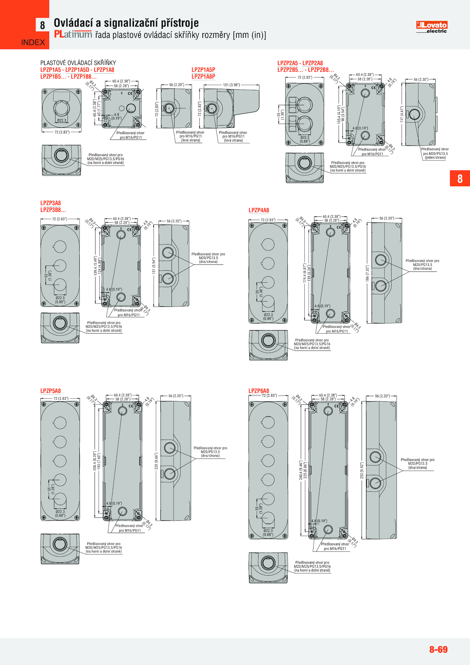 20”) Předlisovaný otvor pro M16/PG11 Předlisovaný otvor pro M20/PG13. 3 ( 0 .5 (jeden/strana) Předlisovaný otvor pro M20/M25/PG13.20”) 72 (2..88”) 60.3 4..83”) 56 (2.19”) Ø 4 . 3 ( 0 . 3 ( 0 .83”) 35 (1. LPZP1B8.19”) Ø 4 .38”) 58 (2.46”) 225 (8.38”) Ø22.83”) 35 (1.8 (0.38”) 58 (2.4 (2.28”) 4 .83”) 35 (1.28”) 4 .8 (0.66”) Předlisovaný otvor pro M20/PG13.28”) (2. 3 ( 0 .92”) 240,4 (9.20”) 4 .8 (0.. LPZP2B8. 3 ( 0 . 3 ( 0 . 3 ( 0 .38”) 58 (2.4 (8.5 (dva/strana) 151 (5..38”) 58 (2. 3 ( 0 .83”) 101 (3. 1 9 ” ) Ø 4 . 3 ( 0 .15”) 90 (3.28”) 4 .19”) 4 .88”) 105,4 (4.26”) Předlisovaný otvor pro M20/PG13.54”) 117 (4. 8 ( 0 . 8 ( 0 . LPZP1A5P LPZP1A8P LPZP2A5 LPZP2A8 LPZP2B5.20”) 193 (7. 1 7 ” ) 4.4 (2. 1 7 ” ) Předlisovaný otvor pro M16/PG11 174.38”) Ø22.86”) Předlisovaný otvor pro M20/M25/PG13.5/PG16 (na horní dolní straně) 72 (2.8 (0. 8 ( 0 .38”) 58 (2.20”) LPZP3A8 LPZP3B8..3 (0.49”) 124 (4.. 1 9 ” ) Ø 4 . 1 7 ” ) 56 (2.38”) Ø22.38”) 58 (2. 1 7 ” ) 56 (2.19”) Předlisovaný otvor pro M16/PG11 Předlisovaný otvor pro M16/PG11 (levá strana) Předlisovaný otvor pro M20/M25/PG13.88”) 60. Předlisovaný otvor pro M16/PG11 208.38”) 60. LPZP4A8 8-69 Ovládací signalizační přístroje řada plastové ovládací skříňky rozměry [mm (in)] 8 INDEX .83”) 60.3 (0.19”) Ø 4 .3 (0..8 (0.28”) 45 (1. 1 7 ” ) 4..5 (dva/strana) Předlisovaný otvor pro M20/M25/PG13.94”) Předlisovaný otvor pro M20/M25/PG13.5 (dva/strana) Předlisovaný otvor pro M20/M25/PG13.4 (2.20”) LPZP1A5 LPZP1A5D LPZP1A8 LPZP1B5.8 (0.3 (0.38”) Ø22. 1 9 ” ) Ø 4 .4 (2.5/PG16 (na horní dolní straně) 72 (2.4 (2. 1 7 ” ) Ø 4 .8 PLASTOVÉ OVLÁDACÍ SKŘÍŇKY Ø22.. 3 ( 0 .4 (2.32”) 56 (2.88”) Předlisovaný otvor pro M16/PG11 Předlisovaný otvor pro M20/PG13. 8 ( 0 . 1 9 ” ) Ø 4 .88”) 60. 1 7 ” ) 56 (2.77”) Ø 4 . 1 7 ” ) 186 (7.28”) 4.38”) Ø22. 1 7 ” ) 4.5/PG16 (na horní dolní straně) 72 (2.4 (2.5 (dva/strana) 252 (9.3 (0. 1 7 ” ) 4.5/PG16 (na horní dolní straně) 72 (2. 1 9 ” ) Ø 4 .83”) 35 (1.61”) Předlisovaný otvor pro M16/PG11 Předlisovaný otvor pro M20/PG13.98”) Předlisovaný otvor pro M16/PG11 (levá strana) 35 (1.60”) 220 (8.5/PG16 (na horní dolní straně) 72 (2.87”) 159 (6. 1 7 ” ) 72 (2.83”) 60. 8 ( 0 ..19”) Ø 4 .4 (6.88”) 60. 3 ( 0 .4 /5.5/PG16 (na horní dolní straně) 72 (2.20”) LPZP5A8 LPZP6A8 139