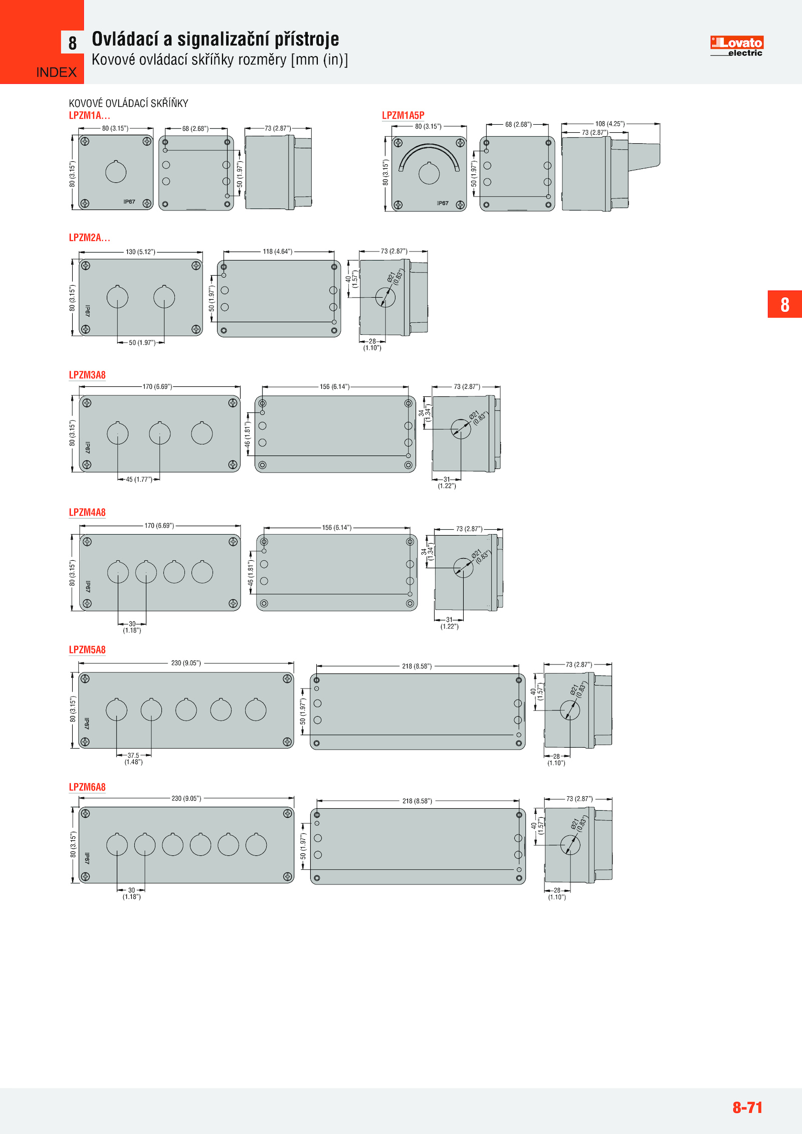 15”) 73 (2.97”) 28 (1.68”) 50 (1.57”) LPZM1A5P 118 (4.87”) 40 (1.10”) 40 (1.87”) LPZM6A8 LPZM3A8 LPZM4A8 LPZM5A8 INDEX .87”) 30 (1.22”) 34 (1.15”) 80 (3.94”) Ø21 (0. 8 3 ” ) 80 (3.81”) 31 (1.57”) LPZM1A.97”) 80 (3.64”) 130 (5.14”) Ø21 (0..22”) 34 (1.81”) 31 (1.87”) 24 (0.14”) Ø21 (0.34”) 170 (6.83”) 80 (3.68”) 50 (1.5 (1.58”) 50 (1. 45 (1.15”) 73 (2.97”) LPZM2A.15”) 73 (2.48”) 230 (9.57”) Ø 2 1 ( 0 .87”) 37.15”) 73 (2.05”) 218 (8. 8 3 ” ) 50 (1.87”) 30 (1.10”) Ø 2 1 ( 0 .57”) Ø 2 1 ( 0 .83”) 40 (1.12”) 28 (1.18”) 46 (1.15”) 73 (2.94”) 40 (1.15”) 80 (3..10”) 40 (1.83”) 80 (3. 8 3 ” ) 80 (3.69”) 156 (6.18”) 230 (9.57”) 50 (1..97”) 80 (3.77”) 46 (1.8 8-71 Ovládací signalizační přístroje Kovové ovládací skříňky rozměry [mm (in)] 8 KOVOVÉ OVLÁDACÍ SKŘÍŇKY 68 (2.25”) 68 (2. 108 (4.05”) 218 (8.69”) 156 (6.97”) 80 (3..58”) 50 (1.97”) 28 (1.34”) 170 (6.87”) 24 (0.15”) 73 (2.15”) 73 (2