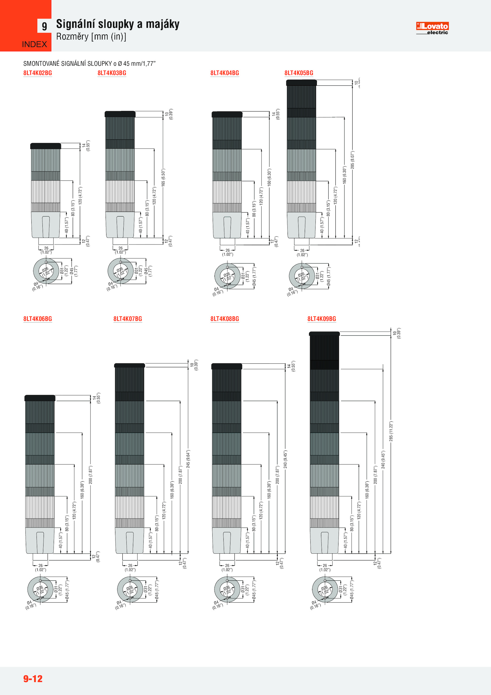02”) 40 (1.77”) Ø4 (0.50”) 10 (0.77”) Ø31 (1.30”) 200 (7.77”) 8LT4K04BG 8LT4K05BG 205 (8.47”) 14 (0.02”) 12 (0.02”) 12 (0.15”) 120 (4.30”) 10 (0.47”) 26 (1.87”) 40 (1.57”) 80 (3.16”) 40 (1.15”) 120 (4.02”) Ø4 (0.02”) Ø26 (1.72”) 165 (6.30”) 240 (9.02”) 12 (0.16”) Ø45 (1.47”) 12 (0.77”) Ø31 (1.22”) Ø26 (1.39”) 8LT4K06BG 8LT4K07BG 8LT4K08BG 8LT4K09BG 200 (7.22”) 26 (1.07”) 26 (1.57”) 80 (3.55”) Ø26 (1.02”) Ø4 (0.39”) 200 (7.55”) Ø45 (1.02”) Ø4 (0.57”) 80 (3.47”) 14 (0.16”) 26 (1.9-12 Signální sloupky majáky Rozměry [mm (in)] 9 SMONTOVANÉ SIGNÁLNÍ SLOUPKY mm/1,77” 8LT4K02BG 8LT4K03BG 26 (1.72”) 160 (6.57”) 80 (3.87”) 40 (1.30”) 200 (7.57”) 80 (3.87”) 245 (9.45”) 14 285 (11.22”) Ø45 (1.22”) Ø26 (1.16”) Ø45 (1.77”) Ø31 (1.45”) INDEX .47”) 26 (1.16”) Ø4 (0.72”) 160 (6.15”) 120 (4.72”) 160 (6.02”) Ø4 (0.02”) 40 (1.72”) 160 (6.22”) Ø26 (1.87”) 40 (1.72”) 12 (0.02”) Ø4 (0.15”) 120 (4.02”) Ø4 (0.77”) Ø31 (1.55”) Ø45 (1.47”) 26 (1.16”) Ø45 (1.72”) 160 (6.57”) 80 (3.02”) 12 (0.39”) 12 (0.57”) 80 (3.22”) Ø26 (1.30”) 14 (0.22”) Ø26 (1.39”) 10 (0.22”) Ø26 (1.22”) Ø45 (1.02”) 26 (1.16”) Ø31 (1.15”) 120 (4.30”) 40 (1.57”) 80 (3.15”) 120 (4.77”) Ø31 (1.77”) Ø31 (1.64”) 240 (9.72”) 160 (6.15”) 120 (4.55”) 10 (0.02”) Ø31 (1.16”) 40 (1.47”) Ø45 (1.47”) 14 (0.02”) 12 (0.15”) 120 (4