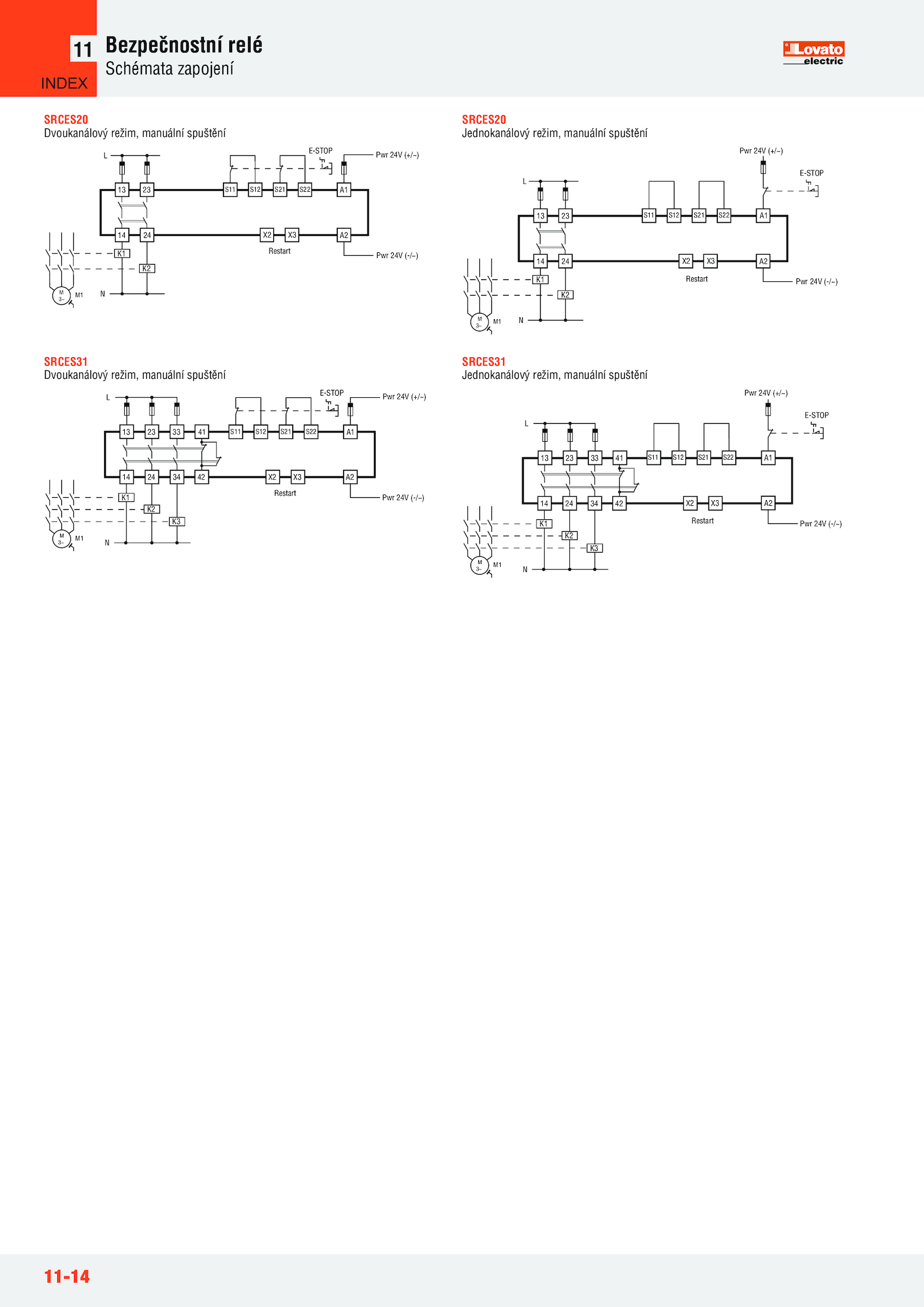 11-14 Bezpečnostní relé Schémata zapojení 11 SRCES20 Dvoukanálový režim, manuální spuštění SRCES20 Jednokanálový režim, manuální spuštění SRCES31 Dvoukanálový režim, manuální spuštění SRCES31 Jednokanálový režim, manuální spuštění A1 A2 X2 S11 S12 S21 S22 13 14 23 24 3~ M M1 K1 K2 Restart L N E-STOP Pwr 24V (+/~) Pwr 24V (-/~) X3 A1 A2 X2 S11 S12 S21 S22 13 14 23 24 3~ M M1 K1 K2 L N Pwr 24V (-/~) E-STOP Pwr 24V (+/~) Restart X3 A1 A2 X2 X3 S11 S12 S21 S22 13 14 23 24 33 34 41 42 3~ M M1 K1 K2 K3 L N E-STOP Pwr 24V (+/~) Pwr 24V (-/~) Restart A2 X2 X3 14 42 3~ M M1 K1 K2 K3 N Pwr 24V (-/~) A1 S11 S12 S21 S22 13 41 L E-STOP Pwr 24V (+/~) Restart INDEX