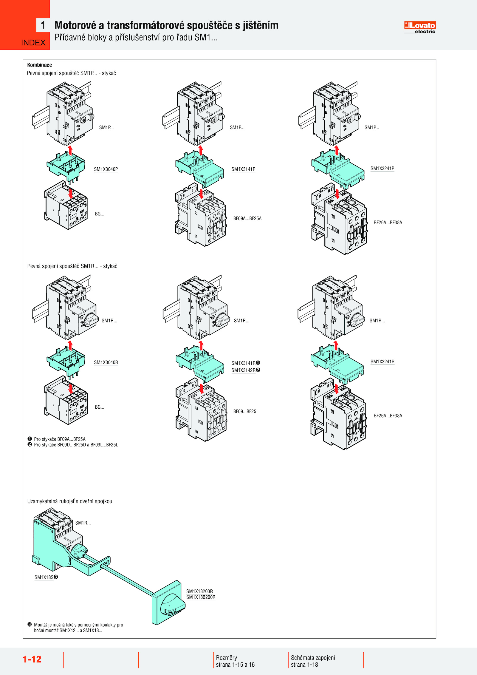 ....... stykač SM1P..BF25L Montáž možná také pomocnými kontakty pro boční montáž SM1X12. SM1X13.. SM1P...... SM1X3040R SM1R.. SM1R. SM1X18S SM1X18200R SM1X18B200R INDEX .. stykač Uzamykatelná rukojeť dveřní spojkou SM1R...BF25 BF26A.. SM1X3241R BG.BF25A SM1P.... SM1X3241P BF26A..1-12 Schémata zapojení strana 1-18 Rozměry strana 1-15 16 4V[VYV]tH[YHUZMVYTm[VYV]tZWV\ú[͌͂LZQPú[͌UxT Přídavné bloky příslušenství pro řadu SM1...BF38A Pro stykače BF09A. BF09....BF25A Pro stykače BF09D. SM1X3040P BG......... 1 2VTIPUHJL Pevná spojení spouštěč SM1P.. SM1X3141P BF09A...BF38A Pevná spojení spouštěč SM1R.. SM1X3141R SM1X3142R SM1R.BF25D BF09L..