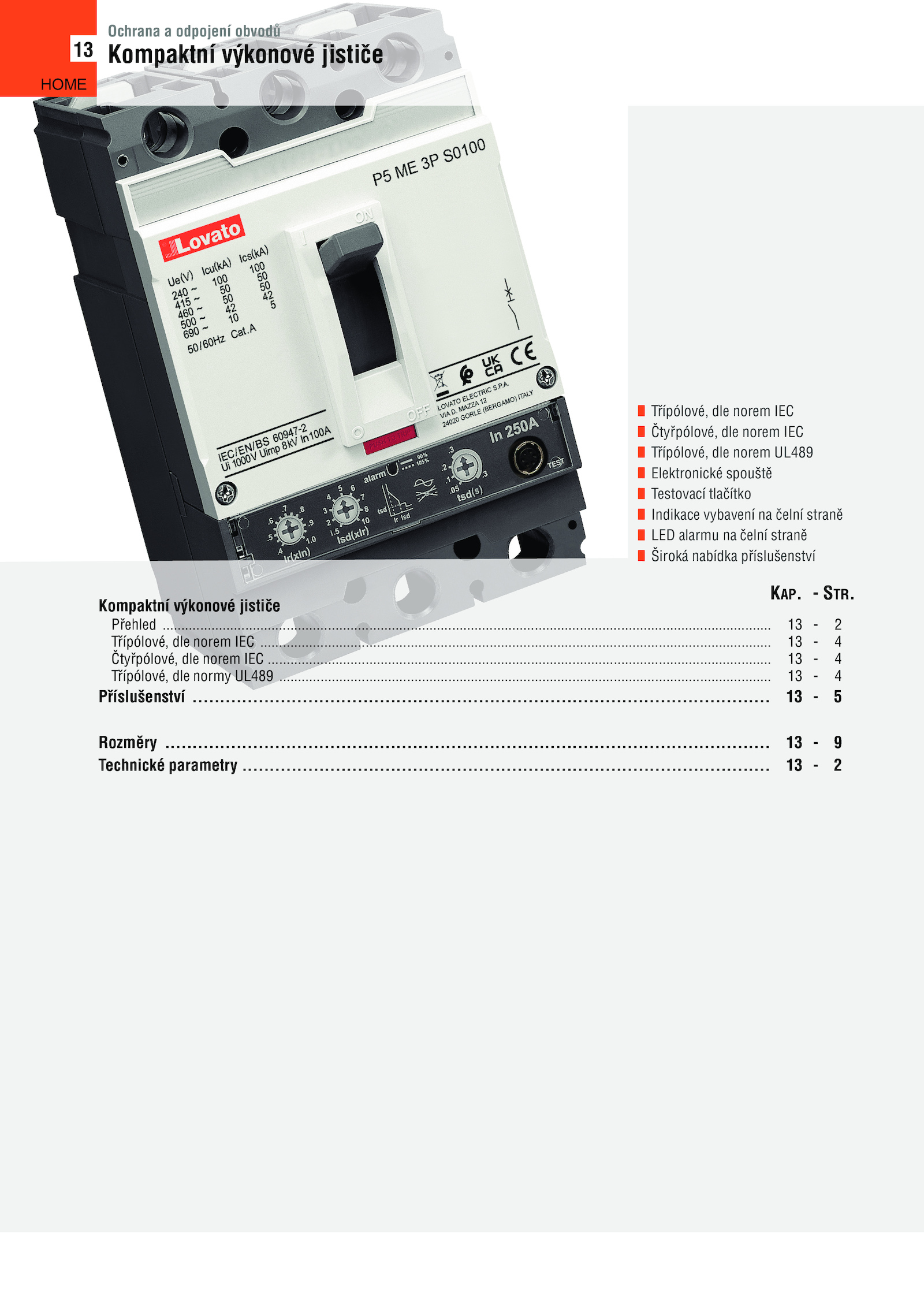 ..................................................................................................................................................................................................... ..... ................................................................................................................... 9 Technické parametry ................................. 4 Příslušenství ............................................................................................................................ 2 HOME ..................................... 4 Čtyřpólové, dle norem IEC ................................................................................................................................ 2 Třípólové, dle norem IEC ...............................................13 Ochrana odpojení obvodů Kompaktní výkonové jističe Třípólové, dle norem IEC Čtyřpólové, dle norem IEC Třípólové, dle norem UL489 Elektronické spouště Testovací tlačítko Indikace vybavení čelní straně LED alarmu čelní straně Široká nabídka příslušenství KAP...... STR.......... 4 Třípólové, dle normy UL489 . 5 Rozměry ........................................................................................................................................ Kompaktní výkonové jističe Přehled ............................................