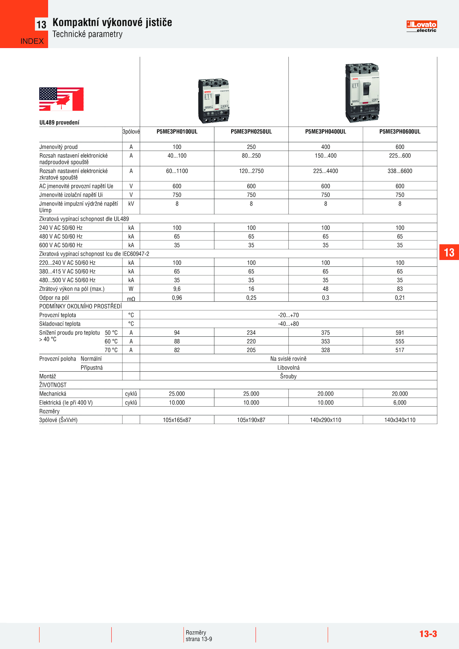 500 50/60 35 Ztrátový výkon pól (max.415 50/60 65 480...000 20...240 50/60 100 100 100 100 380.000 Elektrická (Ie při 400 cyklů 10..000 10.....400 225....100 80.4400 338..000 10..000 20.000 25.13 13-3 Kompaktní výkonové jističe Technické parametry 13 UL489 provedení 3pólové P5ME3PH0100UL P5ME3PH0250UL P5ME3PH0400UL P5ME3PH0600UL Jmenovitý proud 100 250 400 600 Rozsah nastavení elektronické nadproudové spouště A 40.000 6,000 Rozměry 3pólové (ŠxVxH) 105x165x87 105x190x87 140x290x110 140x340x110 Rozměry strana 13-9 ,1'(; ....+80 Snížení proudu pro teplotu > °C 50 234 375 591 60 220 353 555 70 205 328 517 Provozní poloha Normální svislé rovině Přípustná Libovolná Montáž Šrouby ŽIVOTNOST Mechanická cyklů 25.) 9,6 83 Odpor pól 0,96 0,25 0,3 0,21 PODMÍNKY OKOLNÍHO PROSTŘEDÍ Provozní teplota -20..600 Rozsah nastavení elektronické zkratové spouště A 60.250 150...2750 225...1100 120...+70 Skladovací teplota -40...6600 AC jmenovité provozní napětí 600 600 600 600 Jmenovité izolační napětí 750 750 750 750 Jmenovité impulzní výdržné napětí Uimp kV 8 Zkratová vypínací schopnost dle UL489 240 50/60 100 100 100 100 480 50/60 65 600 50/60 35 Zkratová vypínací schopnost Icu dle IEC60947-2 220