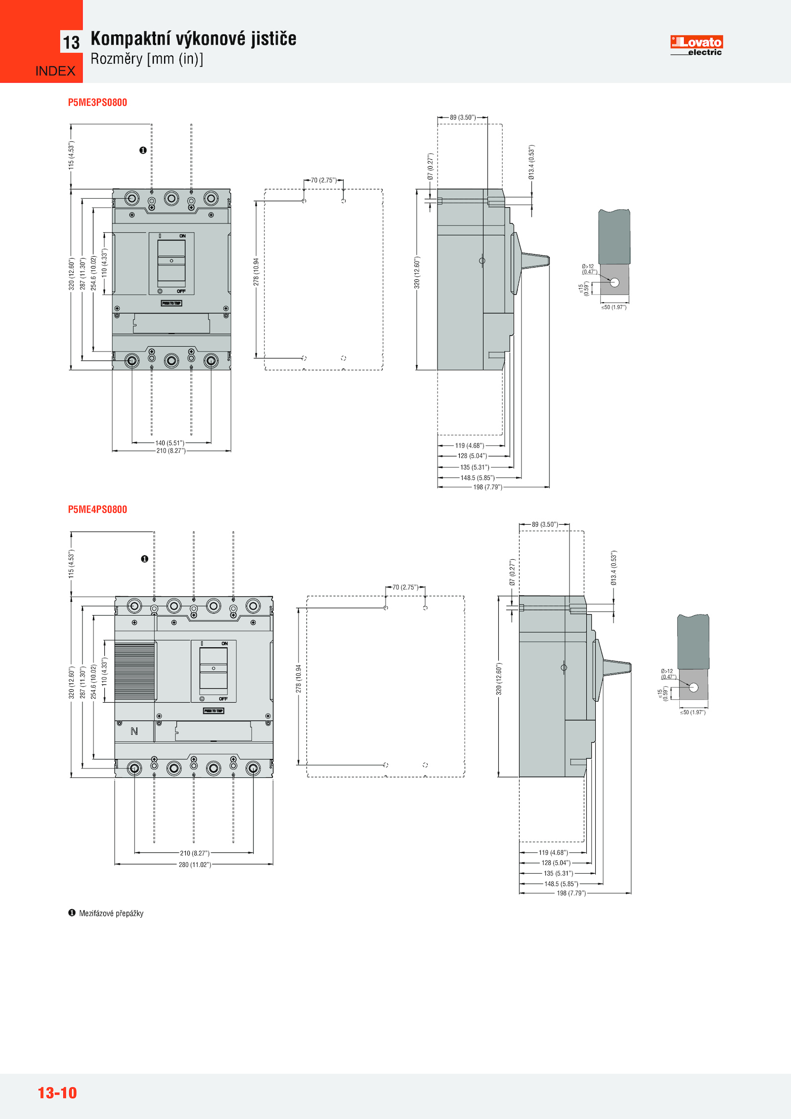 27”) 320 (12.02) 140 (5.47”) ≤15 (0.97”) Ø>12 (0.04”) 135 (5.94 210 (8.60”) 287 (11.60”) 287 (11.59”) ,1'(; .79”) 89 (3.47”) ≤15 (0.30”) 254.53”) Ø7 (0.68”) 128 (5.68”) 128 (5.85”) 198 (7.59”) ≤50 (1.75”) 280 (11.50”) Ø13.30”) 254.97”) Ø>12 (0.13-10 Kompaktní výkonové jističe Rozměry [mm (in)] 13 P5ME3PS0800 P5ME4PS0800 89 (3.50”) Ø13.27”) 110 (4.53”) Ø7 (0.6 (10.5 (5.27”) 278 (10.53”) 320 (12.04”) 135 (5.60”) 119 (4.02”) 119 (4.60”) 70 (2.02) Mezifázové přepážky ≤50 (1.33”) 115 (4.33”) 115 (4.27”) 320 (12.31”) 148.53”) 320 (12.79”) 110 (4.4 (0.85”) 198 (7.4 (0.5 (5.6 (10.31”) 148.51”) 210 (8.94 70 (2.75”) 278 (10
