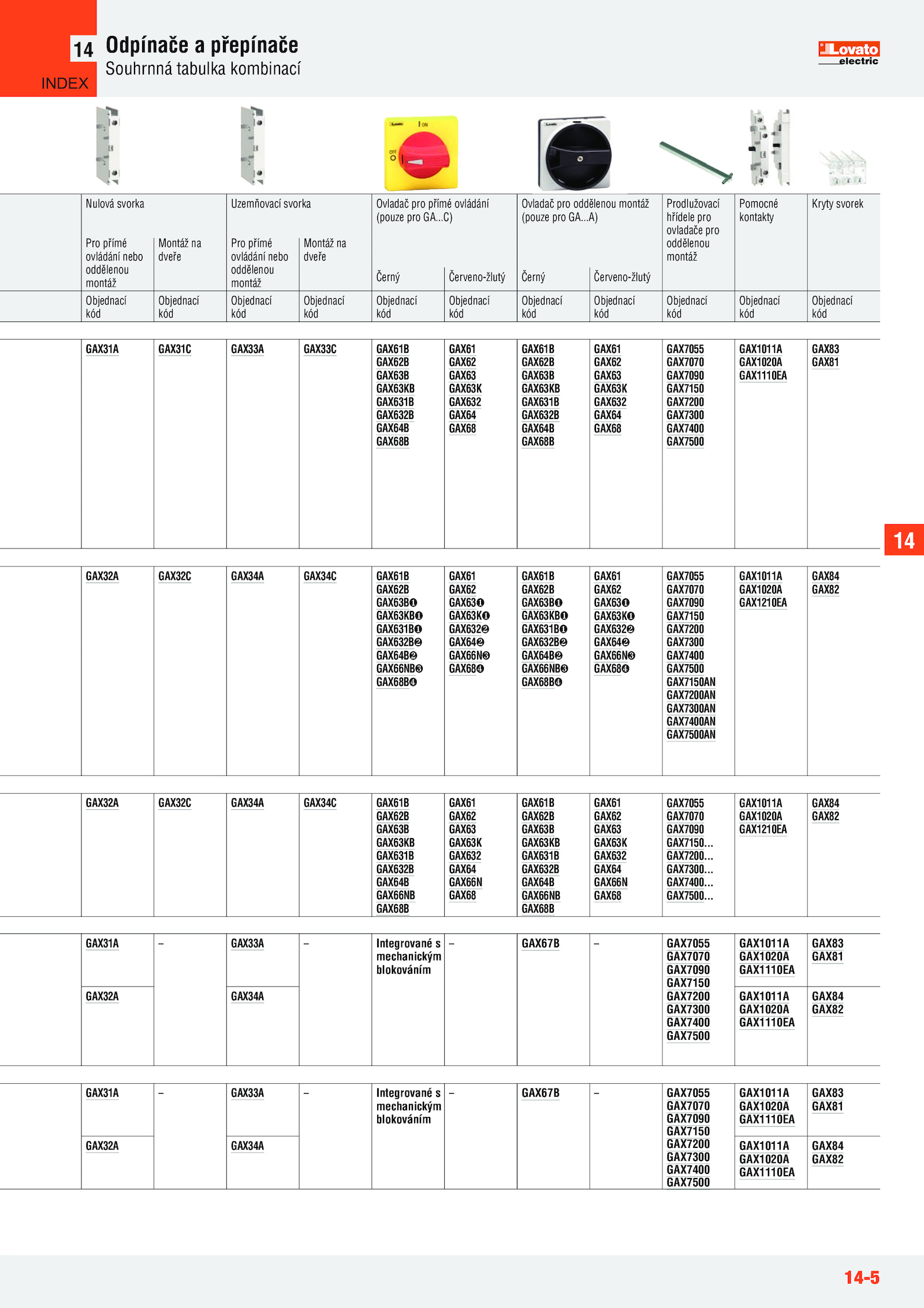 .. GAX7200.C) Ovladač pro oddělenou montáž (pouze pro GA..... GAX7500. GAX1011A GAX1020A GAX1210EA GAX84 GAX82 GAX31A GAX33A Integrované s mechanickým blokováním – GAX67B GAX7055 GAX7070 GAX7090 GAX7150 GAX7200 GAX7300 GAX7400 GAX7500 GAX1011A GAX1020A GAX1110EA GAX83 GAX81 GAX32A GAX34A GAX1011A GAX1020A GAX1110EA GAX84 GAX82 GAX31A GAX33A Integrované s mechanickým blokováním – GAX67B GAX7055 GAX7070 GAX7090 GAX7150 GAX7200 GAX7300 GAX7400 GAX7500 GAX1011A GAX1020A GAX1110EA GAX83 GAX81 GAX32A GAX34A GAX1011A GAX1020A GAX1110EA GAX84 GAX82 14 INDEX ... GAX7300.. GAX7400...14-5 Odpínače přepínače Souhrnná tabulka kombinací 14 Nulová svorka Uzemňovací svorka Ovladač pro přímé ovládání (pouze pro GA....A) Prodlužovací hřídele pro ovladače pro oddělenou montáž Pomocné kontakty Kryty svorek Pro přímé ovládání nebo oddělenou montáž Montáž na dveře Pro přímé ovládání nebo oddělenou montáž Montáž na dveře Černý Červeno-žlutý Černý Červeno-žlutý Objednací kód Objednací kód Objednací kód Objednací kód Objednací kód Objednací kód Objednací kód Objednací kód Objednací kód Objednací kód Objednací kód GAX31A GAX31C GAX33A GAX33C GAX61B GAX62B GAX63B GAX63KB GAX631B GAX632B GAX64B GAX68B GAX61 GAX62 GAX63 GAX63K GAX632 GAX64 GAX68 GAX61B GAX62B GAX63B GAX63KB GAX631B GAX632B GAX64B GAX68B GAX61 GAX62 GAX63 GAX63K GAX632 GAX64 GAX68 GAX7055 GAX7070 GAX7090 GAX7150 GAX7200 GAX7300 GAX7400 GAX7500 GAX1011A GAX1020A GAX1110EA GAX83 GAX81 GAX32A GAX32C GAX34A GAX34C GAX61B GAX62B GAX63B GAX63KB GAX631B GAX632B GAX64B GAX66NB GAX68B GAX61 GAX62 GAX63 GAX63K GAX632 GAX64 GAX66N GAX68 GAX61B GAX62B GAX63B GAX63KB GAX631B GAX632B GAX64B GAX66NB GAX68B GAX61 GAX62 GAX63 GAX63K GAX632 GAX64 GAX66N GAX68 GAX7055 GAX7070 GAX7090 GAX7150 GAX7200 GAX7300 GAX7400 GAX7500 GAX7150AN GAX7200AN GAX7300AN GAX7400AN GAX7500AN GAX1011A GAX1020A GAX1210EA GAX84 GAX82 GAX32A GAX32C GAX34A GAX34C GAX61B GAX62B GAX63B GAX63KB GAX631B GAX632B GAX64B GAX66NB GAX68B GAX61 GAX62 GAX63 GAX63K GAX632 GAX64 GAX66N GAX68 GAX61B GAX62B GAX63B GAX63KB GAX631B GAX632B GAX64B GAX66NB GAX68B GAX61 GAX62 GAX63 GAX63K GAX632 GAX64 GAX66N GAX68 GAX7055 GAX7070 GAX7090 GAX7150