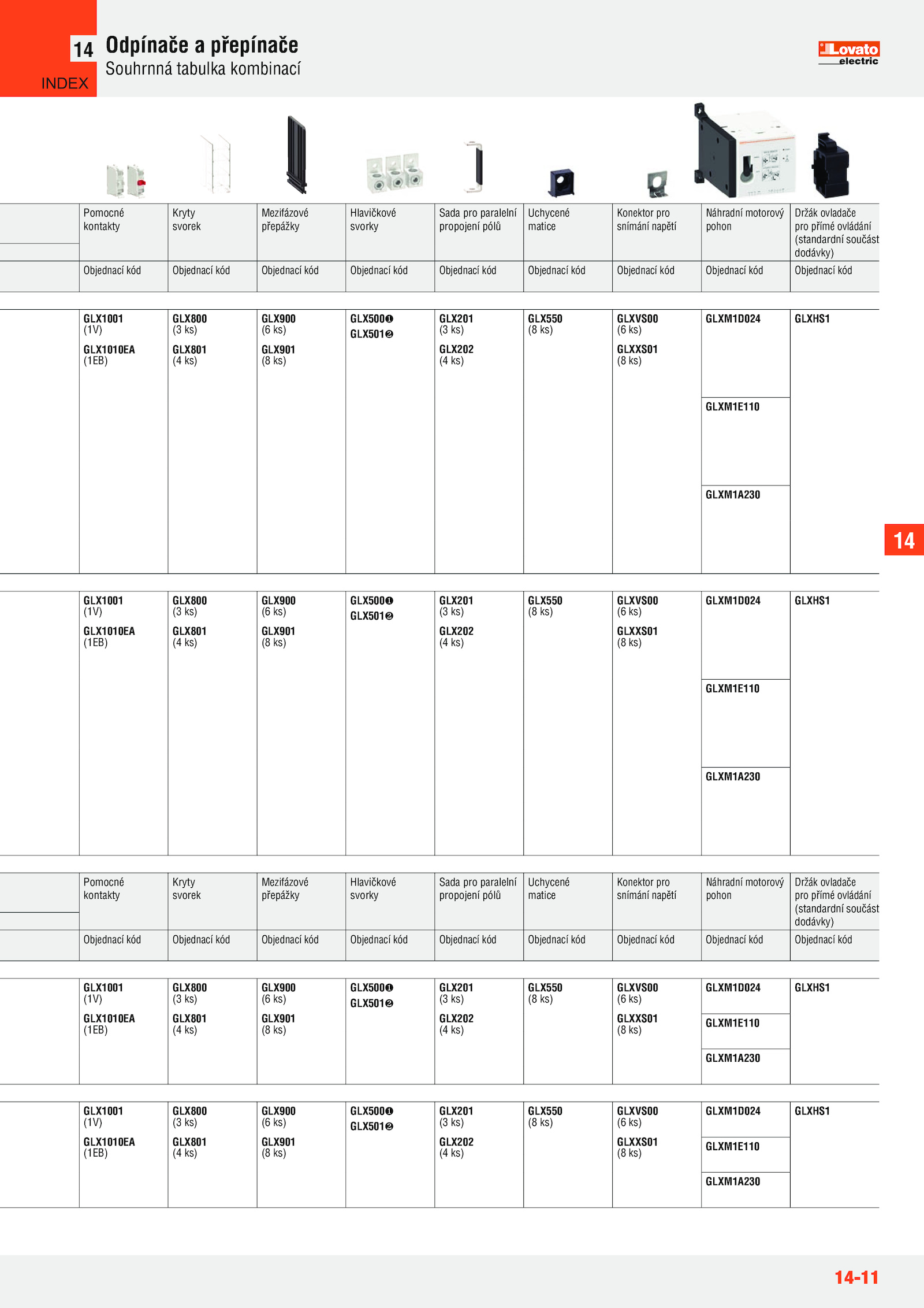 14-11 Odpínače přepínače Souhrnná tabulka kombinací 14 Pomocné kontakty Kryty svorek Mezifázové přepážky Hlavičkové svorky Sada pro paralelní propojení pólů Uchycené matice Konektor pro snímání napětí Náhradní motorový pohon Držák ovladače pro přímé ovládání (standardní součást dodávky) Objednací kód Objednací kód Objednací kód Objednací kód Objednací kód Objednací kód Objednací kód Objednací kód Objednací kód GLX1001 (1V) GLX1010EA (1EB) GLX800 (3 ks) GLX801 (4 ks) GLX900 (6 ks) GLX901 (8 ks) GLX500 GLX501 GLX201 (3 ks) GLX202 (4 ks) GLX550 (8 ks) GLXVS00 (6 ks) GLXXS01 (8 ks) GLXM1D024 GLXHS1 GLXM1E110 GLXM1A230 GLX1001 (1V) GLX1010EA (1EB) GLX800 (3 ks) GLX801 (4 ks) GLX900 (6 ks) GLX901 (8 ks) GLX500 GLX501 GLX201 (3 ks) GLX202 (4 ks) GLX550 (8 ks) GLXVS00 (6 ks) GLXXS01 (8 ks) GLXM1D024 GLXHS1 GLXM1E110 GLXM1A230 Pomocné kontakty Kryty svorek Mezifázové přepážky Hlavičkové svorky Sada pro paralelní propojení pólů Uchycené matice Konektor pro snímání napětí Náhradní motorový pohon Držák ovladače pro přímé ovládání (standardní součást dodávky) Objednací kód Objednací kód Objednací kód Objednací kód Objednací kód Objednací kód Objednací kód Objednací kód Objednací kód GLX1001 (1V) GLX1010EA (1EB) GLX800 (3 ks) GLX801 (4 ks) GLX900 (6 ks) GLX901 (8 ks) GLX500 GLX501 GLX201 (3 ks) GLX202 (4 ks) GLX550 (8 ks) GLXVS00 (6 ks) GLXXS01 (8 ks) GLXM1D024 GLXHS1 GLXM1E110 GLXM1A230 GLX1001 (1V) GLX1010EA (1EB) GLX800 (3 ks) GLX801 (4 ks) GLX900 (6 ks) GLX901 (8 ks) GLX500 GLX501 GLX201 (3 ks) GLX202 (4 ks) GLX550 (8 ks) GLXVS00 (6 ks) GLXXS01 (8 ks) GLXM1D024 GLXHS1 GLXM1E110 GLXM1A230 14 INDEX