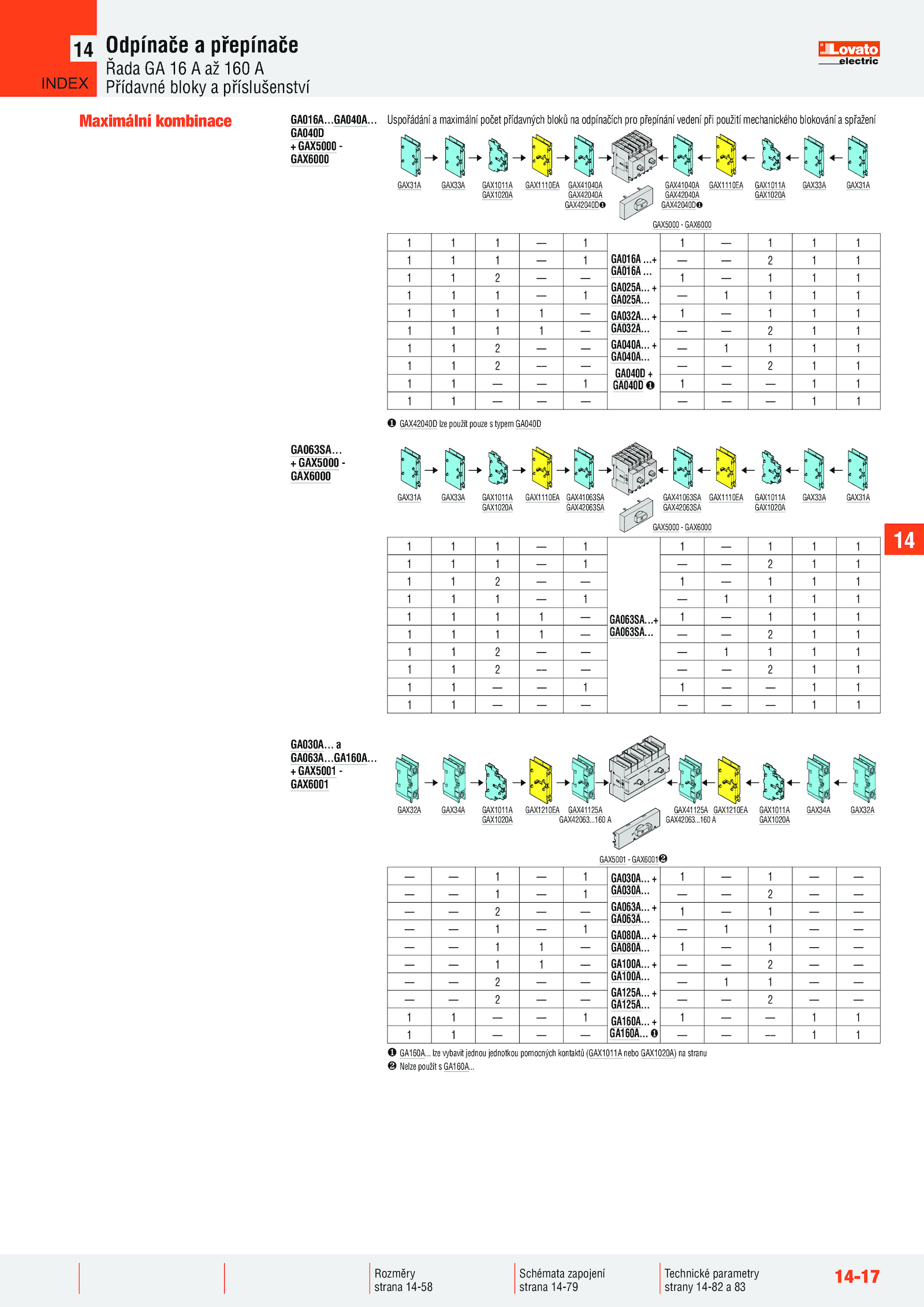 . + GA030A...+ GA016A . + GA063A... + GA100A. + GA040A.. + GA160A.14-17 Odpínače přepínače Řada 160 A Přídavné bloky příslušenství 14 Technické parametry strany 14-82 83 Schémata zapojení strana 14-79 Rozměry strana 14-58 Uspořádání maximální počet přídavných bloků odpínačích pro přepínání vedení při použití mechanického blokování spřažení GAX31A GAX33A GAX1011A GAX1110EA GAX41040A GAX41040A GAX1110EA GAX1011A GAX33A GAX31A GAX1020A GAX42040A GAX42040A GAX1020A GAX42040D GAX42040D GAX5000 GAX6000 GA016A.+ GA025A.. + GA040A..... + GA032A....... + GA125A.. + GA040D + GA040D 1 1 1 1 1 1 1 1 1 1 1 1 1 1 1 1 1 1 1 1 –– GA030A.... + GA100A........ + GA160A... + GA125A.. + GA063A.. + GA025A. 1 1 GA063SA. + GA080A.. a GA063A. GA040D + GAX5000 - GAX6000 GAX31A GAX33A GAX1011A GAX1110EA GAX41063SA GAX41063SA GAX1110EA GAX1011A GAX33A GAX31A GAX1020A GAX42063SA GAX42063SA GAX1020A GAX5000 GAX6000 GA063SA......GA040A.......... lze vybavit jednou jednotkou pomocných kontaktů (GAX1011A nebo GAX1020A) stranu Nelze použít GA160A....GA160A..160 A GAX1020A GAX5001 GAX6001 GA030A.+ 1 1 1 1 1 1 1 1 1 1 1 1 1 1 1 1 1 1 1 1 GAX42040D lze použít pouze typem GA040D 14 INDEX ... + GAX5001 - GAX6001 Maximální kombinace 1 1 GA016A . + GA032A....... + GA080A.+ GA063SA.. 1 –– –– –– –– –– –– –– –– –– –– –– –– –– –– –– 1 1 1 1 GA160A....160 A GAX42063. + GAX5000 - GAX6000 GAX32A GAX34A GAX1011A GAX1210EA GAX41125A GAX41125A GAX1210EA GAX1011A GAX34A GAX32A GAX1020A GAX42063.
