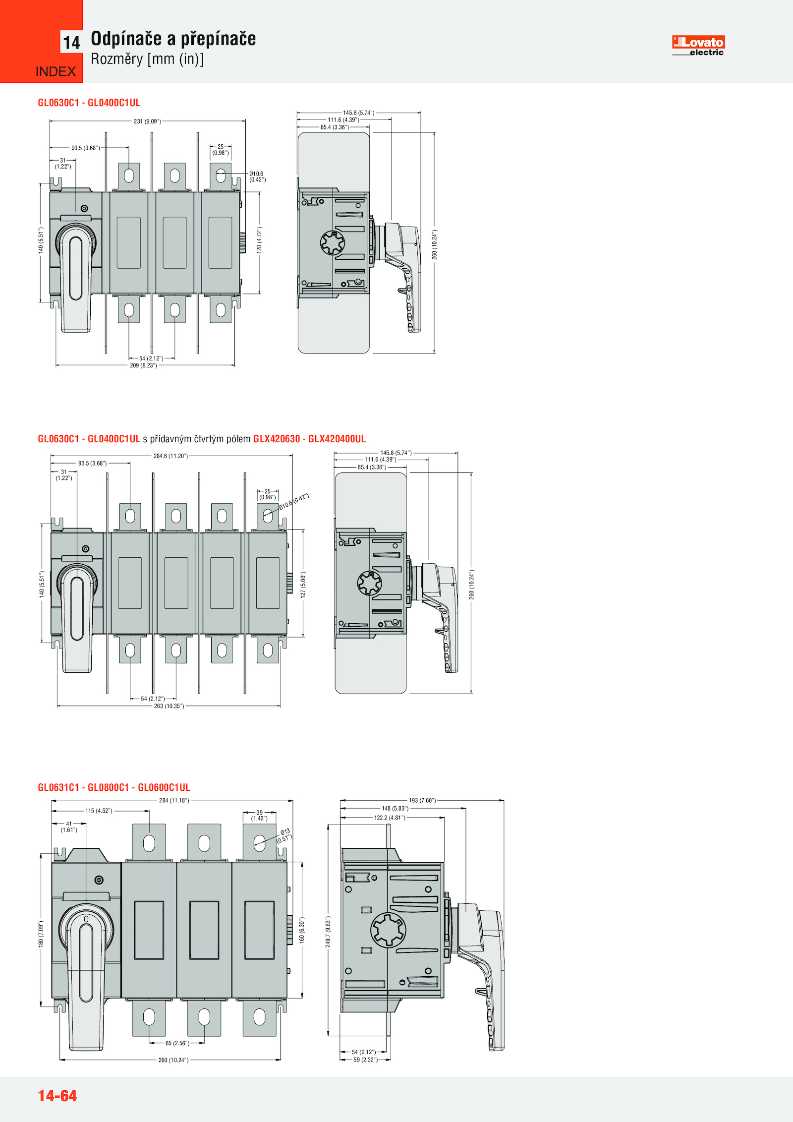 51”) 120 (4.09”) 93.32”) 39 (1.6 (4.6 (0.68”) 31 (1.74”) 111.52”) 41 (1.4 (3.98”) 145.83”) 54 (2.5 (3.68”) 54 (2.81”) 148 (5.42”) 31 (1.8 (5.23”) Ø10.72”) 25 (0.98”) 54 (2.09”) 160 (6.22”) 140 (5.6 (11.7 (9.14-64 Odpínače přepínače Rozměry [mm (in)] 14 GL0631C1 GL0800C1 GL0600C1UL GL0630C1 GL0400C1UL GL0630C1 GL0400C1UL přídavným čtvrtým pólem GLX420630 GLX420400UL 111,1 85,4 260 260 (10.60”) 122.56”) 260 (10.12”) 59 (2.22”) 140 (5.39”) 85.36”) 127 (5.83”) 193 (7.30”) 249.2 (4.36”) 111,1 85,4 260 Ø10.6 (0.12”) 93.42”) 284.24”) 180 (7.4 (3.12”) 209 (8.74”) 111.42”) INDEX .8 (5.18”) 115 (4.51”) 284 (11.6 (4.24”) 231 (9.20”) 263 (10.61”) Ø13 (0.39”) 85.00”) 25 (0.51”) 65 (2.24”) 145.35”) 260 (10.5 (3