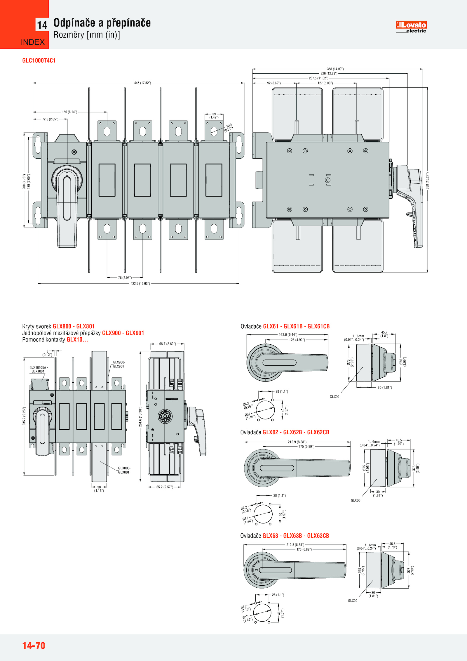 Ovladače GLX61 GLX61B GLX61CB Ovladače GLX62 GLX62B GLX62CB Ovladače GLX63 GLX63B GLX63CB 156 (6.99”) 30 (1.6 (10..7 (1.76”) 180 (7.83”) 127 (5.89”) 45.2 (2.5 (16.04”.99”) Ø4.38”) 175 (6...0.14”) 422.89”) 45.85”) 75 (2.2 (0.18”) 66,7 65.1”) Ø37 (1.1”) Ø37 (1.99”) 212.14-70 Odpínače přepínače Rozměry [mm (in)] 14 GLC1000T4C1 Kryty svorek GLX800 GLX801 Jednopólové mezifázové přepážky GLX900 GLX901 Pomocné kontakty GLX10.24”) 30 (1.95”) 1.46”) 40 (1.5 (2.81”) Ø76 (2.32”) 388 (15.00”) 287.5 (11.30”) 66.16”) 28 (1.7 (2.0.81”) Ø76 (2.27”) 235.81”) 28 (1.24”) 30 (1.52”) 200 (7.95”) Ø76 (2.09”) 92 (3.46”) 40 (1.95”) 1.62”) GLX1010EA - GLX1001 GLX900- GLX901 GLX800- GLX801 163.9 (8..79”) Ø75 (2..44”) 125 (4.1”) Ø37 (1.2 (9.8 (8.16”) 28 (1.8”) Ø4.26”) 3 (0.6mm (0.42”) 358 (14.6mm (0.0..5 (1.16”) Ø75 (2.04”..46”) 40 (1.2 (0.79”) Ø4...5 (1.04”.51”) 39 (1.92”) 45.12”) 30 (1.62”) 326 (12.57”) GLX00 INDEX .2 (0.57”) GLX00 Ø75 (2..95”) Ø13 (0....57”) 261.24”) GLX00 212.09”) 72.6mm (0.63”) 445 (17.6 (6..38”) 175 (6.57”) 1