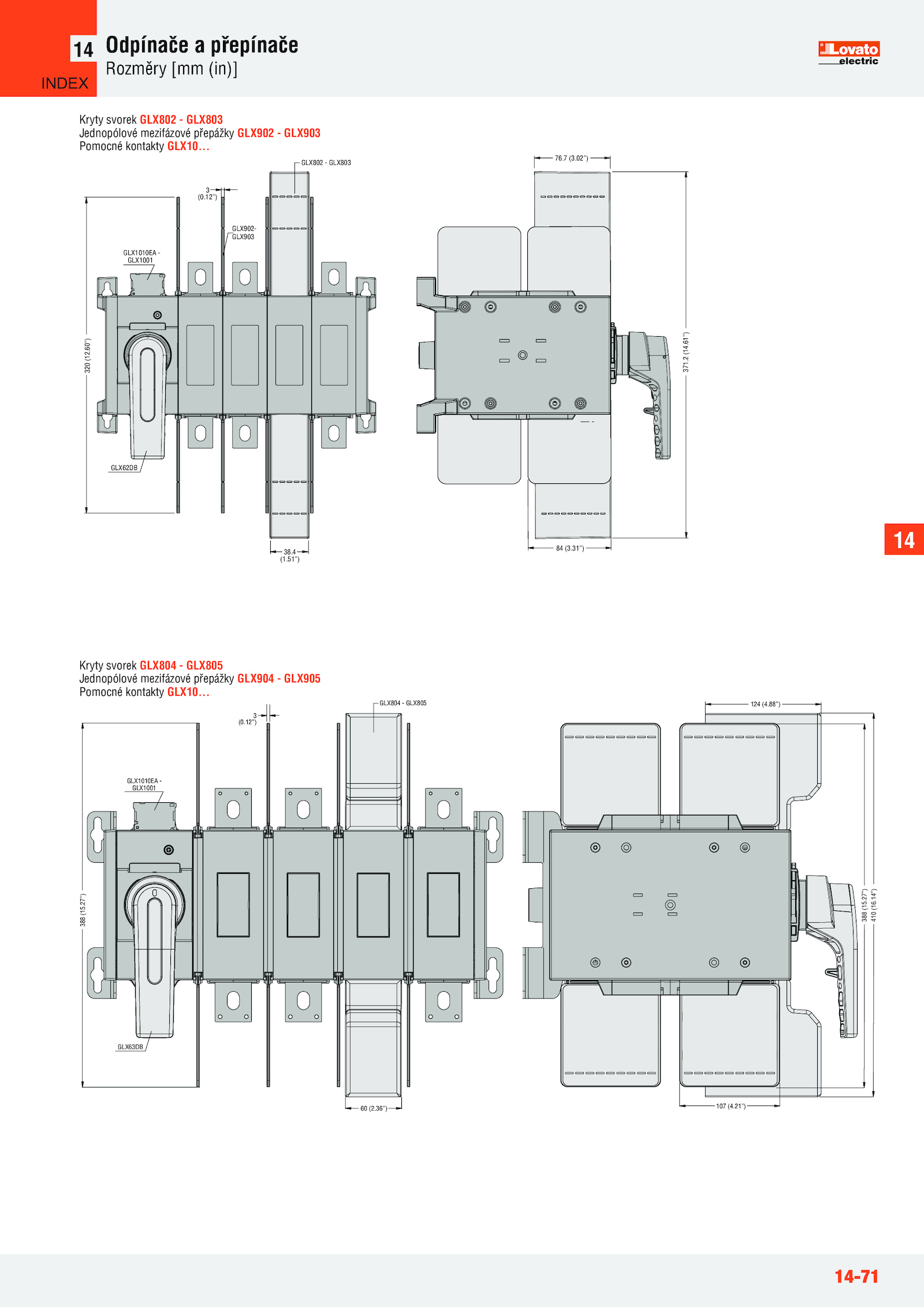 27”) 107 (4.02”) 84 (3.4 (1...31”) GLX62DB GLX1010EA - GLX1001 GLX802 GLX803 GLX902- GLX903 371..88”) 410 (16.14”) 3 (0.7 (3.2 (14. 38. Kryty svorek GLX804 GLX805 Jednopólové mezifázové přepážky GLX904 GLX905 Pomocné kontakty GLX10.60”) 76.12”) 388 (15.36”) 388 (15.21”) 60 (2.12”) GLX63DB GLX804 GLX805 GLX1010EA - GLX1001 14 INDEX .14-71 Odpínače přepínače Rozměry [mm (in)] 14 Kryty svorek GLX802 GLX803 Jednopólové mezifázové přepážky GLX902 GLX903 Pomocné kontakty GLX10..51”) 320 (12.27”) 124 (4.61”) 3 (0