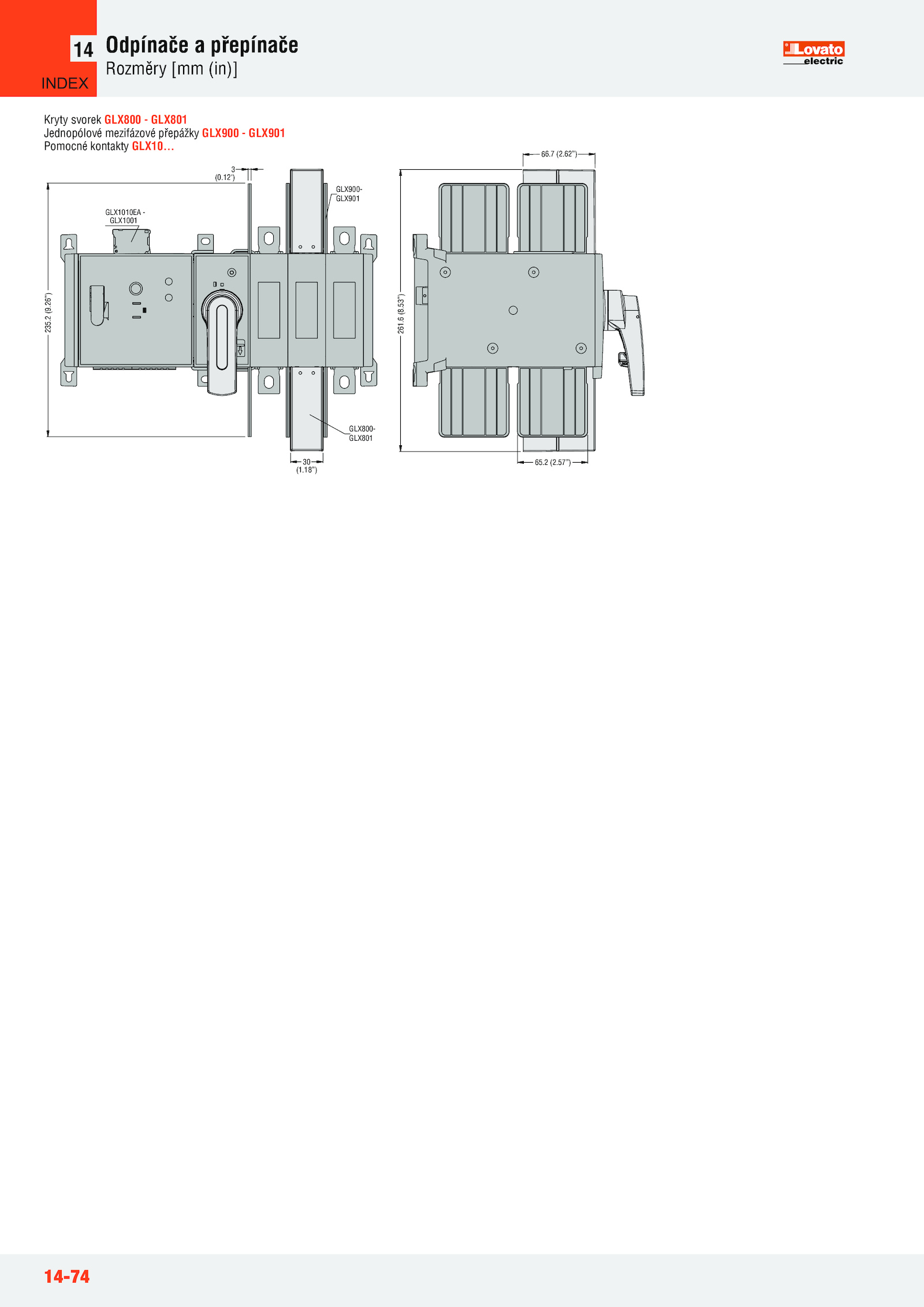 2 (9.26”) 65... 235.18”) 3 (0.53”) 66.6 (8.7 (2.14-74 Odpínače přepínače Rozměry [mm (in)] 14 Kryty svorek GLX800 GLX801 Jednopólové mezifázové přepážky GLX900 GLX901 Pomocné kontakty GLX10.12") GLX1010EA - GLX1001 GLX900- GLX901 GLX800- GLX801 INDEX .2 (2.57”) 261.62”) 30 (1