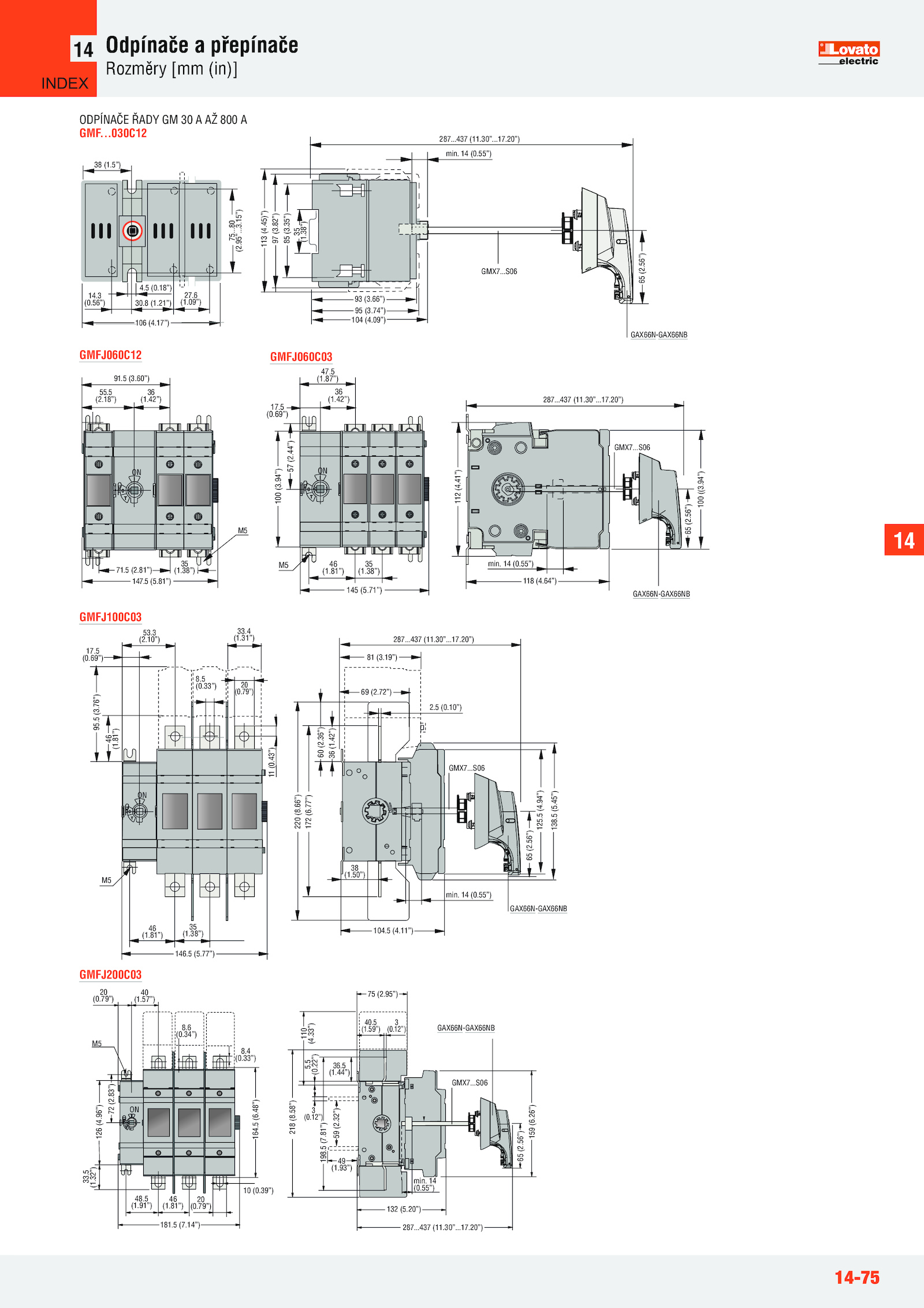69”) 6 (0.5 (1.22”) 59 (2.20”) min.94”) 287.30”.3 (0.5 (7.5 (2.437 (11.96”) O F F ON M5 33.5 (5.41”) 118 (4.81”) 35 (1.30”..30”.42”) 35 (1.5 (1.55”) 65 (2.41”) 118 (4.11”) 125.5 (1..4 (1.17..64”) 100 (3.5 (2.26”) 3 (0...6 (1.5 (1.34”) 8.437 (11.55”) 65 (2.5 (5.14”) 20 (0.56”) GMX7. (0..30”.72”) 60 (2.39”) 164.5 (0..91”) 46 (1.66”) 172 (6.42”) M5 71.3.17.S06 GMX7.437 (11...42”) 2.. 14 (0.6 (0.20”) min.32”) 48.5 (1..4 (0.14-75 Odpínače přepínače Rozměry [mm (in)] 14 ODPÍNAČE ŘADY 800 A GMF_030C12 95 (3.55”) 65 (2.4 (0. (0.50”) 220 (8.17.437 (11.5 (6.17”) 75.20”) min..30”...5 (5. (0..38”) 146.77”) 104..5 (0...32”) 48.55”) 65 (2.94”) 57 (2.5 (5.5 (4.5 (0..58”) 75 (2..30”.64”) 100 ((3.5 (4.59”) 36.12”) GAX66N-GAX66NB 10 (0.S06 FJ060C12 46 (1.20”) min.81”) 181.94”) 138.5 (5.77”) 104.S06 GMX7...94”) 287.33”) 5..30”..81”) 112 (4.19”) 69 (2..38”) 147.56”) GMX7.5 (3.14”) 20 (0.21”) 27..55”) 65 (2..38”) GMX7.59”) 36.72”) 60 (2.5 (3.44”) 47.93”) 3 (0.5 (6.79”) 8.5 (4.18”) 36 (1.5 (1.18”) 36 (1.17.5 (1.31”) 20 (0.5 (0.76”) 46 (1.5 (5.81”) 181.32”) 49 (1..20”) 198.77”) M5 81 (3...66”) 113 (4.81”) 40.17.437 (11.S06 GMFJ060C03 46 (1..45”) 33.64”) 100 ((3.79”) 40 (1.80 (2..5 (4.6 (0.55”) 65 (2.5”) 4.81”) 112 (4..09”) 287.94”) 57 (2.30”..56”) 30.20”) min.S06 GMFJ200C03 14 INDEX .10”) 11 (0.56”) GMX7.56”) 112 (4.43”) 46 (1.64”) 100 ((3.57”) 72 (2.50”) 220 (8.43”) 46 (1..12”) 218 (8..79”) 287.81”) 35 (1.57”) 72 (2.5 (0.3 (2.31”) 20 (0.64”) 100 (3..24”) M5 GAX66N-GAX66NB 91.38”) 146.81”) 35 (1.81”) 17.17.60”) 55..17.81”) 40.20”) 35 (1.81”) ) 53.42”) M5 71.71”) O F F ON 100 (3..15”) 93 (3.71”) O F F ON 100 (3.33”) 20 (0.95”.56”) 36 (1.79”) 287.12”) GAX66N-GAX66NB 10 (0.56”) 112 (4.17..20”) min. (0.79”) 8.44”) 159 (6. 14 (0.20”) min.56”) GMX7.33”) 20 (0..55”) 65 (2.3 (2.35”) 97 (3.94”) 287.56”) (1.437 (11.437 (11.69”) 6 (0.030C12 GMFJ060C12 46 (1.42”) 2.19”) 69 (2..33”) 5.5 (2.42”) 35 (1.5 (5.83”) 126 (4.39”) 164.. (0.5 (0.91”) 46 (1...81”) 145 (5.20”) min.S06 95.18”) 14.5 (7..42”) M5 71.30”.5 (2.38”) 147..55”) 65 (2.38”) GMX7.17.55”) 65 (2...74”) 104 (4.17.82”) 38 (1.20”) min..5 (1.20”) 198.95”) 110 (4.94”) O F F ON GAX66N-GAX66NB 287.96”) O F F ON M5 33.48”) 8.55”) 65 (2..42”) 35 (1.58”) 75 (2..24”) M5 GAX66N-GAX66NB 91.66”) 172 (6.60”) 55.38”) 147.45)”) min.64”) 100 (3.S06 GAX66N-GAX66NB Fusible disconnect switches (UL98) Fusible disconnect switches (UL98) GMF.94”) O F F ON GAX66N-GAX66NB 287...32”) 49 (1.79”) 40 (1.69”) 53.4 (1. (0.5 (0.83”) 126 (4.437 (11.09”) 106 (4..95”) 110 (4.34”) 8... (0...22”) 59 (2.48”) 8.11”) 125.81”) 35 (1.24”) M5 GAX66N-GAX66NB 91.S06 GMFJ060C12 GMFJ060C03 GMFJ060C12 46 (1.17.81”) 145 (5...38”) GMX7.5 (3.81”) 112 (4.20”) min.18”) 36 (1.10”) 11 (0.437 (11.77”) M5 81 (3..94”) O F F ON GAX66N-GAX66NB 287.41”) 118 (4.56”) GMX7..55”) 65 (2.36”) 36 (1.56”) (1.5 (7.60”) 55.S06 GMX7.44”) 17.81”) 35 (1.5 (3..38”) 85 (3..71”) O F F ON 100 (3..5 (1.12”) 218 (8.41”) 118 (4.10”) 38 (1.81”) 145 (5.93”) 3 (0.44”) 17.S06 GMFJ100C03 132 (5. (0.5 (2. (0.30”..5 (0.33”) O F F ON GAX66N-GAX66NB 287.87”) 17.10”) 38 (1.36”) 36 (1.44”) 159 (6.437 (11.8 (1.33”) O F F ON GAX66N-GAX66NB 287...45”) 33.56”) 112 (4.94”) 57 (2.5 (0..41”) 118 (4.30”.S06 132 (5..437 (11.5 (0.94”) 138.5 (7..26”) 3 (0.69”) 6 (0.41”) 118 (4.5 (0.5 (2