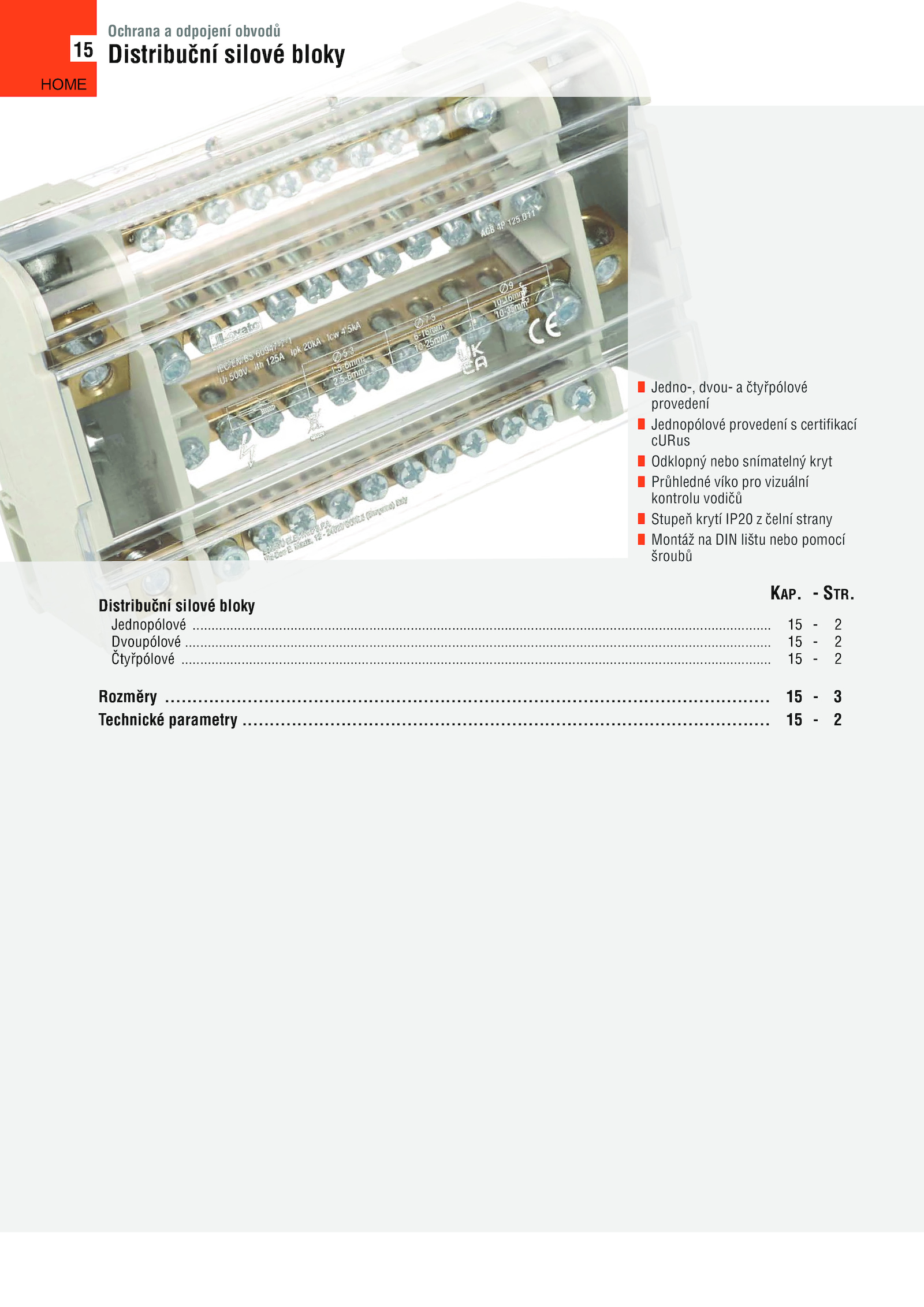 ........................................................................................................................ Distribuční silové bloky Jednopólové ........... 2 HOME .. 2 Rozměry ....... 2 Čtyřpólové ................................................................................... 2 Dvoupólové .................................................................................................................................................................................................................................................15 Ochrana odpojení obvodů Distribuční silové bloky Jedno-, dvou- čtyřpólové provedení Jednopólové provedení certifikací cURus Odklopný nebo snímatelný kryt Průhledné víko pro vizuální kontrolu vodičů Stupeň krytí IP20 čelní strany Montáž DIN lištu nebo pomocí šroubů KAP............................ ................................................................ ................................................................................. STR........... 3 Technické parametry ................................