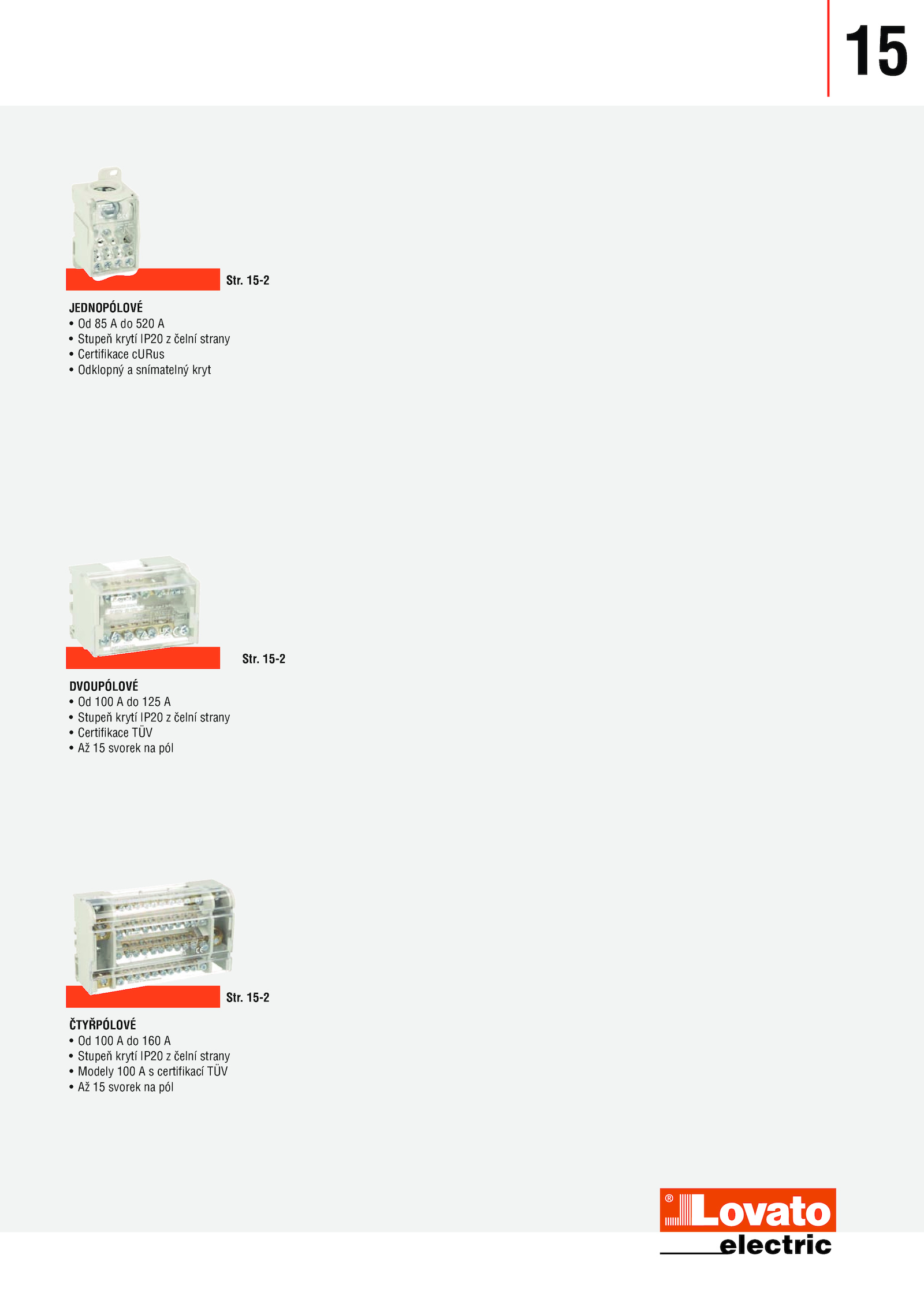 15-2 . 15-2 DVOUPÓLOVÉ • 100 125 A • Stupeň krytí IP20 čelní strany • Certifikace TÜV • svorek pól Str. 15-2 ČTYŘPÓLOVÉ • 100 160 A • Stupeň krytí IP20 čelní strany • Modely 100 certifikací TÜV • svorek pól Str.15 JEDNOPÓLOVÉ • 520 A • Stupeň krytí IP20 čelní strany • Certifikace cURus • Odklopný snímatelný kryt Str