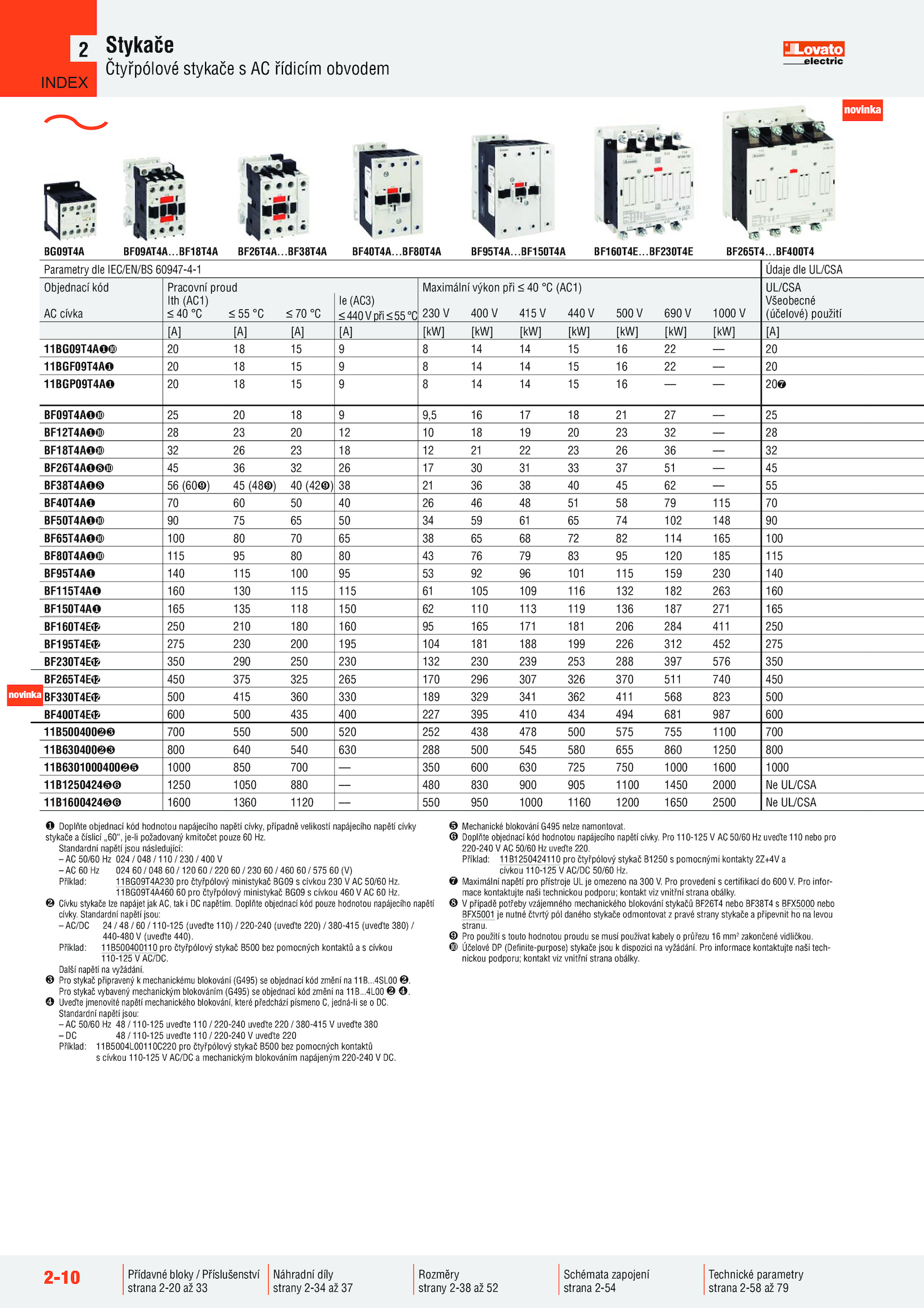 4L00 ..BF18T4A BF160T4E. Příklad: 11B1250424110 pro čtyřpólový stykač B1250 pomocnými kontakty 2Z+4V a cívkou 110-125 AC/DC 50/60 Hz.. Pro 110-125 50/60 uveďte 110 nebo pro 220-240 50/60 uveďte 220. Pro informace kontaktujte naši tech- nickou podporu; kontakt viz vnitřní strana obálky.BF38T4A 2-10 Stykače Čtyřpólové stykače řídicím obvodem 2 Přídavné bloky Příslušenství strana 2-20 33 Technické parametry strana 2-58 79 Schémata zapojení strana 2-54 Rozměry strany 2-38 52 Náhradní díly strany 2-34 37 Doplňte objednací kód hodnotou napájecího napětí cívky, případně velikostí napájecího napětí cívky stykače číslicí „60“, je-li požadovaný kmitočet pouze Hz... Standardní napětí jsou: – 50/60 110-125 uveďte 110 220-240 uveďte 220 380-415 uveďte 380 – 110-125 uveďte 110 220-240 uveďte 220 Příklad: 11B5004L00110C220 pro čtyřpólový stykač B500 bez pomocných kontaktů s cívkou 110-125 AC/DC mechanickým blokováním napájeným 220-240 DC. Pro stykač připravený mechanickému blokování (G495) objednací kód změní 11B.. novinka Parametry dle IEC/EN/BS 60947-4-1 Údaje dle UL/CSA Objednací kód AC cívka Pracovní proud Maximální výkon při (AC1) UL/CSA Všeobecné (účelové) použití Ith (AC1) ≤ °C Ie (AC3) ≤440Vpři≤55°C 230 400 415 440 500 690 1000 V [A] [A] [A] [A] [kW] [kW] [kW] [kW] [kW] [kW] [kW] [A] 11BG09T4A 20 11BGF09T4A 20 11BGP09T4A 20 BF09T4A 9,5 25 BF12T4A 28 BF18T4A 32 BF26T4A 45 BF38T4A (60) (48) (42) 55 BF40T4A 115 70 BF50T4A 102 148 90 BF65T4A 100 114 165 100 BF80T4A 115 120 185 115 BF95T4A 140 115 100 101 115 159 230 140 BF115T4A 160 130 115 115 105 109 116 132 182 263 160 BF150T4A 165 135 118 150 110 113 119 136 187 271 165 BF160T4E12 250 210 180 160 165 171 181 206 284 411 250 BF195T4E12 275 230 200 195 104 181 188 199 226 312 452 275 BF230T4E12 350 290 250 230 132 230 239 253 288 397 576 350 BF265T4E12 450 375 325 265 170 296 307 326 370 511 740 450 BF330T4E12 500 415 360 330 189 329 341 362 411 568 823 500 BF400T4E12 600 500 435 400 227 395 410 434 494 681 987 600 11B500400 700 550 500 520 252 438 478 500 575 755 1100 700 11B630400 800 640 540 630 288 500 545 580 655 860 1250 800 11B6301000400 1000 850 700 350 600 630 725 750 1000 1600 1000 11B1250424 1250 1050 880 480 830 900 905 1100 1450 2000 UL/CSA 11B1600424 1600 1360 1120 550 950 1000 1160 1200 1650 2500 UL/CSA novinka INDEX . Uveďte jmenovité napětí mechanického blokování, které předchází písmeno jedná-li DC.... Další napětí vyžádání.BF400T4 BF95T4A. Účelové (Definite-purpose) stykače jsou dispozici vyžádání. Maximální napětí pro přístroje omezeno 300 Pro provedení certifikací 600 Pro infor- mace kontaktujte naši technickou podporu; kontakt viz vnitřní strana obálky.. Standardní napětí jsou: – AC/DC 110-125 (uveďte 110) 220-240 (uveďte 220) 380-415 (uveďte 380) / 440-480 (uveďte 440). Mechanické blokování G495 nelze namontovat. Doplňte objednací kód pouze hodnotou napájecího napětí cívky. případě potřeby vzájemného mechanického blokování stykačů BF26T4 nebo BF38T4 BFX5000 nebo BFX5001 nutné čtvrtý pól daného stykače odmontovat pravé strany stykače připevnit levou stranu.. Cívku stykače lze napájet jak AC, tak napětím.4SL00 .... Standardní napětí jsou následující: – 50/60 024 048 110 230 400 V – 024 048 120 220 230 460 575 (V) Příklad: 11BG09T4A230 pro čtyřpólový ministykač BG09 cívkou 230 50/60 Hz.BF150T4A BF26T4A.. Pro použití touto hodnotou proudu musí používat kabely průřezu mm2 zakončené vidličkou. Doplňte objednací kód hodnotou napájecího napětí cívky. Pro stykač vybavený mechanickým blokováním (G495) objednací kód změní 11B. Příklad: 11B500400110 pro čtyřpólový stykač B500 bez pomocných kontaktů cívkou 110-125 AC/DC.BF230T4E BF265T4..BF80T4A BF09AT4A.BG09T4A BF40T4A.. 11BG09T4A460 pro čtyřpólový ministykač BG09 cívkou 460 Hz