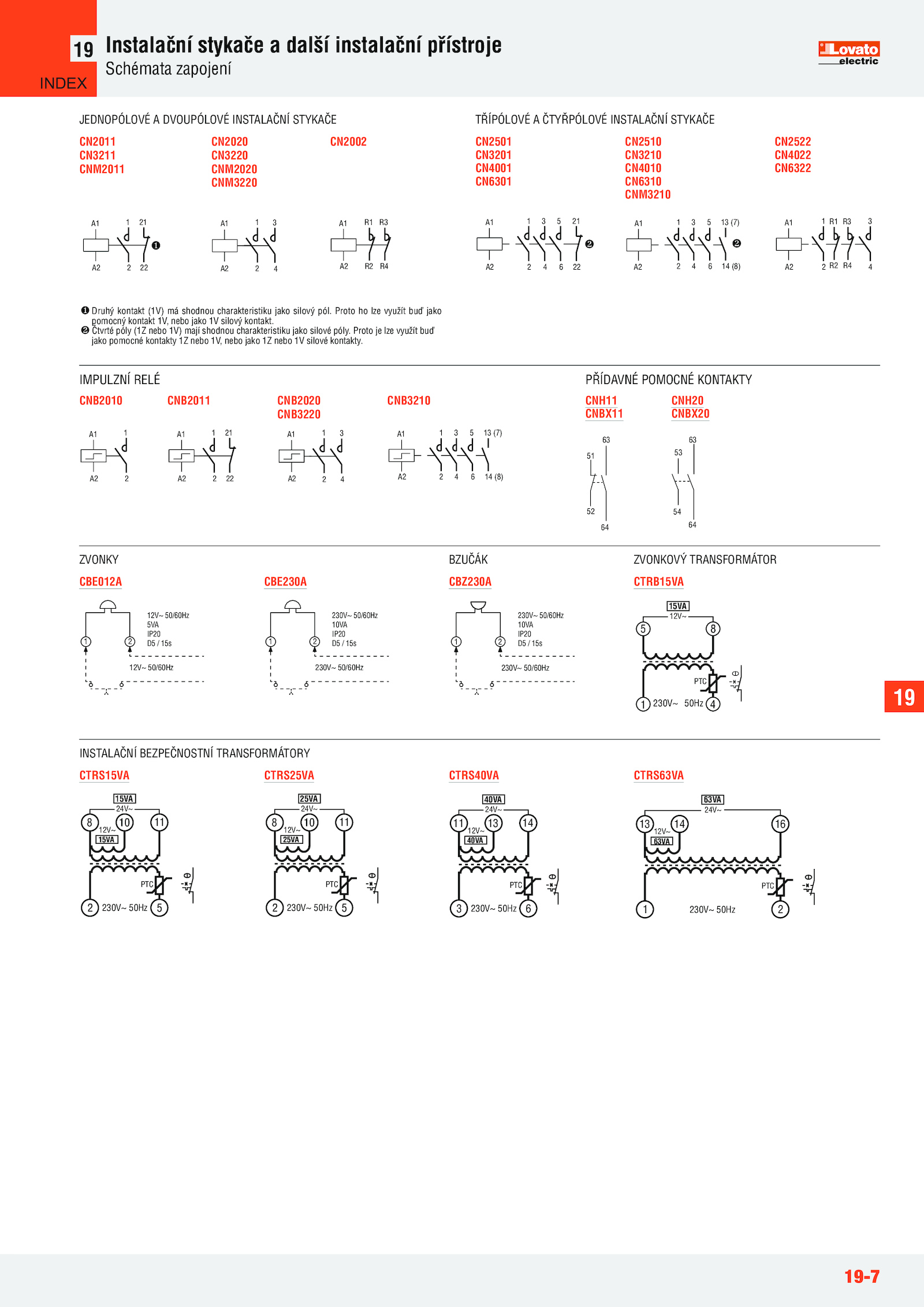 Proto lze využít buď jako pomocné kontakty nebo 1V, nebo jako nebo silové kontakty. Proto lze využít buď jako pomocný kontakt 1V, nebo jako silový kontakt. INSTALAČNÍ BEZPEČNOSTNÍ TRANSFORMÁTORY INDEX .19 19-7 Instalační stykače další instalační přístroje Schémata zapojení 19 21 1 A1 2 22 A2 21 5 3 1 A1 2 22 A2 A1 A2 1 (7) 14 (8) 6 4 2 63 51 64 52 1 A1 2 A2 53 63 54 64 CN2501 CN3201 CN4001 CN6301 CN2510 CN3210 CN4010 CN6310 CNM3210 3 1 A1 2 4 A2 R1 R3 R4 R2 CN2522 CN4022 CN6322 CN2011 CN3211 CNM2011 1 A1 2 A2 3 4 CN2020 CN3220 CNM2020 CNM3220 R1 R3 R4 R2 A1 A2 CN2002 CNH11 CNBX11 CNH20 CNBX20 PŘÍDAVNÉ POMOCNÉ KONTAKTY CNB2010 12V~ 50/60Hz 5VA IP20 D5 15s 12V~ 50/60Hz 1 2 CBE012A 8 230V~ 50Hz PTC 12V~ 8 5 4 1 15VA 40°C/E ta CTRB15VA 15VA 10 10 11 8 2 2 5 15VA 12V~ 230V~ 50Hz PTC 25°C/E ta 24V~ CTRS15VA 25VA 10 10 11 8 2 2 5 25VA 12V~ 230V~ 50Hz PTC 25°C/E ta 24V~ CTRS25VA 40VA 13 14 11 3 6 40VA 12V~ 230V~ 50Hz PTC 25°C/E ta 24V~ CTRS40VA 1 2 63VA 12V~ 230V~ 50Hz PTC 25°C/E ta 24V~ 63VA 14 13 16 CTRS63VA 1 2 230V~ 50/60Hz 10VA IP20 D5 15s 230V~ 50/60Hz CBE230A 230V~ 50/60Hz 10VA IP20 D5 15s 230V~ 50/60Hz 1 2 CBZ230A 21 1 2 22 A1 A2 CNB2011 1 2 3 4 A1 A2 CNB2020 CNB3220 1 (7) 14 (8) 6 4 2 A1 A2 CNB3210 IMPULZNÍ RELÉ JEDNOPÓLOVÉ DVOUPÓLOVÉ INSTALAČNÍ STYKAČE TŘÍPÓLOVÉ ČTYŘPÓLOVÉ INSTALAČNÍ STYKAČE ZVONKY BZUČÁK ZVONKOVÝ TRANSFORMÁTOR Druhý kontakt (1V) shodnou charakteristiku jako silový pól. Čtvrté póly (1Z nebo 1V) mají shodnou charakteristiku jako silové póly