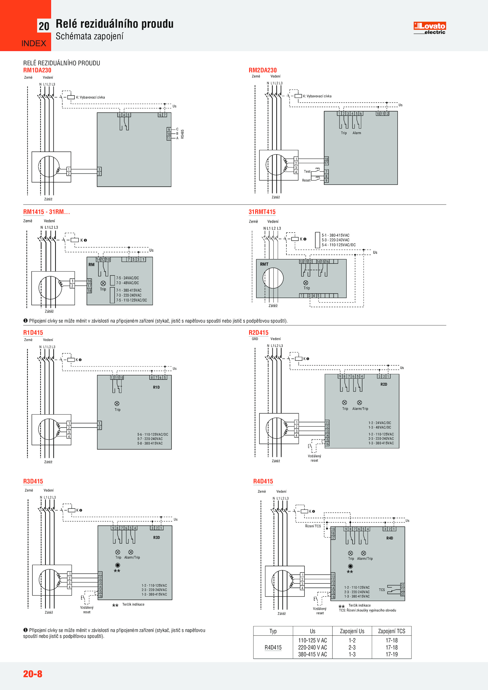 R4D415 RM2DA230 31RMT415 R1D415 R3D415 R2D415 Připojení cívky může měnit závislosti připojeném zařízení (stykač, jistič napěťovou spouští nebo jistič podpěťovou spouští)... Připojení cívky může měnit závislosti připojeném zařízení (stykač, jistič napěťovou spouští nebo jistič podpěťovou spouští).20-8 Relé reziduálního proudu Schémata zapojení 20 3 6 Us 1 2 1 2 Země Vedení Zátěž N L1L2 L3 7 9 10 11 C B A RS485 K: Vybavovací cívka 1 12 Trip Us 18 17 7 8 9 1 2 3 4 Země Vedení Zátěž N L1L2 L3 6 Alarm Test Reset K: Vybavovací cívka RM1DA230 RM1415 31RM. RELÉ REZIDUÁLNÍHO PROUDU Typ Zapojení Zapojení TCS R4D415 110-125 AC 220-240 AC 380-415 AC 1-2 2-3 1-3 17-18 17-18 17-19 12 6 Trip Us 1 2 1 2 3 4 Země Vedení Zátěž N L1L2 L3 5-6 110-125VAC/DC 5-7 220-240VAC 5-8 380-415VAC R1D 5 1 Trip Us 11 12 13 14 15 16 1 2 3 4 GRD Vedení Zátěž Vzdálený reset N L1L2 L3 1-2 24VAC/DC 1-3 48VAC/DC 1-2 110-125VAC 2-3 220-240VAC 1-3 380-415VAC R2D 4 Alarm/Trip 9 1 Us 11 12 13 14 15 16 1 2 3 4 Země Vedení Zátěž Vzdálený reset ** N L1L2 L3 Trip Alarm/Trip 4 ** 1-2 110-125VAC 2-3 220-240VAC 1-3 380-415VAC Terčík indikace R3D 9 1 Us 11 12 13 14 15 16 1 2 3 4 Země Vedení Zátěž Vzdálený reset ** N L1L2 L3 Trip Alarm/Trip 1-2 110-125VAC 2-3 220-240VAC 1-3 380-415VAC R4D 4 19 18 17 22 2120 TCS Řízení TCS ** Terčík indikace TCS: Řízení zkoušky vypínacího obvodu 14 1 Us 16 17 18 1 2 Země Vedení Zátěž 7 Trip N L1L2 L3 7-5 24VAC/DC 7-3 48VAC/DC 7-1 380-415VAC 7-3 220-240VAC 7-5 110-125VAC/DC RM Země Vedení Zátěž 10 16 15 4 1 5 Us N L3 Trip 5-1 380-415VAC 5-3 220-240VAC 5-4 110-125VAC/DC RMT INDEX