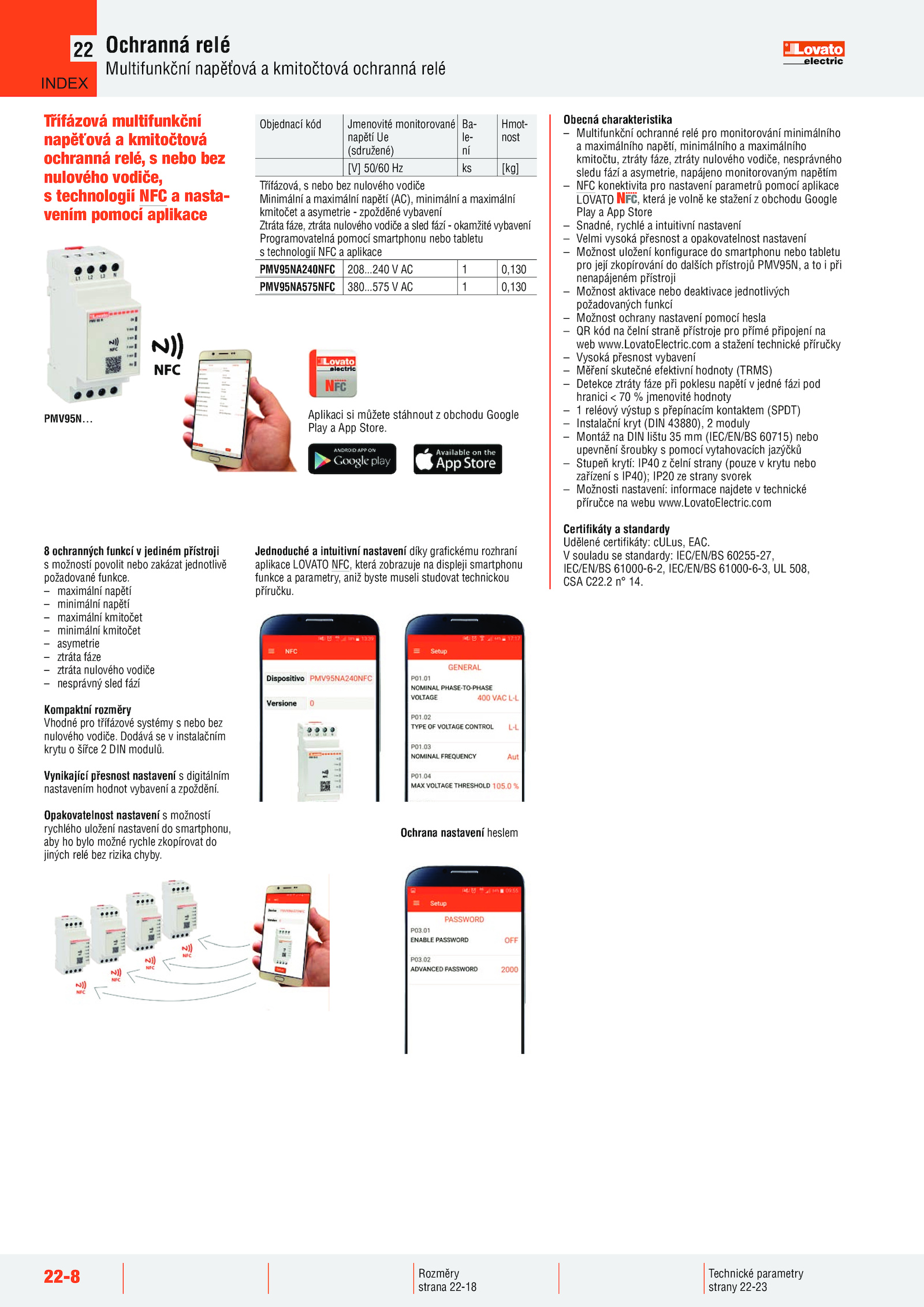 aplikace LOVATO NFC, která zobrazuje displeji smartphonu