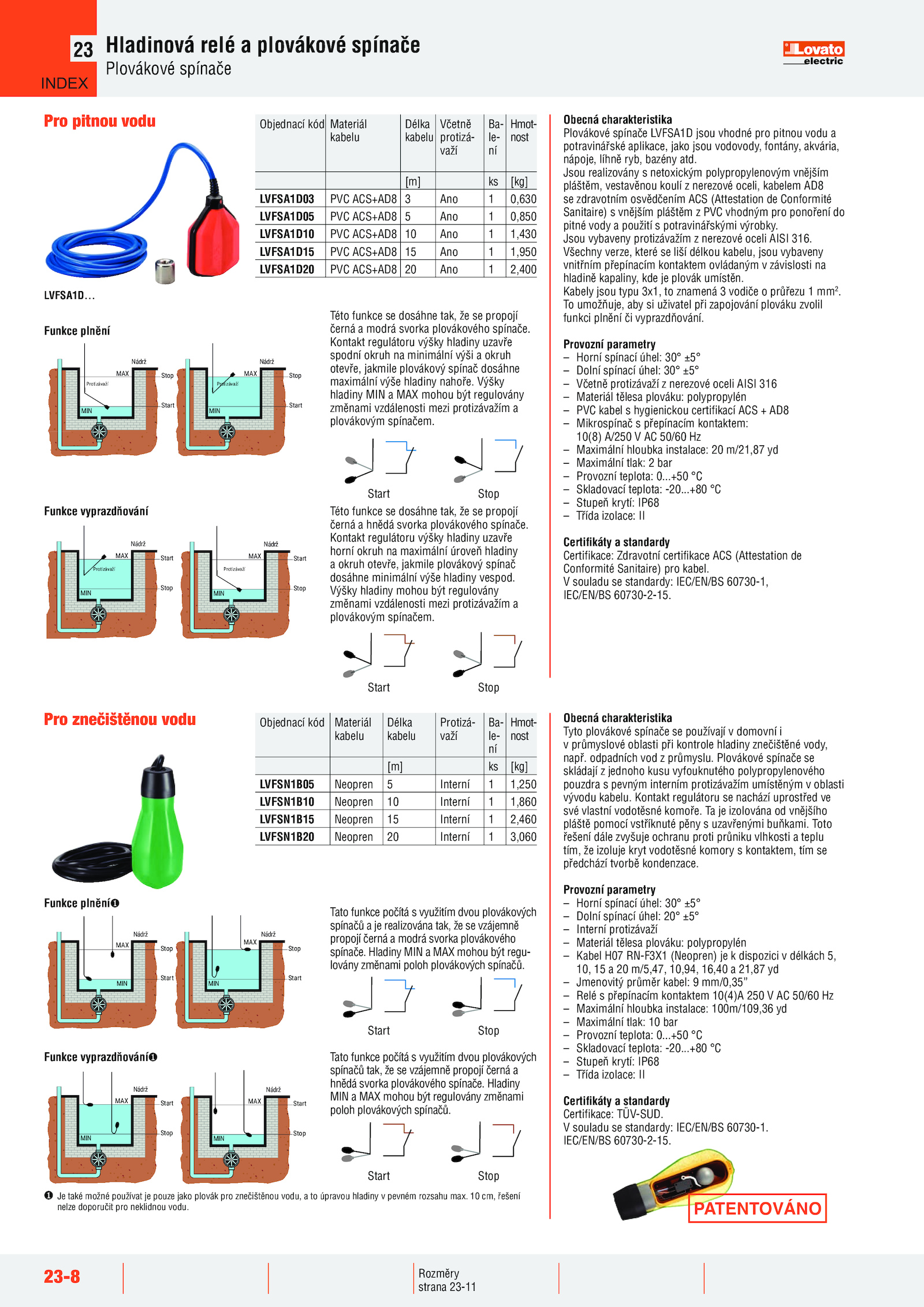Plovákové spínače LVFSA1D jsou vhodné pro pitnou vodu a