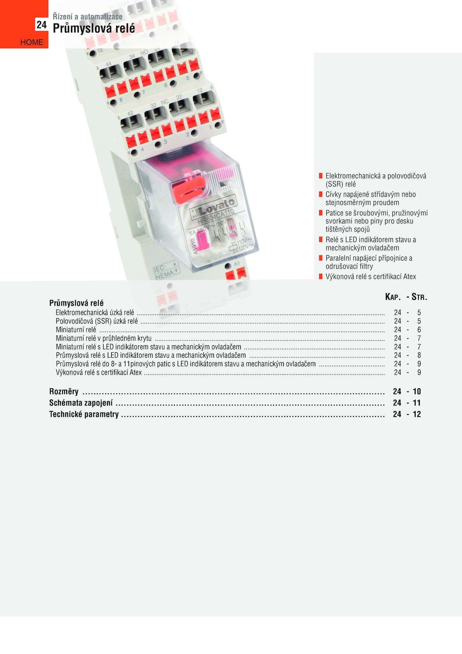 ........ 8 Průmyslová relé 11pinových patic LED indikátorem stavu mechanickým ovladačem ................................................. 9 Rozměry .................................................................................................... 6 Miniaturní relé průhledném krytu .......................................................................................................... STR.......................................... 7 Průmyslová relé LED indikátorem stavu mechanickým ovladačem ......................................................................................................................................... 9 Výkonová relé certifikací Atex ................................................ .. 10 Schémata zapojení ............... Průmyslová relé Elektromechanická úzká relé .......................................................... 5 Miniaturní relé ............................................................................................................................................................................................................................... 7 Miniaturní relé LED indikátorem stavu mechanickým ovladačem .................................. 5 Polovodičová (SSR) úzká relé ................................................................................................................................................................ 12 24 Elektromechanická polovodičová (SSR) relé Cívky napájené střídavým nebo stejnosměrným proudem Patice šroubovými, pružinovými svorkami nebo piny pro desku tištěných spojů Relé LED indikátorem stavu a mechanickým ovladačem Paralelní napájecí přípojnice a odrušovací filtry Výkonová relé certifikací Atex Řízení automatizace Průmyslová relé HOME ..........................................................................................................................KAP...................................................................... 11 Technické parametry ...................................