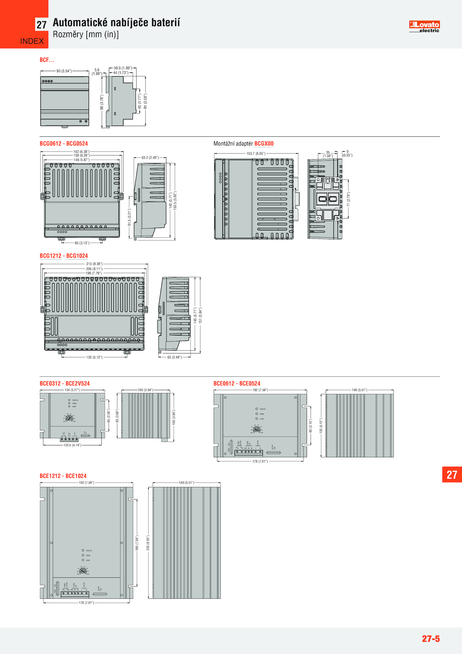 162 (6.58”) 96 (3.6 (1.51”) 192 (7..78”) BCF.01”) 80 (3.49”) 81.6 (1.79”) 130 (5.27”) 100 (3.99”) (1.92”) BCG0612 BCG0524 153.87”) 80 (3.94”) 100 (3.26”) 149 /5.51”) 192 (7.48”) 145 (5.71”) 150.12”) BCE0612 BCE0524 FUSE POWER POWER 220-240V NC COM OUT ALARM NO - - BATTERY + + BATTERY FUSE 60 50 30% 40 70 100% 90 80 POWER ON ALARM CHARGE 178 (7.77”) 91 (3.15”) 130 (5.5 (3.73”) 45 (1.71”) 151 (5.12”) (2.5 (5.11”) 198 (7.2 (2.66”) BCE0312 BCE2V524 BCE 0612 BCE 0524 220-240V COM POWER FUSE POWER - - OUT NC ALARM NO + + BATTERY FUSE BATTERY 60 40 30% 50 80 70 100% 90 POWER ON CHARGE ALARM 140 (5.5 (4..38”) 206 (8.21”) 145 (5.05”) 35 (1.15”) 63.79”) Montážní adaptér BCGX00 213 (8.38”) 9 (0.01”) 140 (5.05”) BCE1212 BCE1024 90 (3.27 27-5 Automatické nabíječe baterií Rozměry [mm (in)] 27 BCE 0312 BCE 2V524 70 - - ALARM OUT 220-240V POWER 30% 60 40 50 + + - - BATTERY 100% FUSE BATTERY ALARM 80 90 POWER ON CHARGE 134 (5.99”) 5.56”) 180 (7.94”) 120.09”) 230 (9.7 (6.94”) BCG1212 BCG1024 INDEX .54”) 50.35”) 71 (2.38”) 159 (6.56”) 178 (7.74”) 65 (2.56”) 93 (3