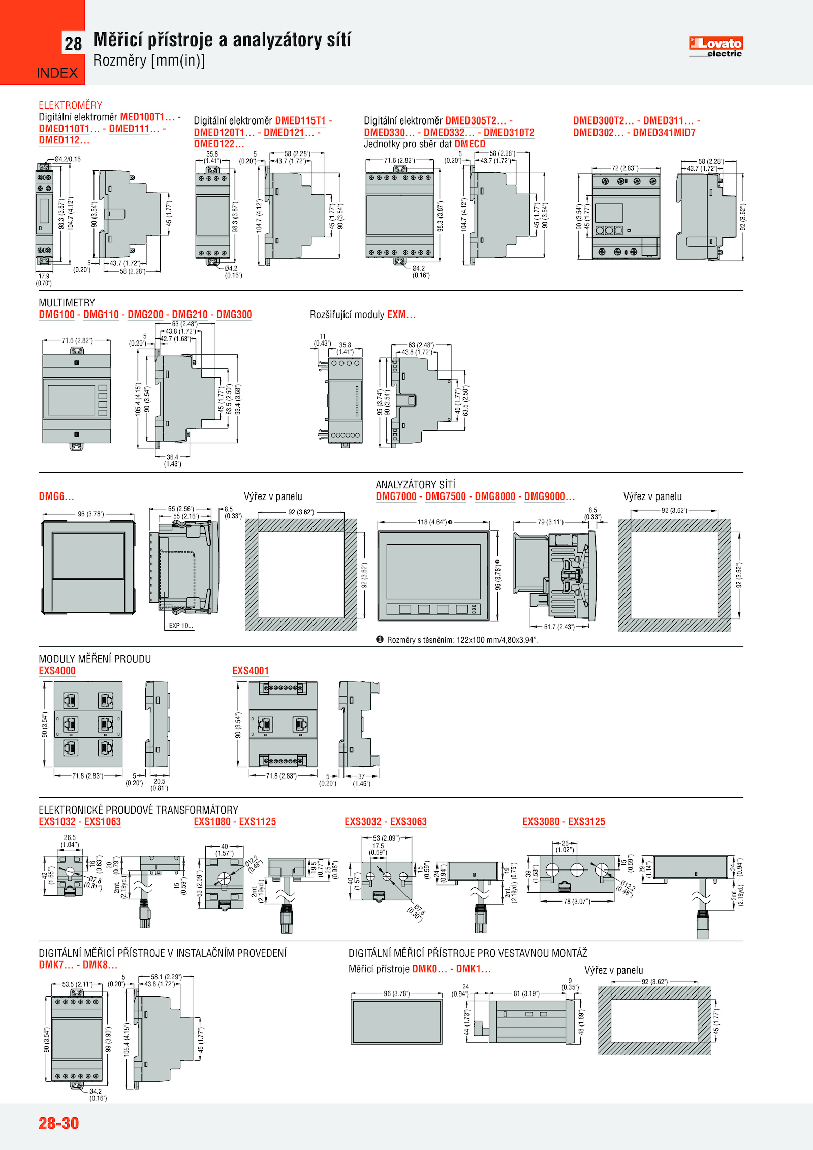 50") 93.12") 98.....20") 45 (1.94”) 29 (1.4 (4.8 (2.62”) 90 (3.72") 58 (2.53”) 78 (3.) 24 (0. DMG 600 DMG 600 EXP 10. (2.77") 63. - DMED112.5 (1... DMED121..8 (1. Výřez panelu Výřez panelu 96 (3.5 (0.73") DIGITÁLNÍ MĚŘICÍ PŘÍSTROJE PRO VESTAVNOU MONTÁŽ Měřicí přístroje DMK0.2 (0.19yd.1 (2. (2. (2.07”) 2mt.75”) Ø12.8 (1..43") MULTIMETRY DMG100 DMG110 DMG200 DMG210 DMG300 EXM.54") 20.77") 5 (0.7 (1.89") 45 (1.35") 48 (1.20") DIGITÁLNÍ MĚŘICÍ PŘÍSTROJE INSTALAČNÍM PROVEDENÍ DMK7.2 (0.62") 92 (3.5 (0. ANALYZÁTORY SÍTÍ MODULY MĚŘENÍ PROUDU 15 (0.28") 43.59”) 20 (0.16 90 (3.83") 90 (3.7 (1. DMED311.7 (1.48") 42.4 (1.33") 65 (2.. DMK8..94") 9 (0.81") 5 (0.. (2.2/0.5 (0.82") 105.72") 58 (2.7 (4.28") 43.54") 45 (1...19") 24 (0.48”) 26 (1.7 (1..72") 45 (1. - DMED302.. DMK 1.12") Ø4.54") 45 (1.28") DMED300T2.46") 71.28") 17.77") 43.77") DMK 0.6 (0.54") 5 (0.77”) 17.28-30 28 Měřicí přístroje analyzátory sítí Rozměry [mm(in)] 99 (3..69”) 15 (0.09”) 2mt.7 (2.5 (0.78") 92 (3.54") Ø4.41") 11 (0. INDEX .79”) 2mt.14”) EXS1032 EXS1063 EXS1080 EXS1125 EXS3032 EXS3063 EXS3080 EXS3125 ELEKTRONICKÉ PROUDOVÉ TRANSFORMÁTORY Výřez panelu Ø4. DMED341MID7 Rozměry těsněním: 122x100 mm/4,80x3,94”.. EXS4000 37 (1..15") 90 (3.72") 90 (3.54") 5 (0.5 (0.83”) 92 (3.83") 90 (3.3 (3.20") DMK 7.. DMED310T2 Jednotky pro sběr dat DMECD 72 (2.7 (1.62") 96 (3.74") 35.78") 8.) 26.5 (2.04”) 42 (1.16") DMG6.....56") 55 (2. 90 (3.87") 71.19yd. 96 (3. 90 (3.5 (2.82") Digitální elektroměr DMED305T2..29") 43.50") 90 (3..16") 71.77") 104.20") EXS4001 92 (3.72") 35.65”) 16 (0.57”) 53 (2.2 (0. DMED332.11") 8..4 (3.64") (3.3 (3.....8 (1..59”) Ø7.19yd.68") 45 (1..20") 43..12") 5 (0.11") 105.62") 118 (4..41") Digitální elektroměr DMED115T1 - DMED120T1.16") 98..68") 36.4 (4.70") ELEKTROMĚRY Digitální elektroměr MED100T1. DMG 200 DMG 210 DMG 300 DMG 200 DMG 210 DMG 300 71.90") 53..54") 104. DMK 8.48”) 2mt.48") 45 (1. 92 (3.8 (1.20") Ø4.87") 5 (0.7 (4.15") 58.72") 63 (2..31”) 40 (1.8 (2.57”) 53 (2.16") 98.7 (4..77") 63.63”) Ø7.. DMK1.59”) 39 (1..02”) 15 (0.9 (0.62") 81 (3. 43..98”) 19..8 (0..43") 92 (3.33") 61. - DMED122.19yd.43") Rozšiřující moduly EXM.6 (2.54") 45 (1.5 (2..72") 63 (2.... DMED111...77") 104.30”) 40 (1.) 25 (0.09”) Ø12.3 (3.20") 58 (2..87") 5 (0. EXM.54") 95 (3.62") DMG7000 DMG7500 DMG8000 DMG9000. - DMED110T1.) 24 (0...6 (2.77") 43. - DMED330.94”) 19 (0.2 (0..78") 44 (1.2 (0. 58 (2.8 (1.