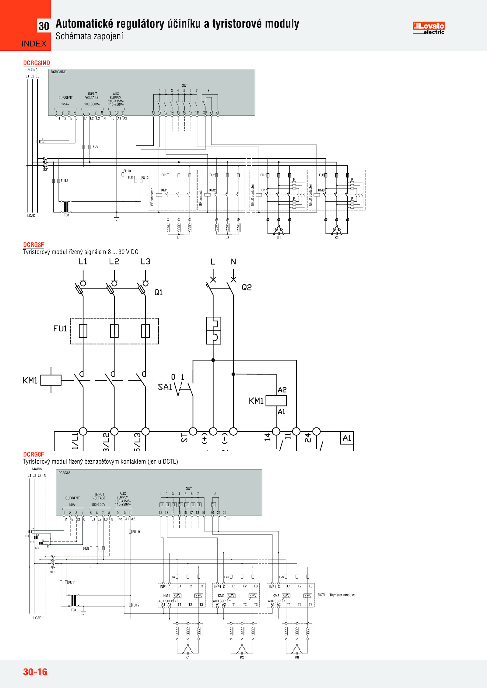 DC DCRG8IND L3 FU2 L2 R R K2 FU8 R R FU9 L1 L2 MAINS FU7 FU11 FU12 FU10 TC1 K1 QS1 LOAD FU13 8 7 22 20 21 18 6 5 4 3 1 2 SUPPLY AUX 17 16 15 14 12 7 13 6 5 11 9 4 10 100-600V~ INPUT VOLTAGE 3 DCRG8IND CURRENT 2 1 8 110-250V= 100-415V~ 1/5A~ OUT S2 S1 C I3 I2 I1 L3 L2 L1 A2 nc A1 N BF. Thyristor modules L3 L1 L2 MAINS N CT1 LOAD S2 S1 S1 S1 CT2 CT3 QS1 FU11 TC1 FU9 FU10 FU12 SUPPLY AUX 110-250V= 100-415V~ 100-600V~ INPUT VOLTAGE CURRENT 1/5A~ DCRG8F 7 6 5 11 9 4 10 3 2 1 8 C I3 I2 I1 L3 L2 L1 A2 nc A1 N 8 7 6 5 4 3 1 2 22 20 21 18 17 16 15 14 12 19 13 nc OUT L1 L3 T1 T3 AUX SUPPLY A1 A2 KM1 INP1 L3 T1 T3 AUX SUPPLY A1 A2 KM2 INP1 L3 T1 T3 AUX SUPPLY A1 A2 KM8 INP1 C K1 K8 DCRG8F Tyristorový modul řízený signálem ......30-16 Automatické regulátory účiníku tyristorové moduly Schémata zapojení 30 DCRG8F Tyristorový modul řízený beznapěťovým kontaktem (jen DCTL) DCTL..K contactor BF contactor FU1 L1 BF contactor KM7 KM8 KM2 KM1 ,1'(; ..K contactor BF.