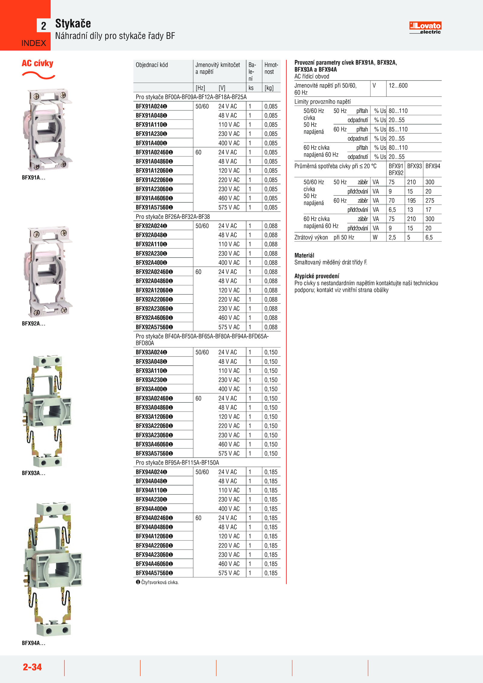 Provozní parametry cívek BFX91A, BFX92A,