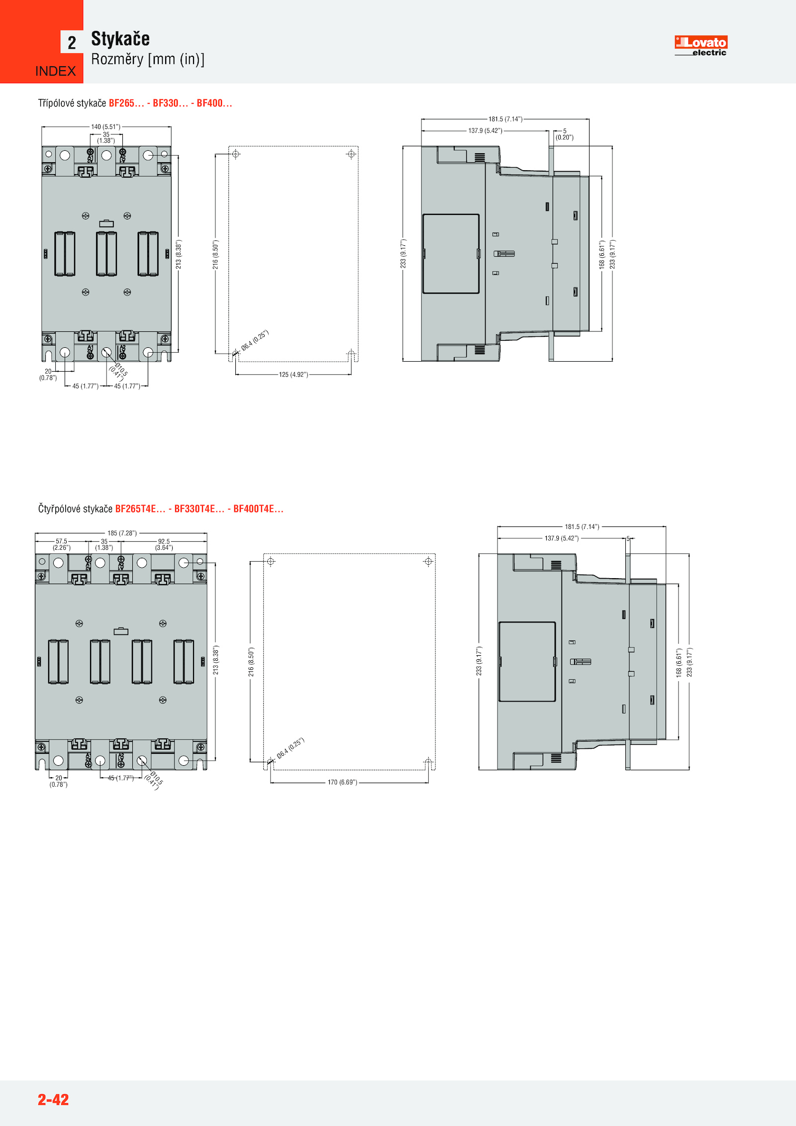 2-42 Stykače Rozměry [mm (in)] 2 Třípólové stykače BF265.17”) 181. BF400T4E.. Čtyřpólové stykače BF265T4E.77”) (1.61”) 233 (9.26”) 92.17”) 216 (8..42”) 5 (0.78”) 45 (1.4 (0.9 (5.61”) 233 (9.14”) 137.64”) 5 233 (9...9 (5..17”) 181.25”) 170 (6.92”) 213 (8..20”) 168 (6. 4 1 ” ) 185 (7.. BF330. 4 1 ” ) 140 (5.38”) 20 (0.14”) 137. 5 ( 0 .5 (3. BF400.17”) 216 (8.50”) Ø6. 5 ( 0 .51”) 35 (1. BF330T4E.25”) 125 (4.5 (7.5 (2.42”) 168 (6. 233 (9.38”) 20 (0.69”) 213 (8..77”) Ø 1 0 ..77”) Ø 1 0 .78”) 45 (1.28”) 35 (1..38”) INDEX .4 (0.50”) Ø6..5 (7..38”) 57