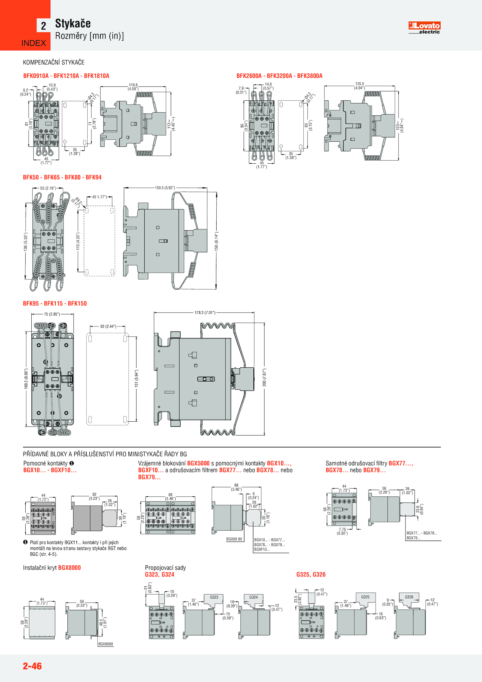 . 1 7 ” ) 110 (4.38”) 10. con BGX80 00 BGX8000 58 (2.57”) 7..2 (6. INDEX .43”) 6. BGX77.5 (5. 44 (1. con G325, G326 G325 G326 23...92”) 156 (6.35”) 150... 4-5)..46”) 10 (0.59”) 12 (0. 1 7 ” ) 35 (1.01”) 151 (5..47”) 9 (0..9 (0..02”) 23.73”) 82 (3..54”) Ø 4 . BGFX.20”) 26 (1.28”) 88 (3.47”) G325, G326 BG. BGX50 00 88 (3. nebo BGX79.46”) 58 (2.94”) 200 (7.38”) 80 (3...18”) Propojovací sady G323, G324 G323 G324 21 (0. BGXF10. 2 ( 0 . nebo BGX78. BGX77.., BGX79..6 (0..46”) 12 (0..91”) Vzájemné blokování BGX5000 pomocnými kontakty BGX10..9 (0.39”) 37 (1., BGXF10. BGX10.92”) 12 (0.15”) 123~ (4.35”) 16 (0..59”) BFK2600A BFK3200A BFK3800A BFK26 00A BFK32 00A 45 (1...77”) Ø 4 .83”) 10 (0.02”) 58 (2.16”) 136 (5..75 (0..77”) 14.79”) 81 (3..46”) 26 (1...47”) 37 (1.73”) 58 (2. BGX78... BGX78..8 (0.5 (4.2 (0..2-46 Stykače Rozměry [mm (in)] 2 BFK95 BFK115 BFK150 169.73”) 59 (2.5 (0.84”~) 125.39”) 15 (0.32”) 48.63”) Instalační kryt BGX8000 BG.87”) 75 (2.94”) KOMPENZAČNÍ STYKAČE BFK50 BFK65 BFK80 BFK94 45 1.24”) 71 (2., BGX78.. BGXF10..2 (7.., BGX78.45”~) 116..28”) 30 (1...23”) 26 (1.77”) Ø 4 . 1 7 ” ) 35 (1.94”) Platí pro kontakty BGX11.6 (4. 2 ( 0 . BGX10.66”) 62 (2. BGX79..95”) BFK0910A BFK1210A BFK1810A 45 (1.14”) PŘÍDAVNÉ BLOKY PŘÍSLUŠENSTVÍ PRO MINISTYKAČE ŘADY BG Pomocné kontakty BGX10. BGX77.5 (1.28”) 44 (1.. kontakty při jejich montáži levou stranu sestavy stykače BGT nebo BGC (str.19”) 113~ (4...44”) 178. 44 (1.....30”) 56 (2... odrušovacím filtrem BGX77. 2 ( 0 ..02”) 30 (1..18”) 6 (0.28”) 7... BGX79..33”) 55 (2. nebo BGX79.31”) 90 (3..24”) Samotné odrušovací filtry BGX77