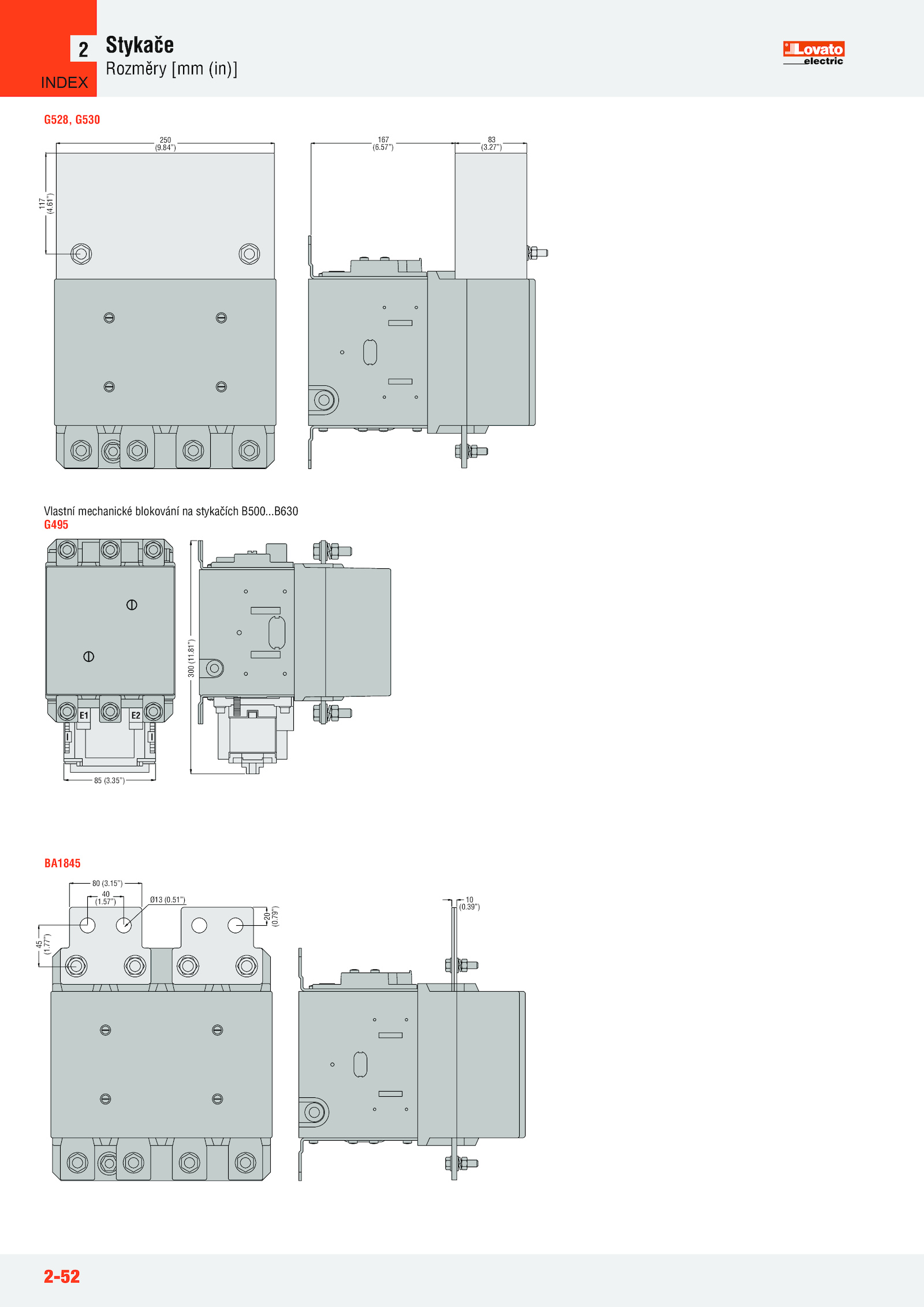 61”) 83 (3.35”) 300 (11.79”) BA1845 CONTATTORE TIPO A B250 B400 255 B500 B630 300 G495 G495 85 (3.35”) 300 (11.27”) G528, G530 G528, G530 G528, G530 10 (0.77”) 20 (0.57”) Ø13 (0..84”) 167 (6.2-52 Stykače Rozměry [mm (in)] 2 250 (9.51”) 45 (1.81”) E1 E2 Vlastní mechanické blokování stykačích B500..39”) 80 (3.15”) 40 (1.81”) E1 E2 CONTATTORE TIPO A B250 B400 255 B500 B630 300 G495 G495 85 (3.57”) 117 (4.B630 G495 INDEX