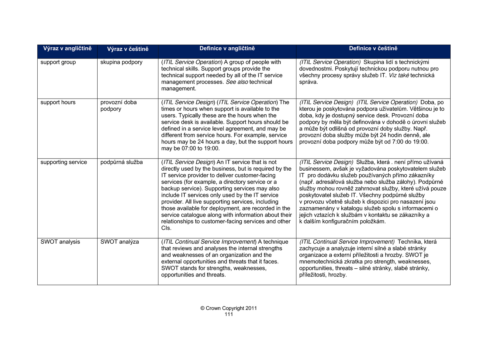 Ashleymu Hanna (HP), který jej aktualizoval v červenci 2011.Naše díky také patří všem, kdo přispěli ke klíčovým publikacím ITIL ve vydáních 2007 a 2011. Kompletní seznam autorů je uveden na: www.itilofficialsite.com/Publications/PublicationAcknowledgements.aspxJsme take velmi vděční Miroslavu Sedláčkovi za vedení projektu překladu výkladového slovníku do češtiny a následujícím expertům týmu prozajištění kvality:Jiřímu Hudcovi (itSMF CZ) – překlad změn, dodatků a formální úpravy textu, editaceVladimíru Kufnerovi (HP) – proofreading a odborné posouzení terminologie.Rovněž tak zmiňujeme pionýrskou práci týmu publikačního výboru itSMF Czech, jenž v roce 2008 vytvořil první kompletní překlad první verzevýkladového slovníku ITIL, a tak významně přispěl ke kodifikaci odborné terminologie ITIL v češtině.Na překladu a revizi se v letech 2007 a 2008 podíleliIvan Volný – vedoucí týmu překladatelůLenka Volná TichavskáLudmila VráželováTáňa SýkorováJaromír ŠveřepaAntonín SládekPetr NavrátilĽubomír LukáčJiří HudecŠtěpán JarochVladimír Kufner – odborná revize.