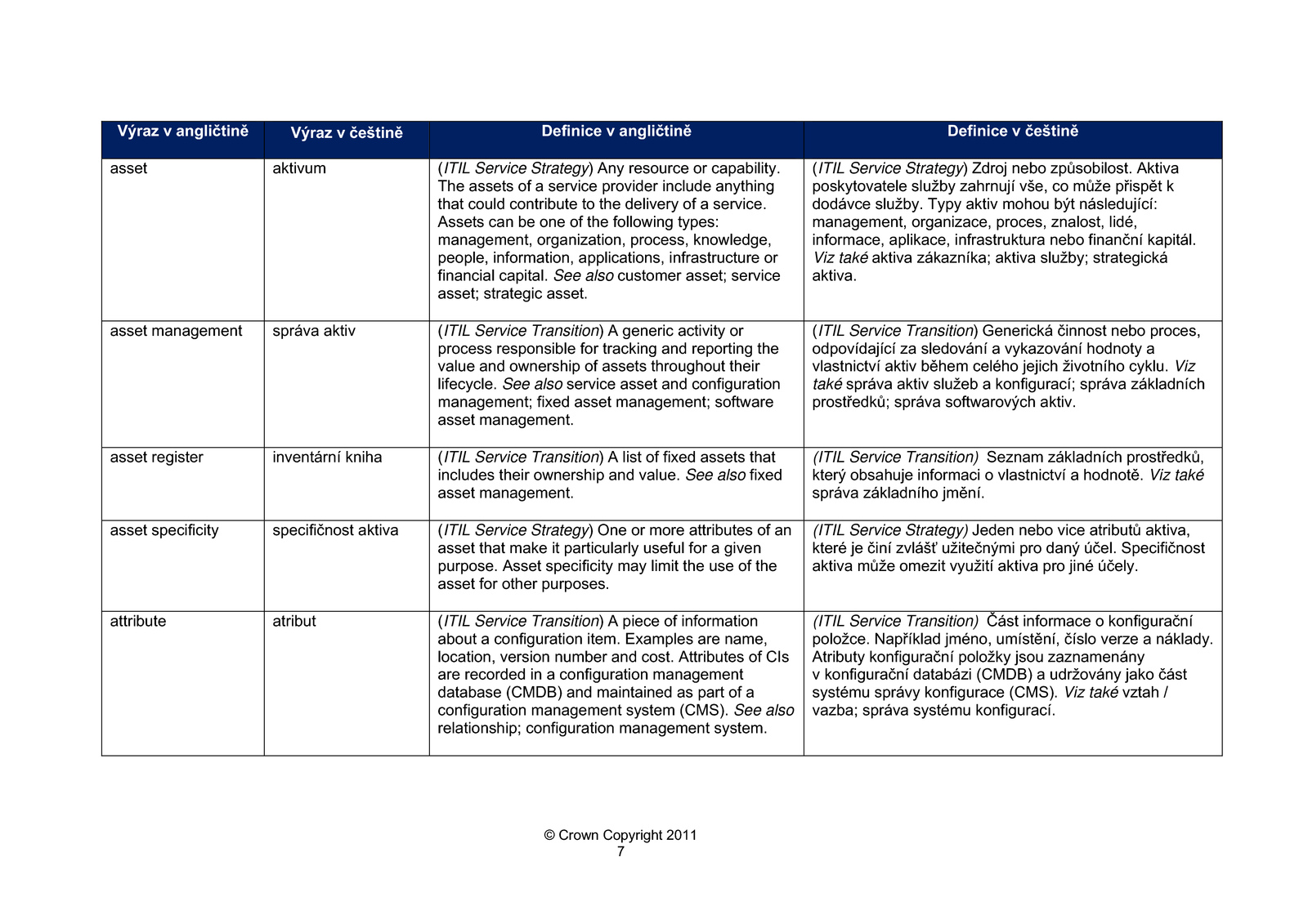 Ashleymu Hanna (HP), který jej aktualizoval v červenci 2011.Naše díky také patří všem, kdo přispěli ke klíčovým publikacím ITIL ve vydáních 2007 a 2011. Kompletní seznam autorů je uveden na: www.itilofficialsite.com/Publications/PublicationAcknowledgements.aspxJsme take velmi vděční Miroslavu Sedláčkovi za vedení projektu překladu výkladového slovníku do češtiny a následujícím expertům týmu prozajištění kvality:Jiřímu Hudcovi (itSMF CZ) – překlad změn, dodatků a formální úpravy textu, editaceVladimíru Kufnerovi (HP) – proofreading a odborné posouzení terminologie.Rovněž tak zmiňujeme pionýrskou práci týmu publikačního výboru itSMF Czech, jenž v roce 2008 vytvořil první kompletní překlad první verzevýkladového slovníku ITIL, a tak významně přispěl ke kodifikaci odborné terminologie ITIL v češtině.Na překladu a revizi se v letech 2007 a 2008 podíleliIvan Volný – vedoucí týmu překladatelůLenka Volná TichavskáLudmila VráželováTáňa SýkorováJaromír ŠveřepaAntonín SládekPetr NavrátilĽubomír LukáčJiří HudecŠtěpán JarochVladimír Kufner – odborná revize.