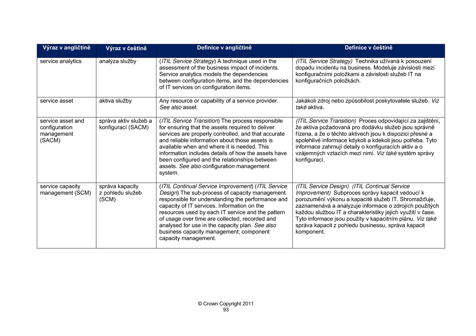Ashleymu Hanna (HP), který jej aktualizoval v červenci 2011.Naše díky také patří všem, kdo přispěli ke klíčovým publikacím ITIL ve vydáních 2007 a 2011. Kompletní seznam autorů je uveden na: www.itilofficialsite.com/Publications/PublicationAcknowledgements.aspxJsme take velmi vděční Miroslavu Sedláčkovi za vedení projektu překladu výkladového slovníku do češtiny a následujícím expertům týmu prozajištění kvality:Jiřímu Hudcovi (itSMF CZ) – překlad změn, dodatků a formální úpravy textu, editaceVladimíru Kufnerovi (HP) – proofreading a odborné posouzení terminologie.Rovněž tak zmiňujeme pionýrskou práci týmu publikačního výboru itSMF Czech, jenž v roce 2008 vytvořil první kompletní překlad první verzevýkladového slovníku ITIL, a tak významně přispěl ke kodifikaci odborné terminologie ITIL v češtině.Na překladu a revizi se v letech 2007 a 2008 podíleliIvan Volný – vedoucí týmu překladatelůLenka Volná TichavskáLudmila VráželováTáňa SýkorováJaromír ŠveřepaAntonín SládekPetr NavrátilĽubomír LukáčJiří HudecŠtěpán JarochVladimír Kufner – odborná revize.