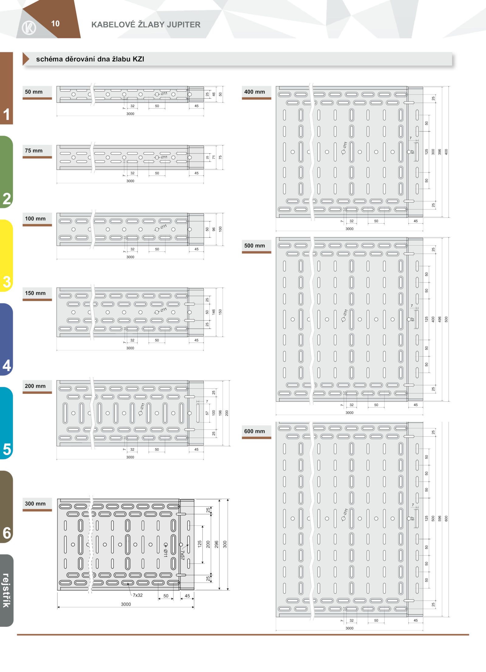 KABELOVÉ ŽLABY JUPITER 10 1 50 mm 75 mm 100 mm 150 mm 200 mm 300 mm 400 mm 500 mm 600 mm schéma děrování dna žlabu KZI 2 3 4 5 6 rejstřík