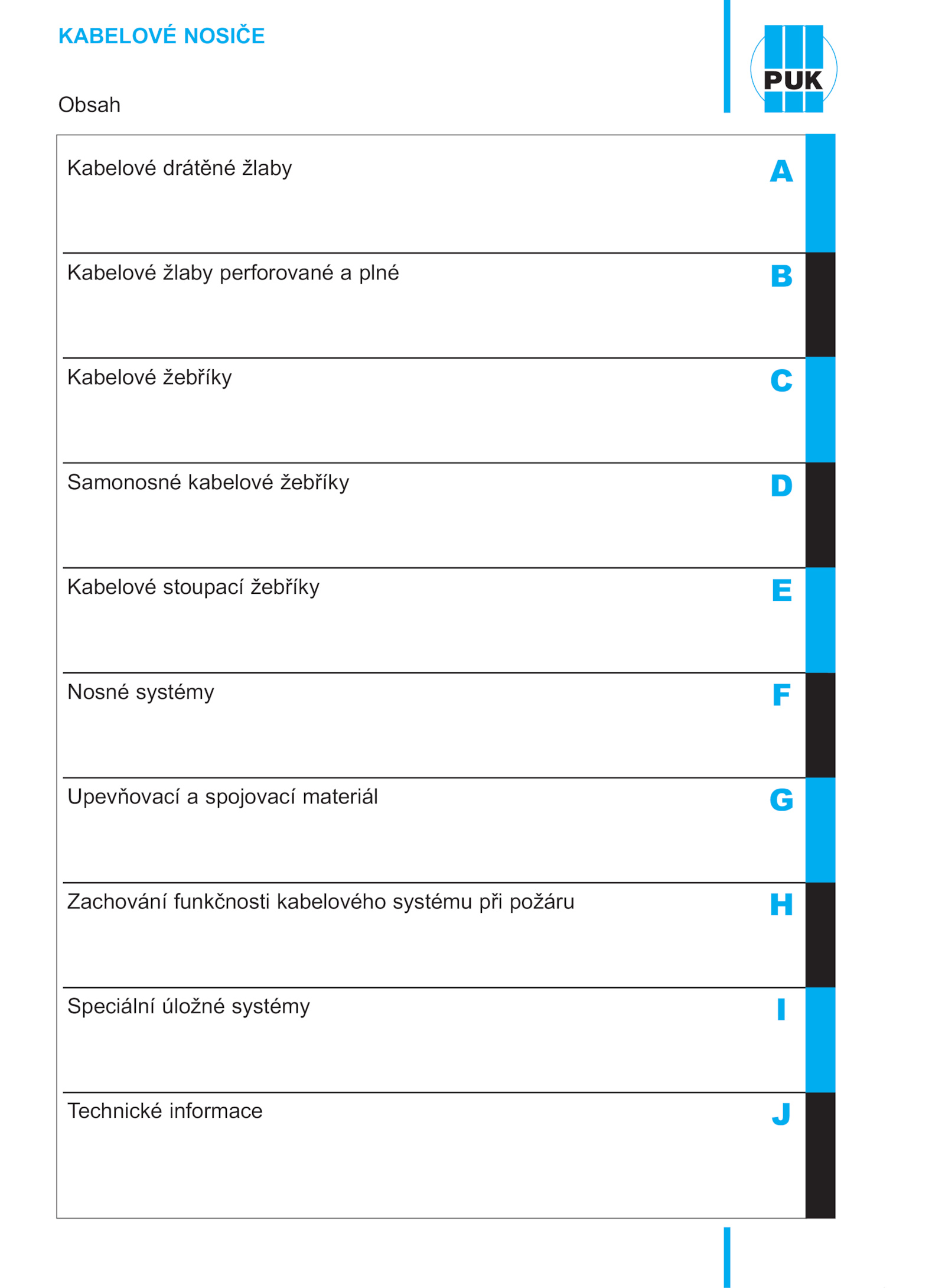 Kabelové drátěné žlaby Kabelové žlaby perforované plné Kabelové žebříky Samonosné kabelové žebříky Kabelové stoupací žebříky Nosné systémy Upevňovací spojovací materiál Zachování funkčnosti kabelového systému při požáru Speciální úložné systémy Technické informace A B C D E F G H I J KABELOVÉ NOSIČE Obsah